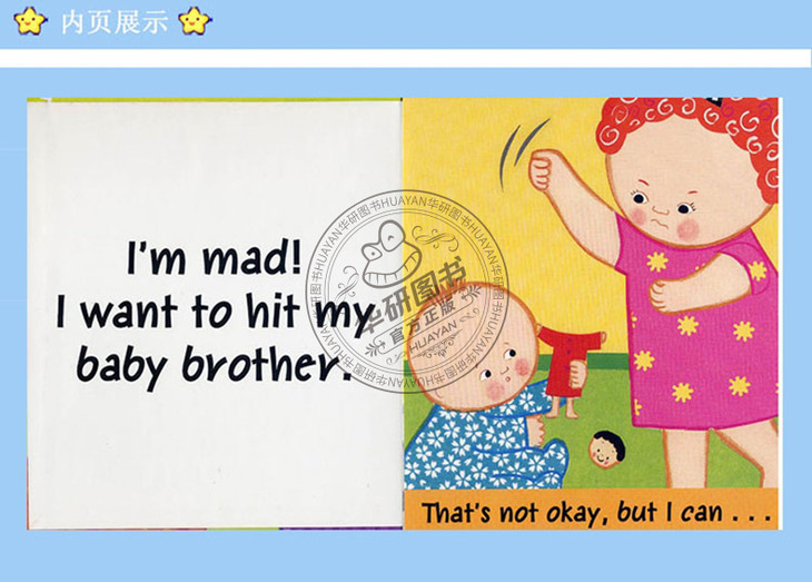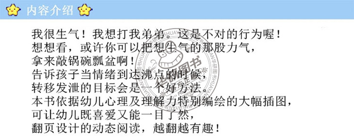 我很生气!我想打我弟弟。这是不对的行为喔!想想看,或许你可以把想生气的那股力气,拿来敲锅碗瓢盆啊!告诉孩子当情绪到达沸点的时候,转移发泄的目标会是一个好方法。