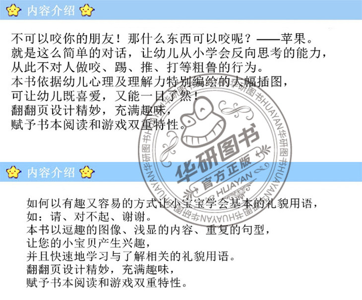 “这套书一开始看来,像是一套培养幼儿社会礼仪情感的绘本。但其实书中要表达的是对幼儿自我认知情感的培养。婴儿期,是儿童个性特征的萌芽期。这一时期是幼儿自我意识形成和发展的阶段,在此基础之上才会出现道德判断和道德行为。让孩子在保护自己应有权益不受侵害的同时,学习与人交往和尊重他人。”——新浪亲子频道主编艾樱