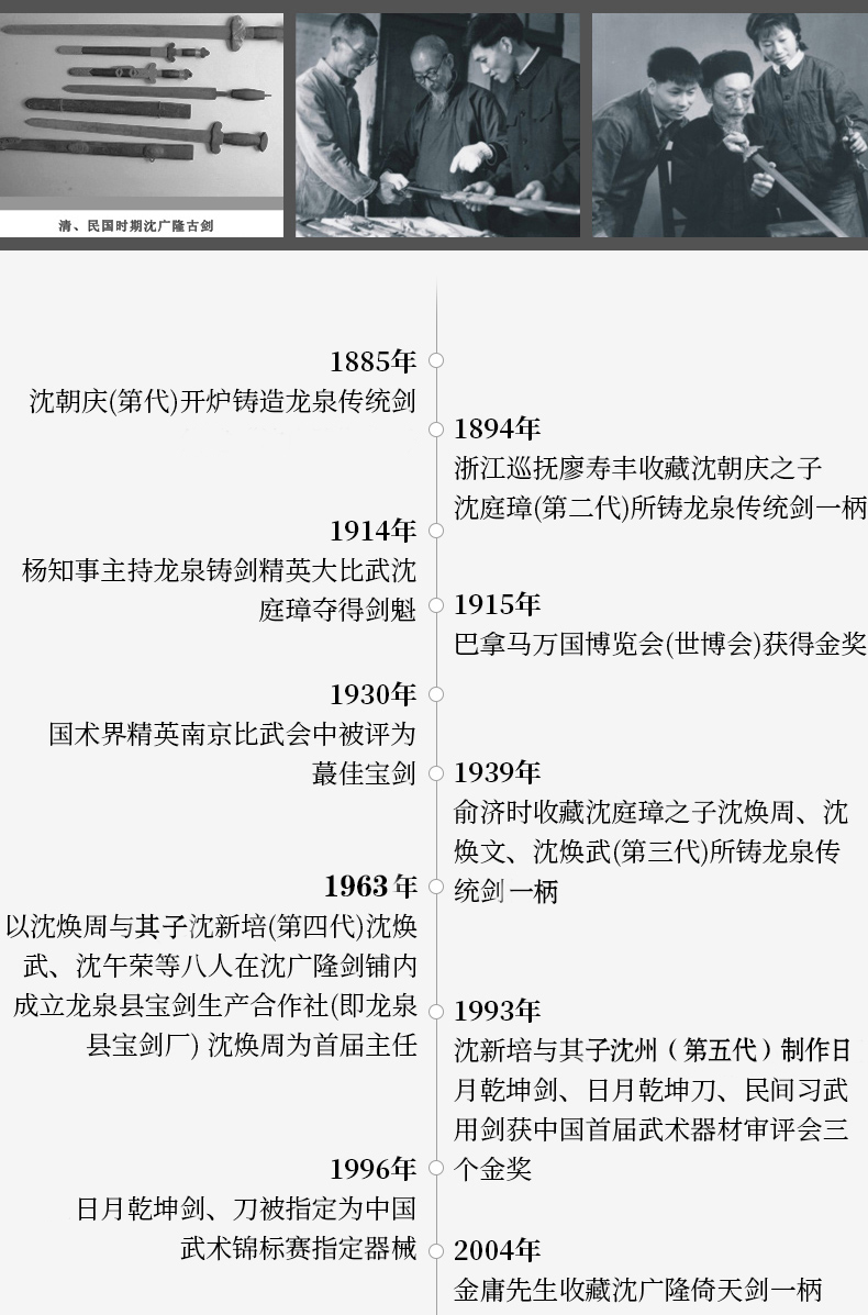 - 龙泉沈广隆剑舖创始于1885年(清光绪)位于浙江省龙泉市,是当地唯一一家“子承父业”一脉相承的中华老字号宝剑生产企业,是国家级非物质文化遗产龙泉宝剑项目保护单位,并以“天下第一剑”闻名于海内外....