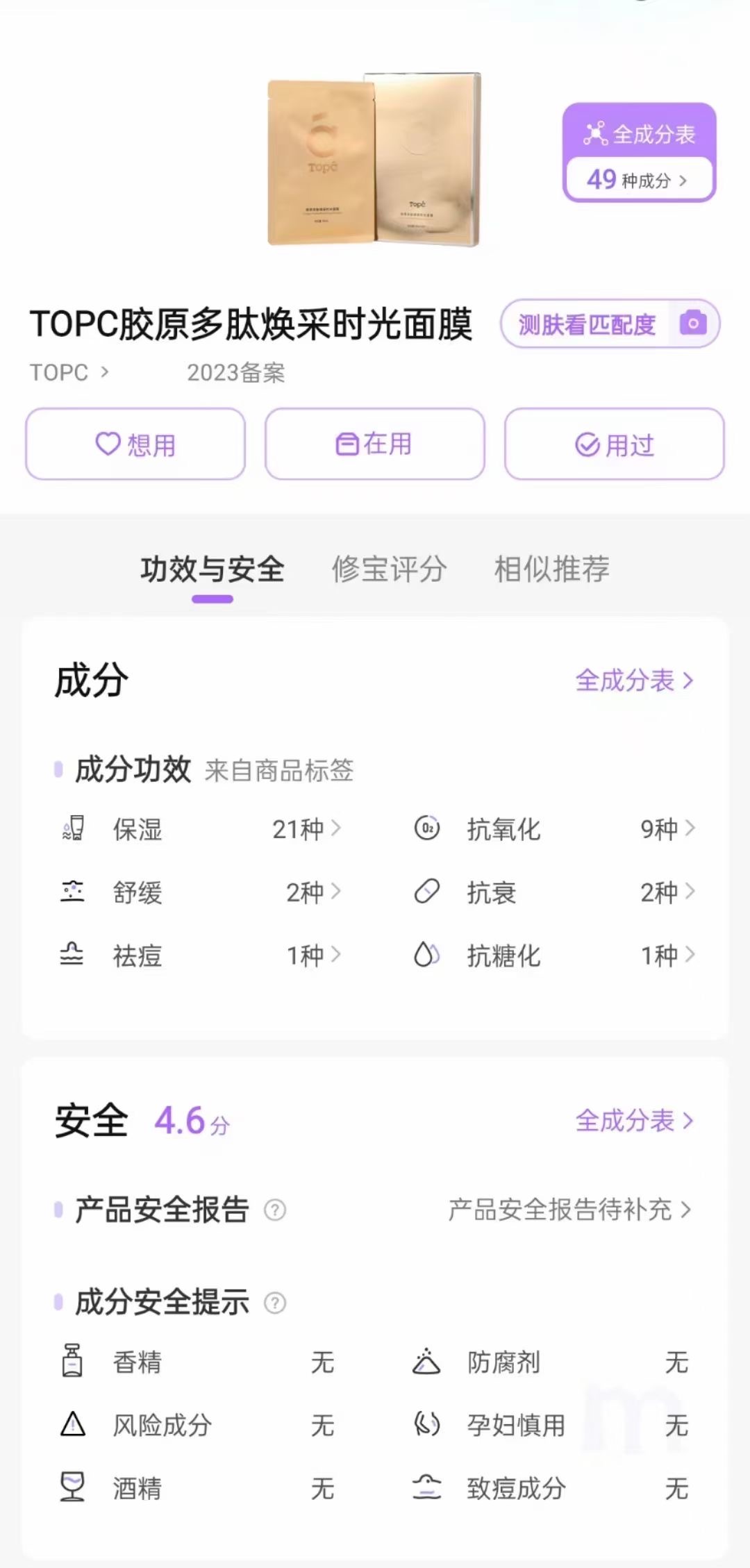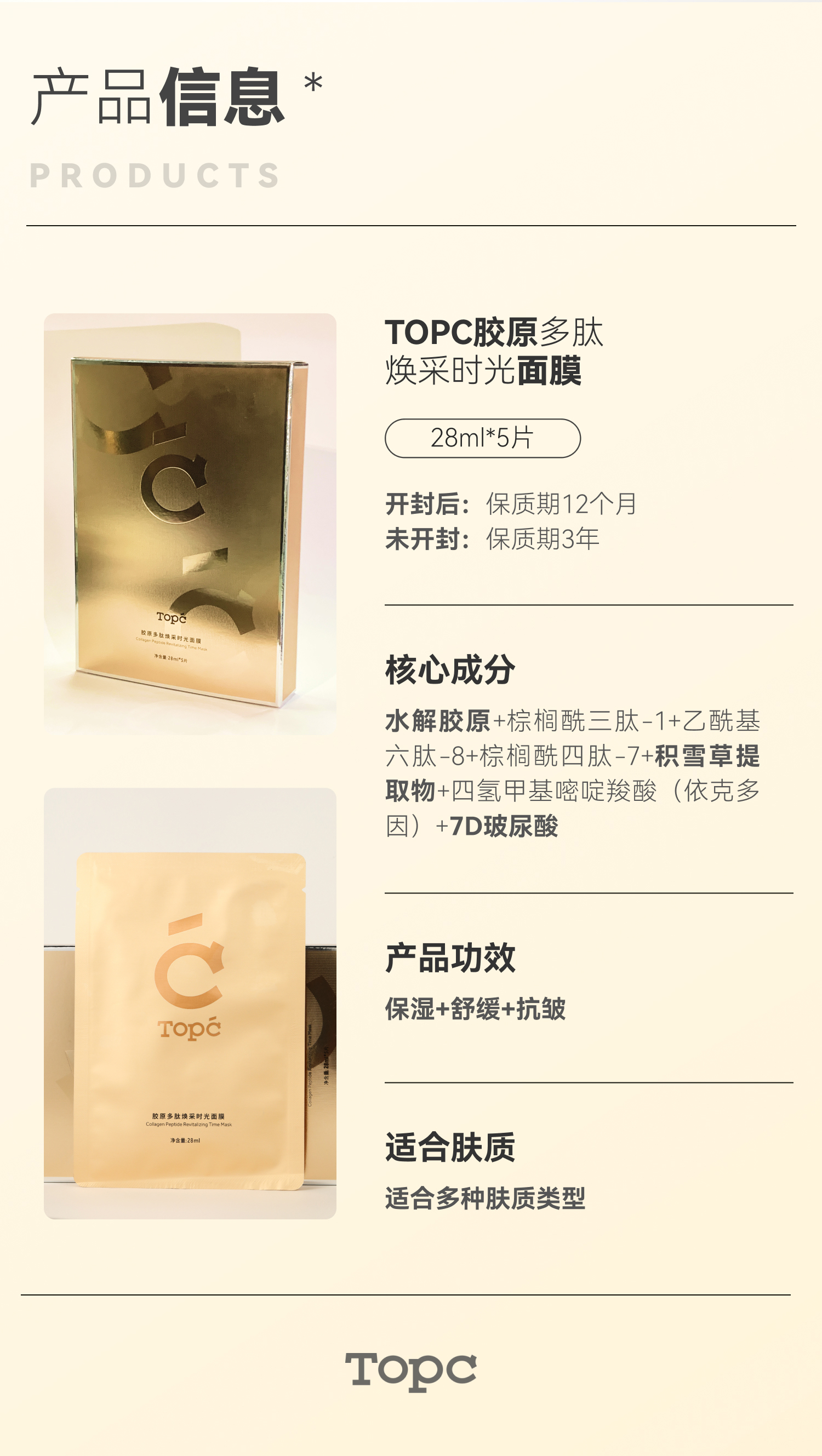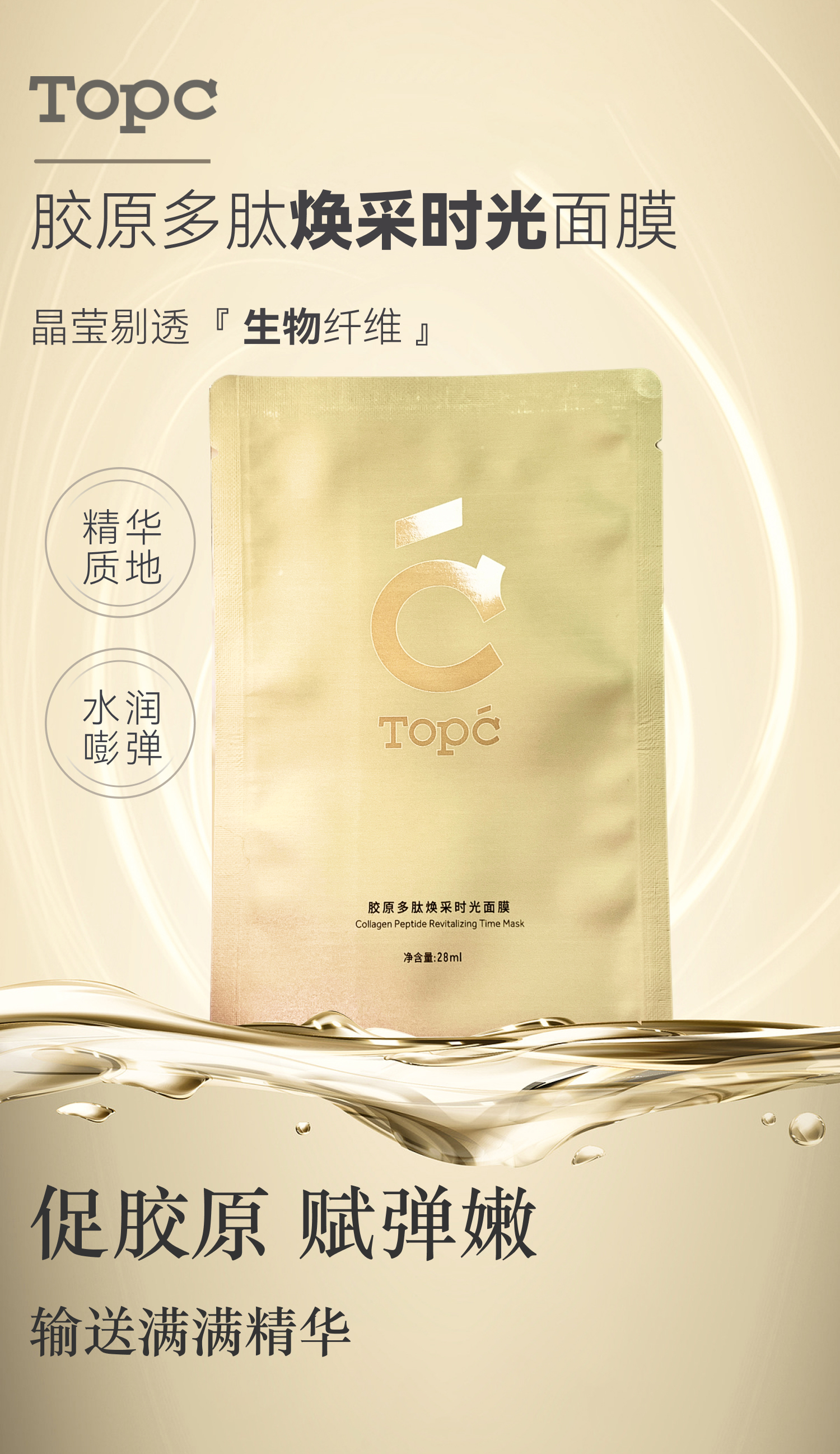 【TOPC胶原多肽焕采时光面膜】生物纤维面膜 精华质地,水润嘭弹 甄选植物成分 三重胜肽kang皱 植物萃取成分舒缓保湿 7D玻尿酸层层渗透 专利膜布