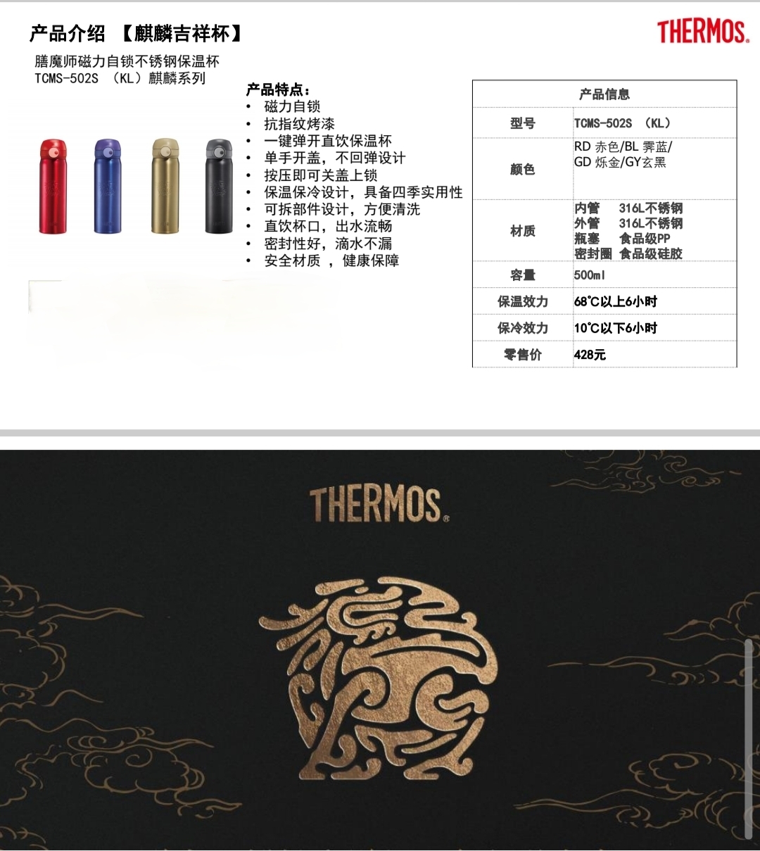 10楼 膳魔师 膳魔师麒麟保温杯吊牌价428元 活动价259元