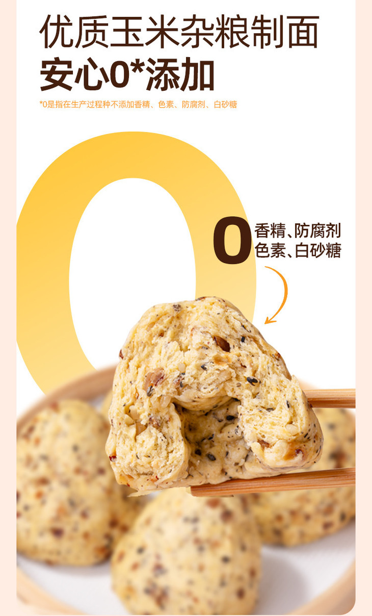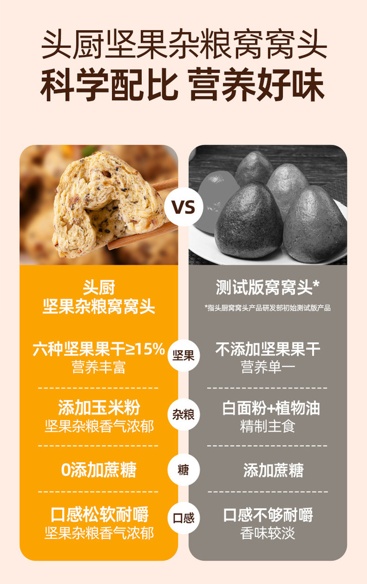 头厨家的坚果杂粮窝窝头,和一般的杂粮窝窝头很不一样!是有加五种坚果与果干的,每一种都蕴含着丰富的营养与独特的食用功效。新疆核桃,壳薄肉厚,含油量高,不仅口感香醇,还富含Omega-3脂肪酸,有助于促进大脑发育,还能帮助增强记忆力;新疆灰枣,被誉为“天然维生素丸”,富含维生素C和多种矿物质,补血养颜;安庆黑芝麻,药食两用,焦香温厚,富含不饱和脂肪酸、蛋白质及多种微量元素;越南腰果,口感酥脆,富含油脂和蛋白质,能补充能量,同时也有助于降低胆固醇;广东巴旦木,被誉为“干果之王”,富含蛋白质、膳食纤维及多种维生素,促进肠道健康,增强饱腹感。这些坚果与果干,与优质玉米粉完美结合,经过精细研磨与多次网筛,保留了玉米的细腻与营养,再通过老师傅们的手工捏制,赋予了窝窝头独特的口感与形状。吃起来既有坚果的香醇,又有杂粮的醇厚,让人回味无穷。而且,头厨坚果杂粮窝窝头的配料表真的很干净,无反式脂肪酸、无添加蔗糖,适合各年龄段人群。还特别采用了海藻糖代替蔗糖,既保留了清甜的口感,热量又仅为蔗糖的1/10左右,健身减脂人都能放心吃哦!