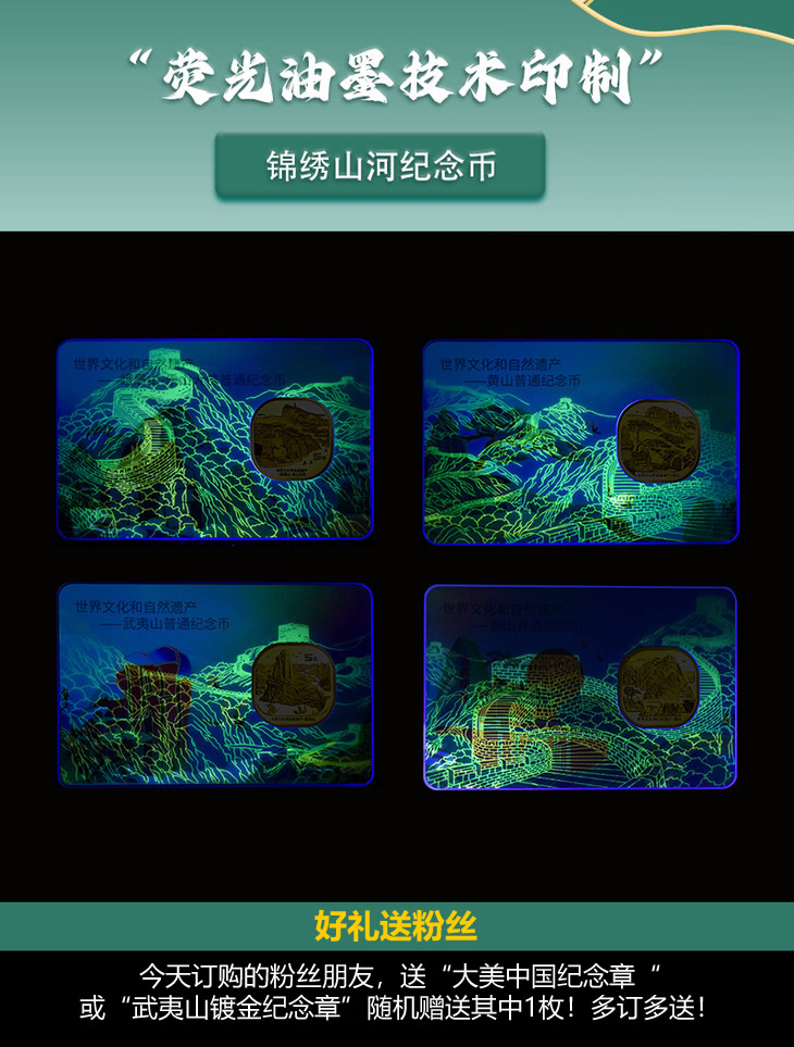 今天订购炫彩荧光卡大全套,就送“大美中国纪念章“”或“武夷山镀金纪念章”,随机赠送其中一枚!多订多送!
