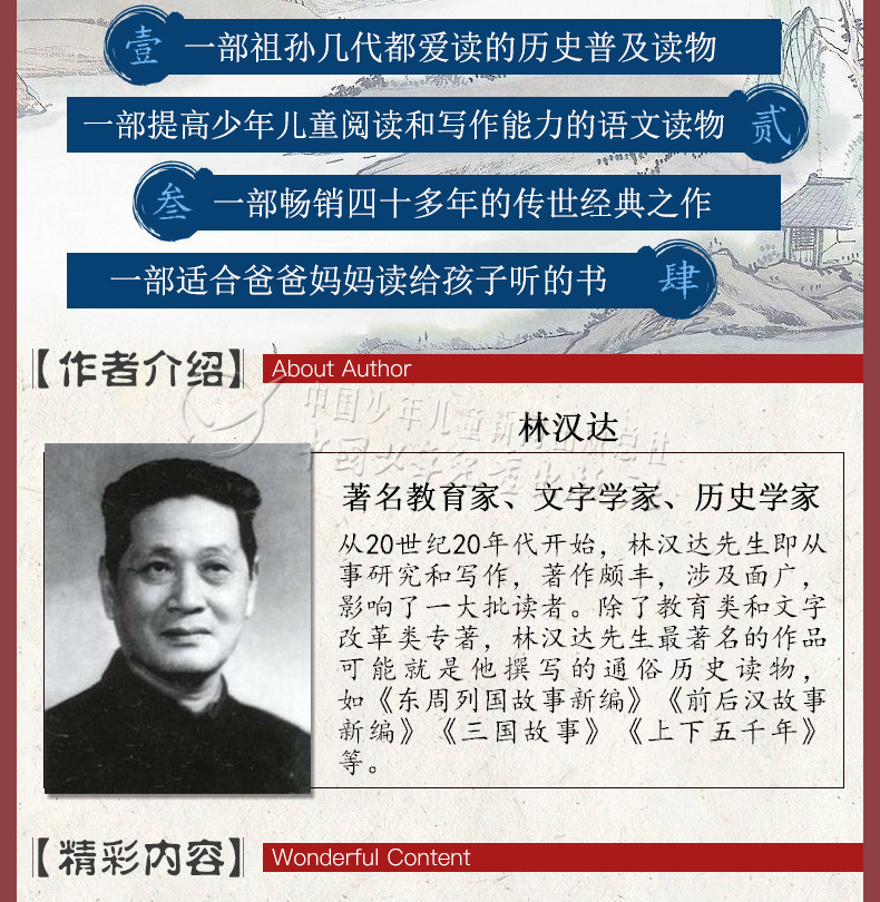 林先生编写历史故事有两个很大的特点。一是注意史实的准确。他写的历史故事跟演义小说不一样。演义小说虽然写得很生动,可其中有许多虚构的情节。他写历史故事着重于说明历史发展进程,又比较尊重历史事实,主要取材于《春秋》、《史记》、《汉书》、《后汉书》、《三国志》等“正史”。像《三国演义》中的“桃园结义”、“草船借箭”之类的故事,他都没有采用。二是文字的口语化。林先生是一位语言学家,对普通话有深入的研究。他是浙江宁波人,虽然只能说家乡的方言,可写起文章来,用的却是地道的普通话。这部书念起来很顺口,读着就跟听故事一个样,所以不但是