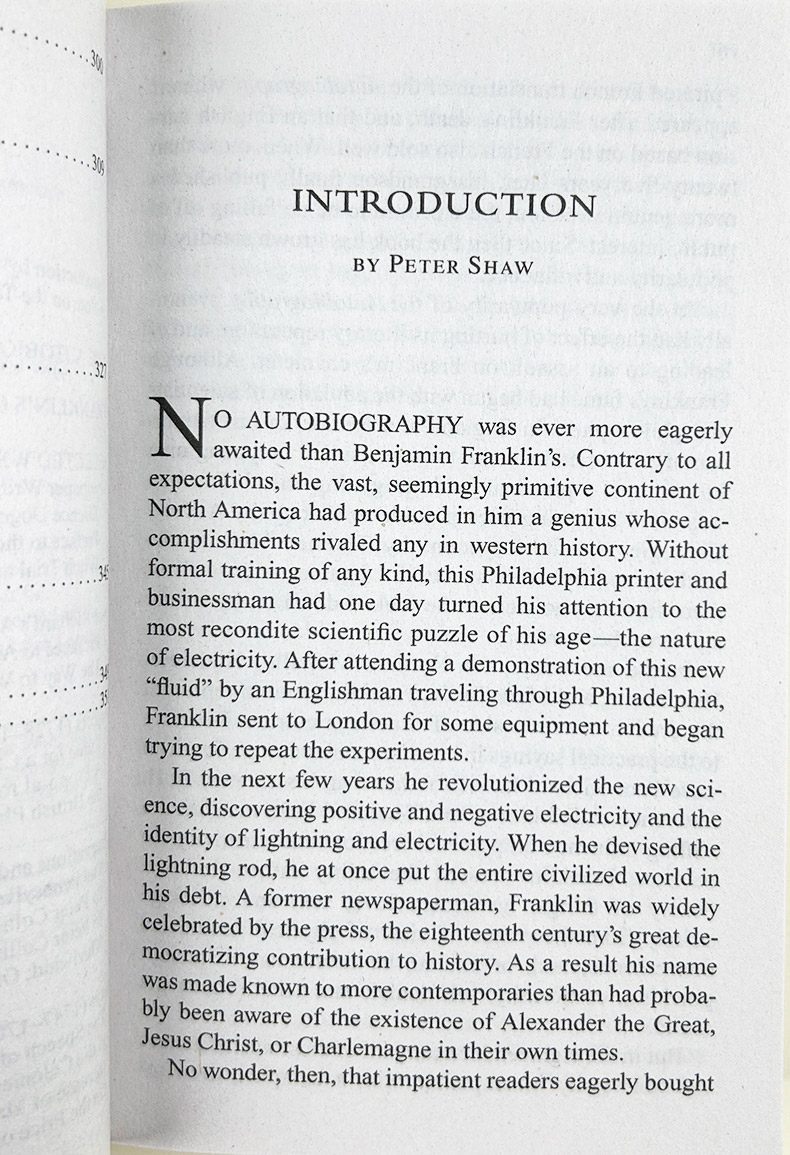 I have ever had pleasure in obtaining any little anecdotes of my ancestors. You may remember the inquiries I made among the remains of my relations when you were with me in England, and the journey I undertook for that purpose. Imagining it may be equally agreeable to you to know the circumstances of my life, many of which you are yet unacquainted with, and expecting the enjoyment of a week’s uninterrupted leisure in my present country retirement, I sit down to write them for you. To which I have besides some other inducements. Having emerged from the poverty and obscurity in which I was born and bred, to a state of affluence and some degree of reputation in the world, and having gone so far through life with a considerable share of felicity, the conducing means I made use of, which with the blessing of God so well succeeded, my posterity may like to know, as they may find some of them suitable to their own situations, and therefore fit to be imitated.