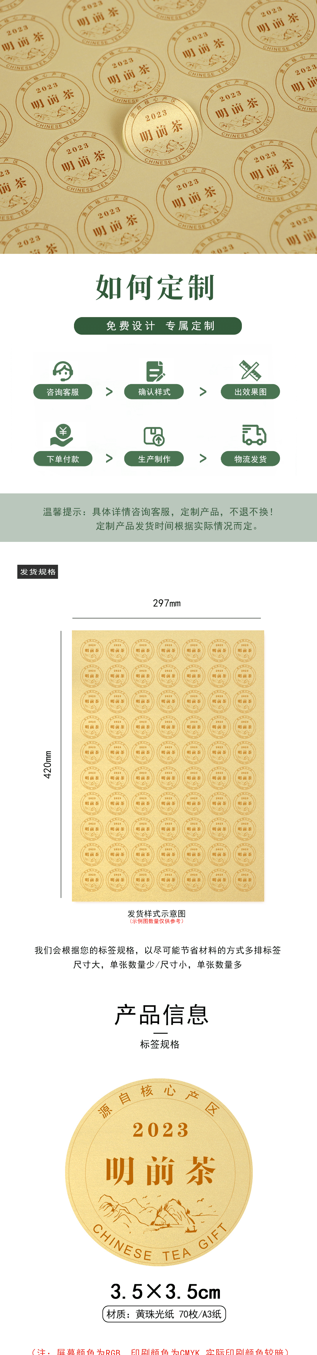 2025明前茶圆茶标黄色珠光纸一张 6元, 满300元河南省内包邮