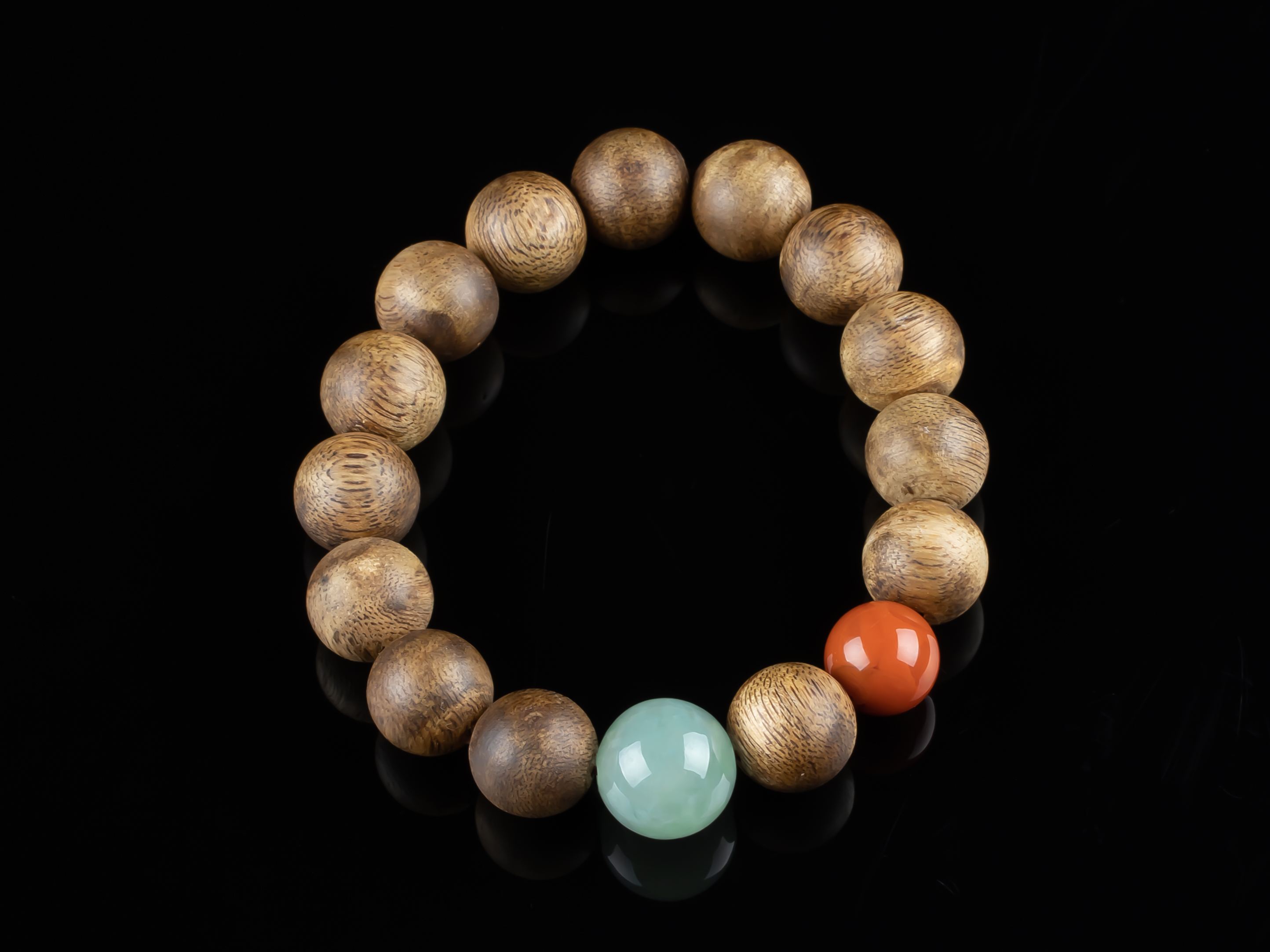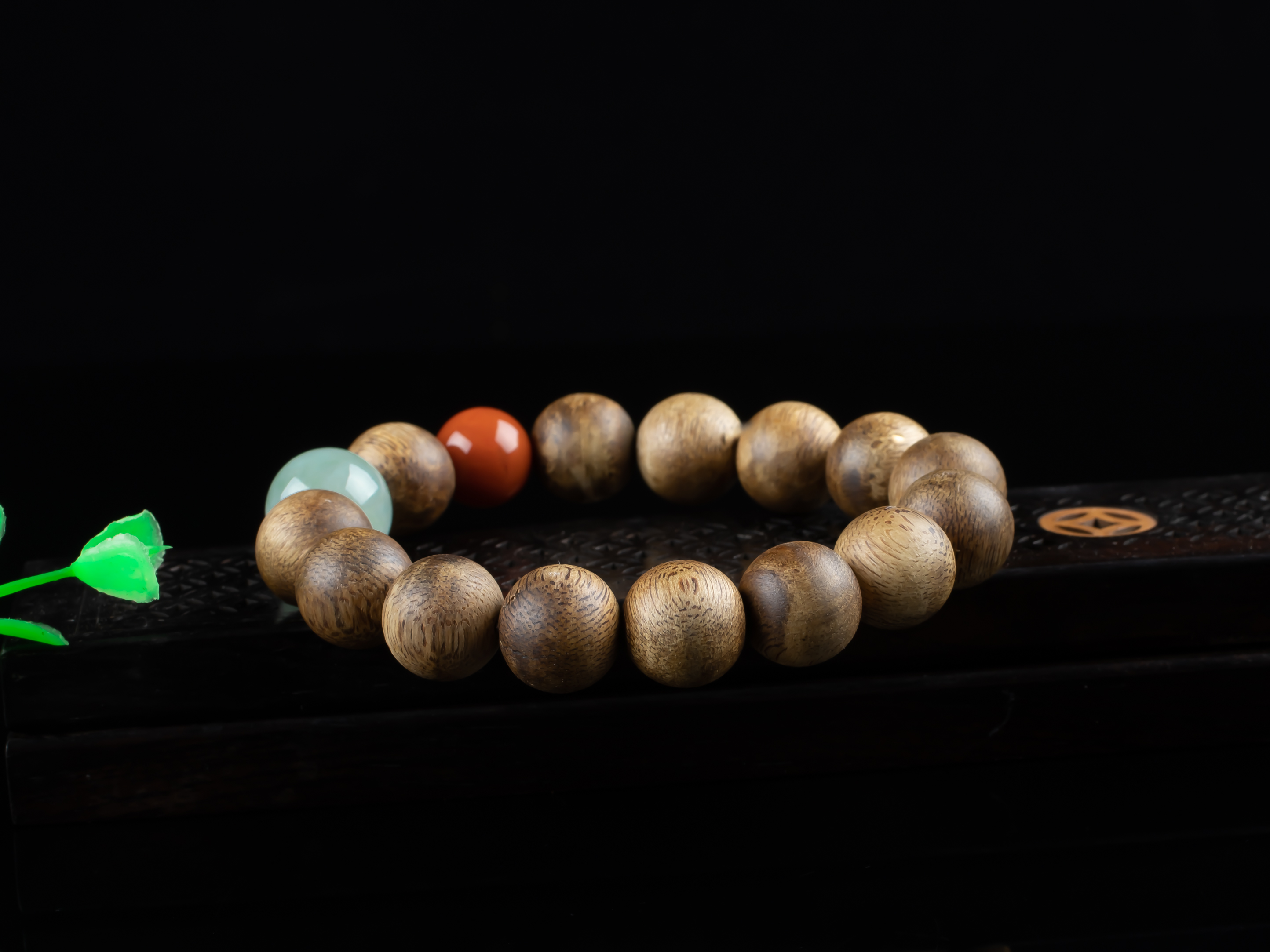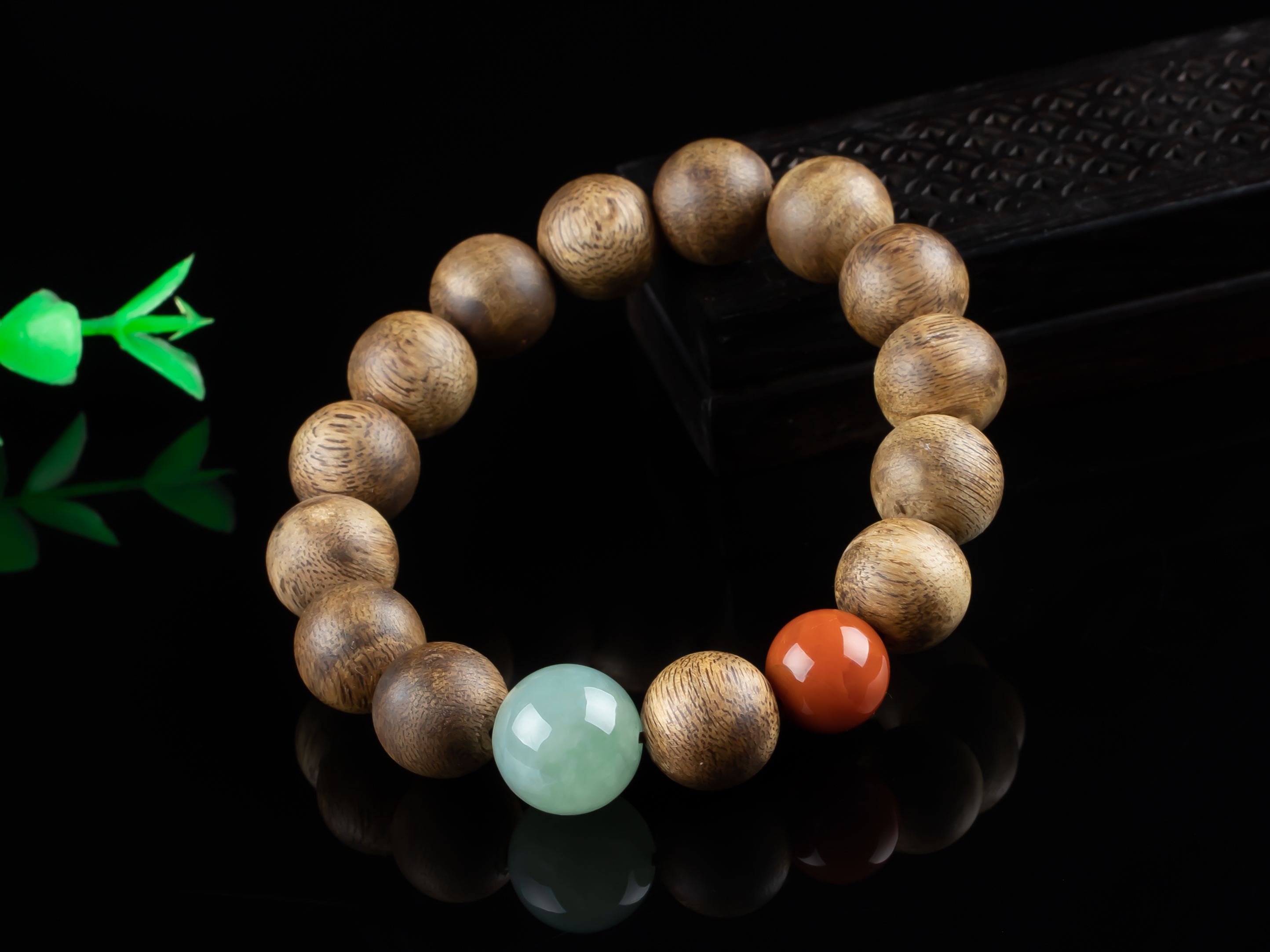 XY0150沉香非洲翠南红手串,天然沉香圆珠10mm,原色原味,香味清甜自然,配珠:非洲翠、南红。飘花的非洲翠与满肉色南红相互映衬,整体上手大气。