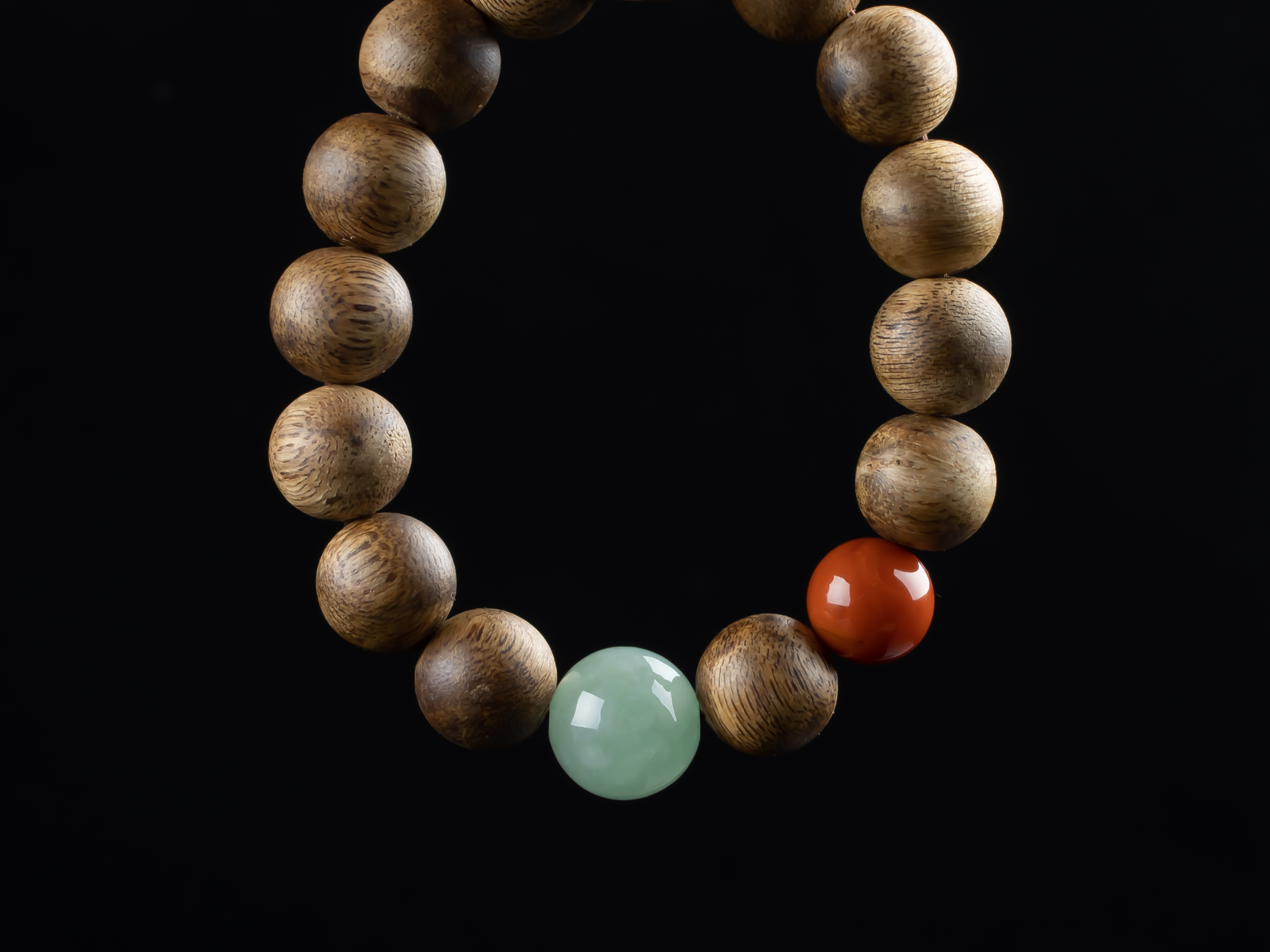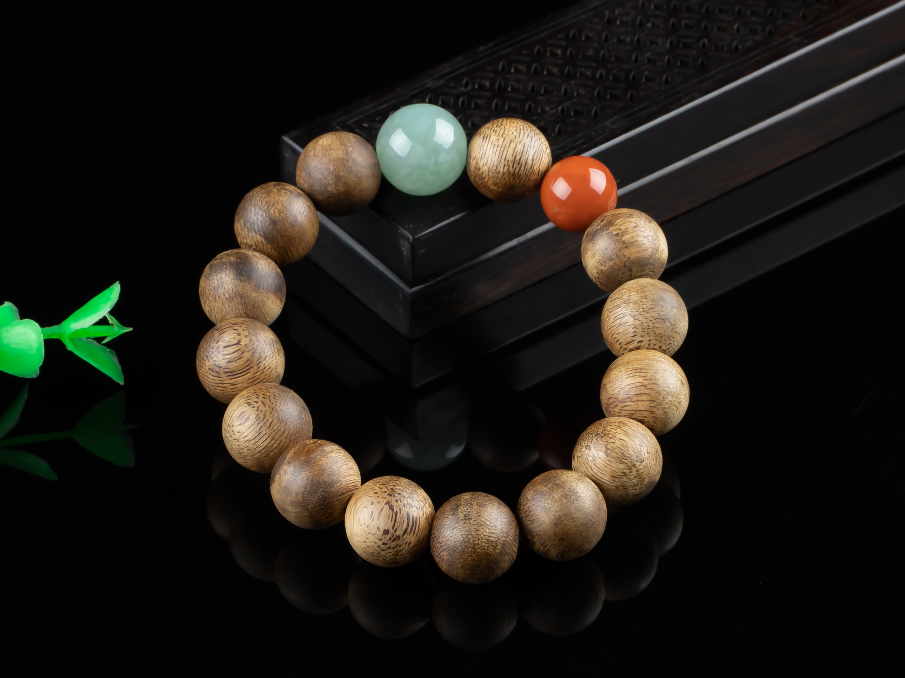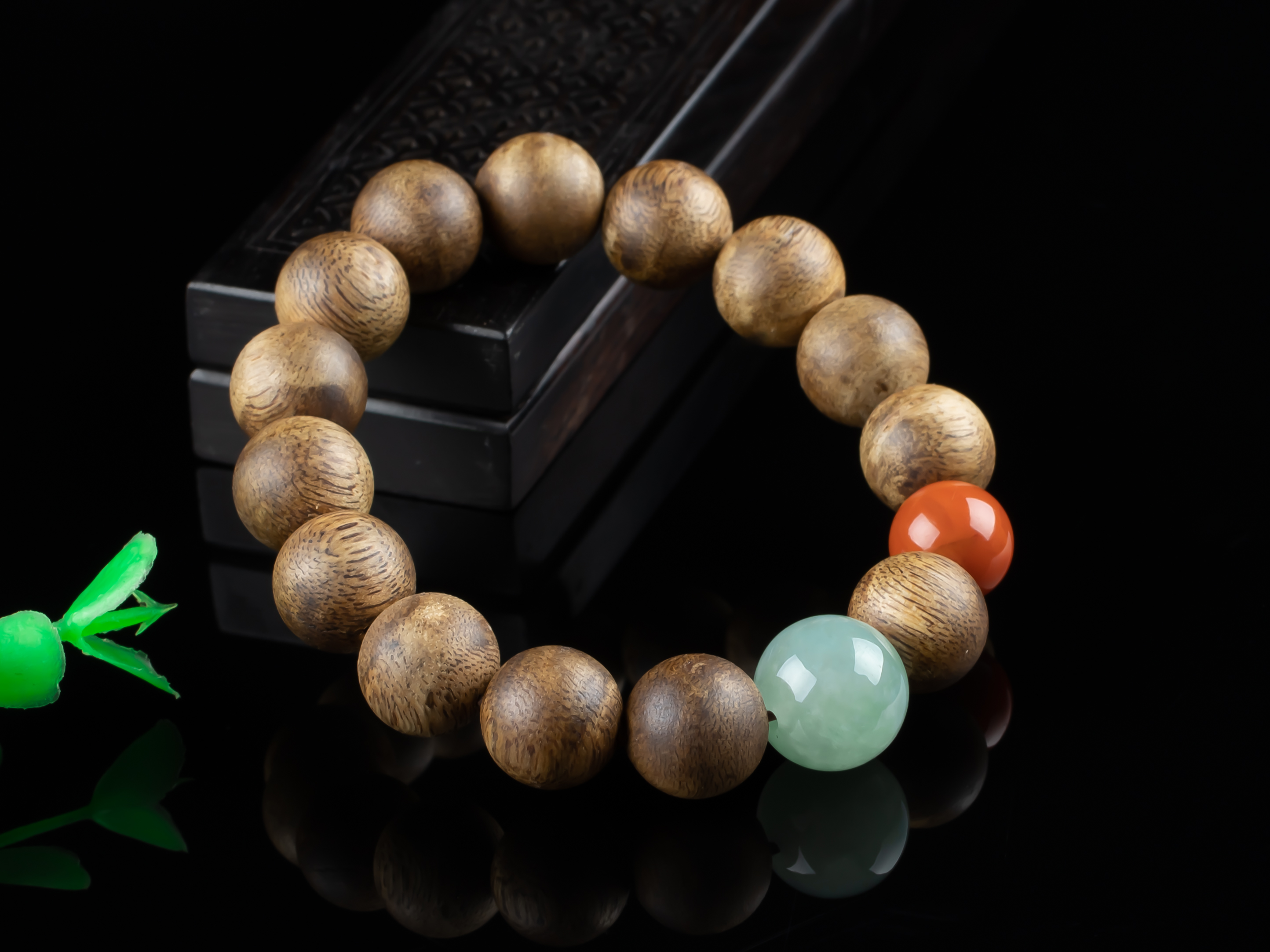 XY0150沉香非洲翠南红手串,天然沉香圆珠10mm,原色原味,香味清甜自然,配珠:非洲翠、南红。飘花的非洲翠与满肉色南红相互映衬,整体上手大气。