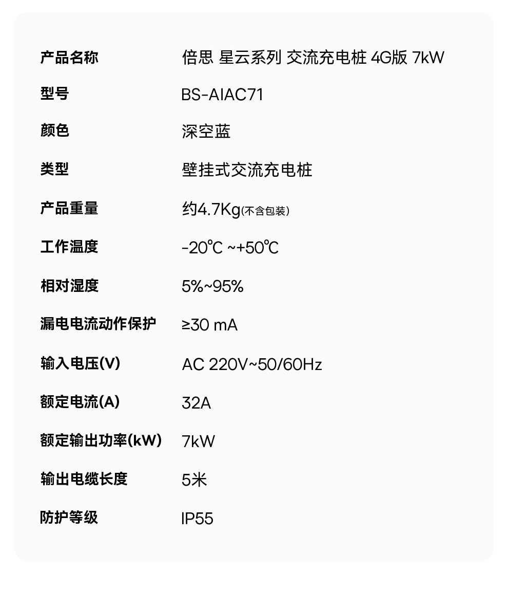 倍思 星云系列 交流充电桩 4G版 7kW 深空蓝