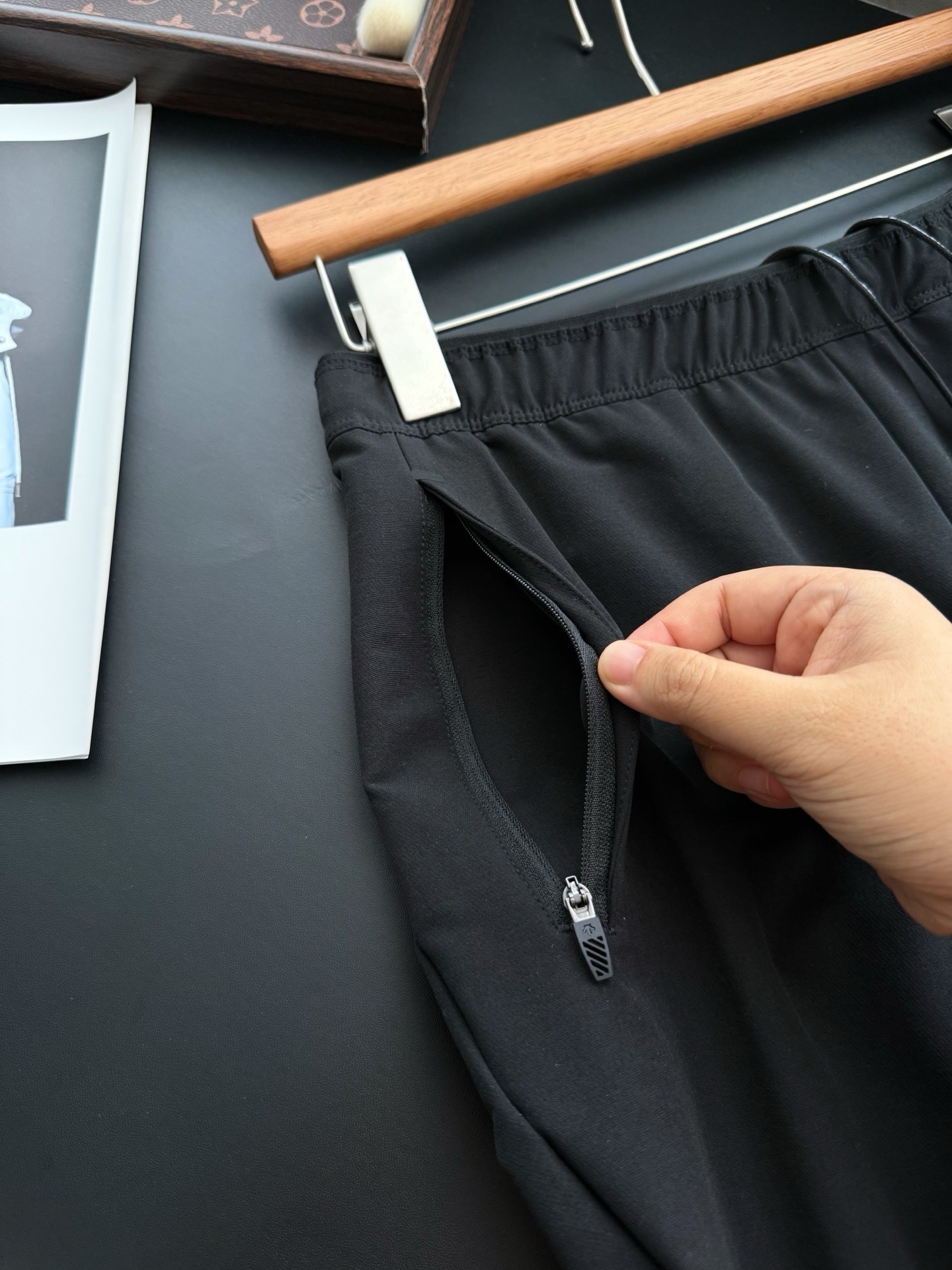 隐藏式拉链斜插口袋方便实用膝盖下方点缀立体压胶字母logo 更显品质!关于细节