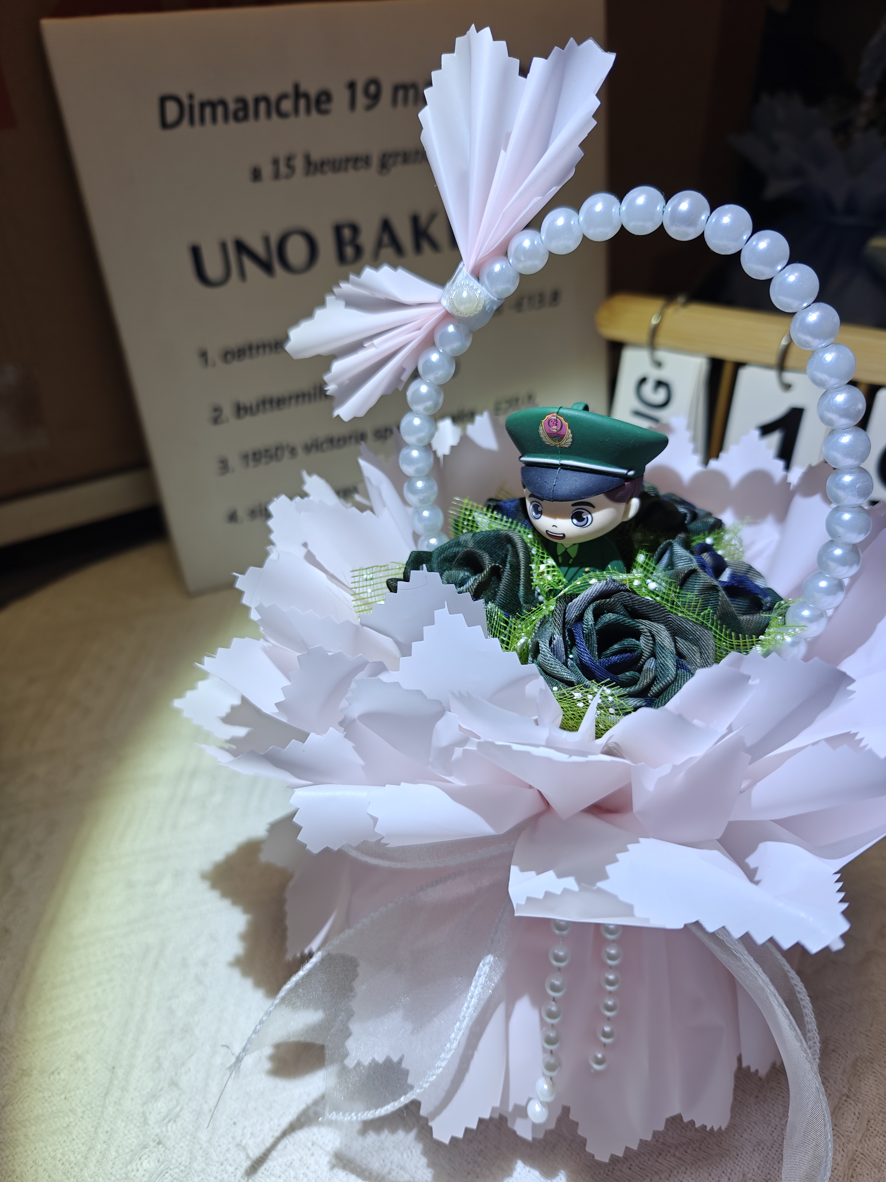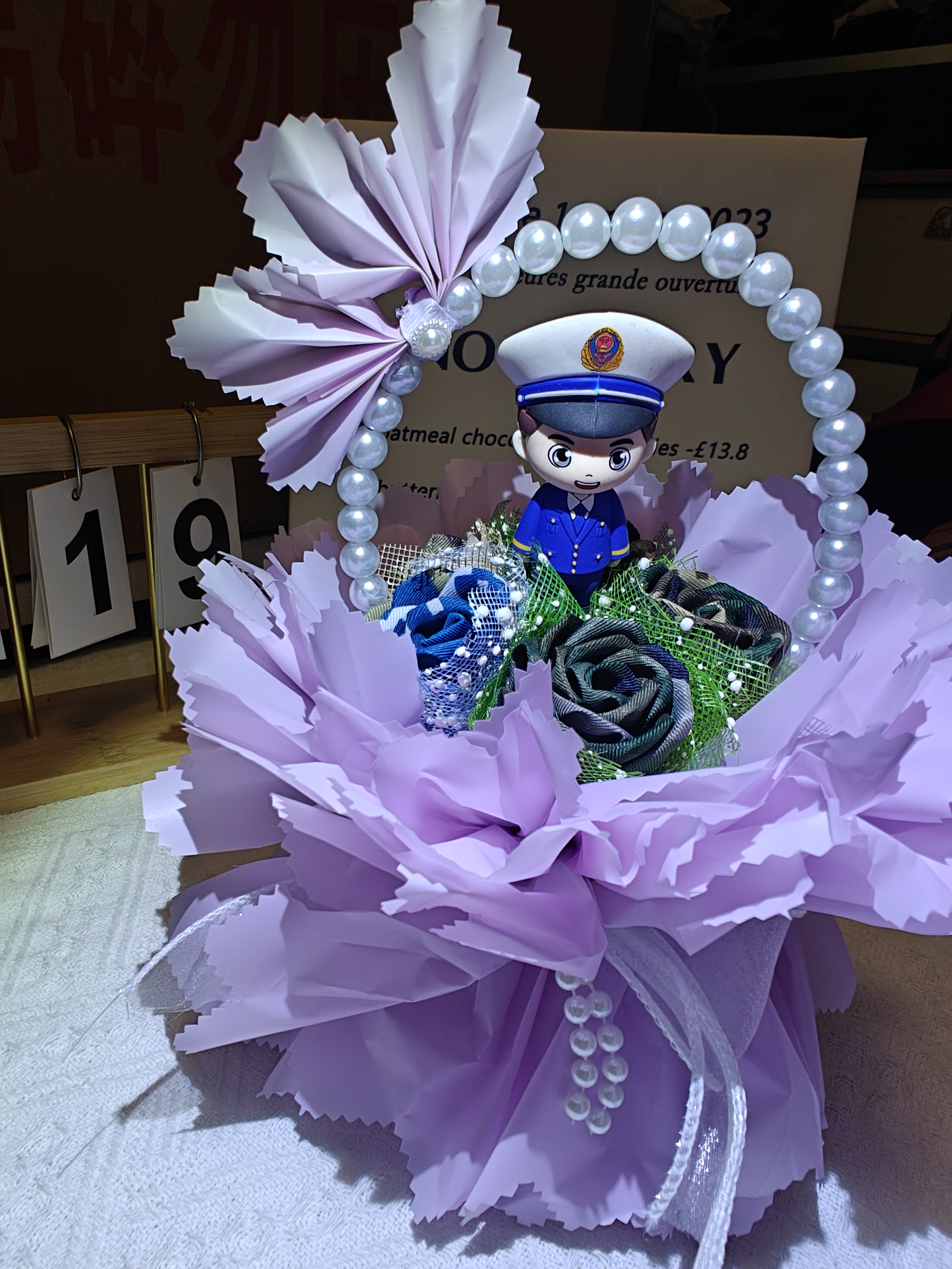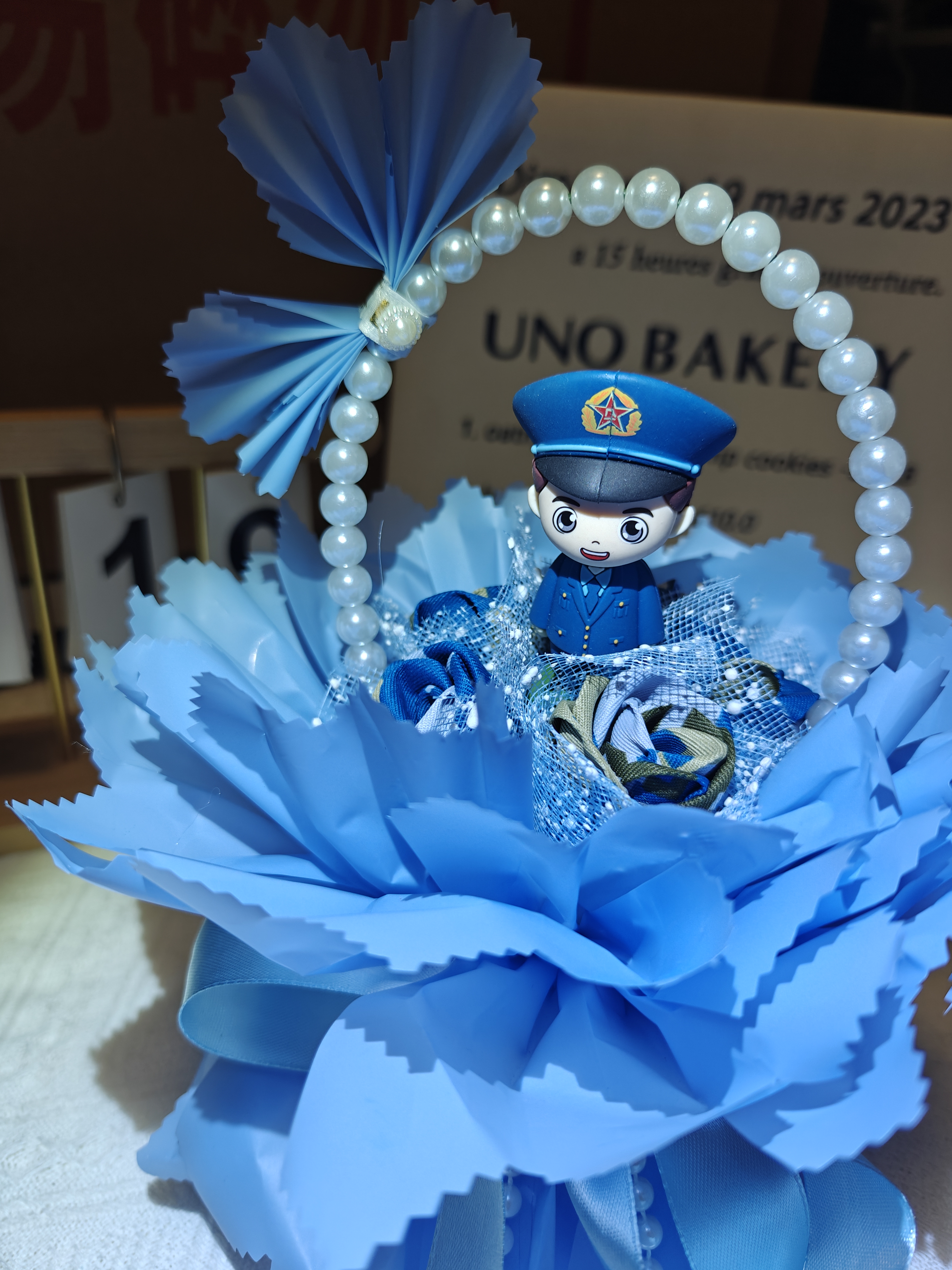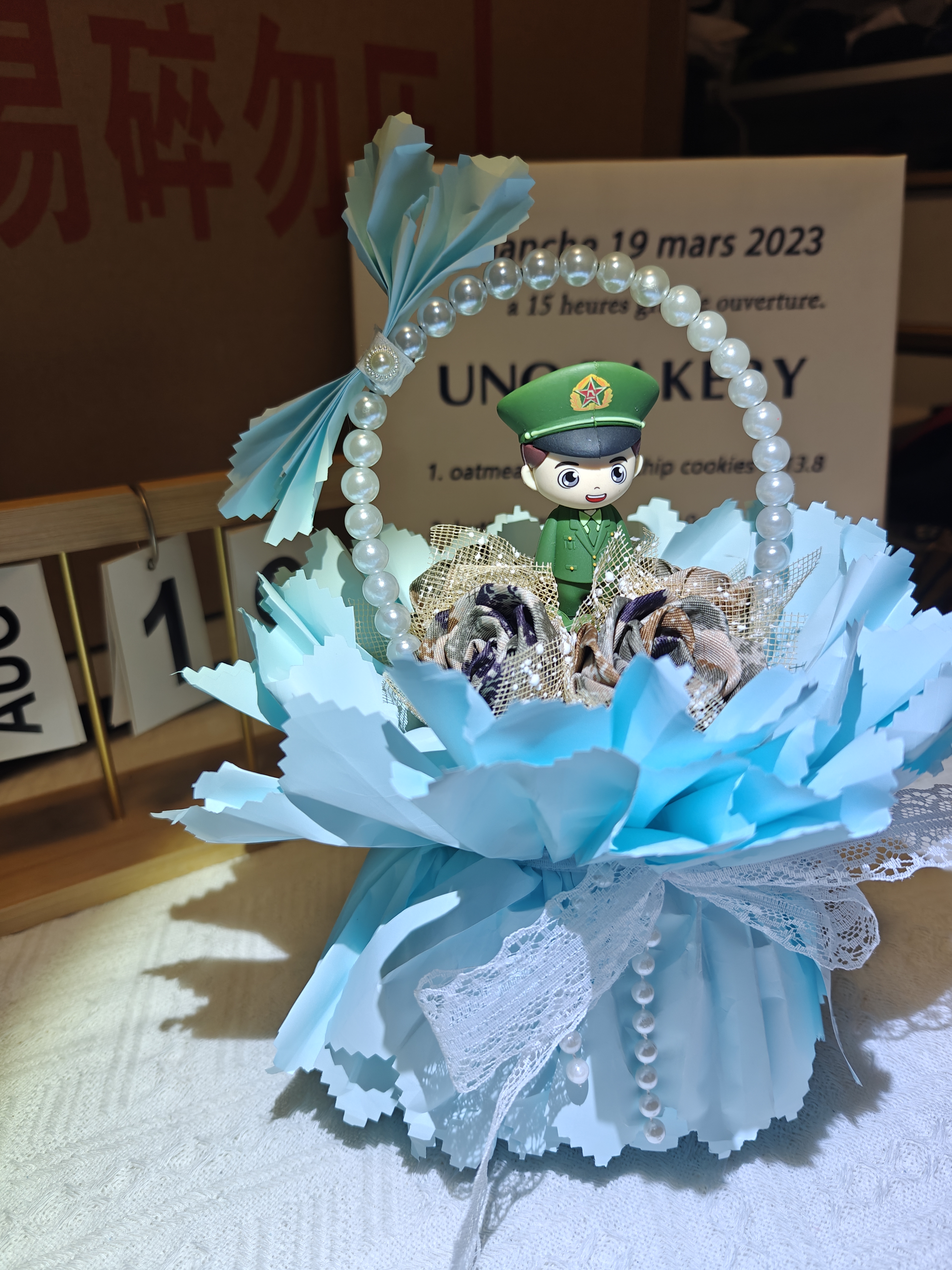 2、花束材质:花朵材质为涤纶迷彩布,一共5朵,花束是纯手工制作,所以每一朵都不同,可永久保存。拆开后不支持退货,不支持7天无理由退换货。