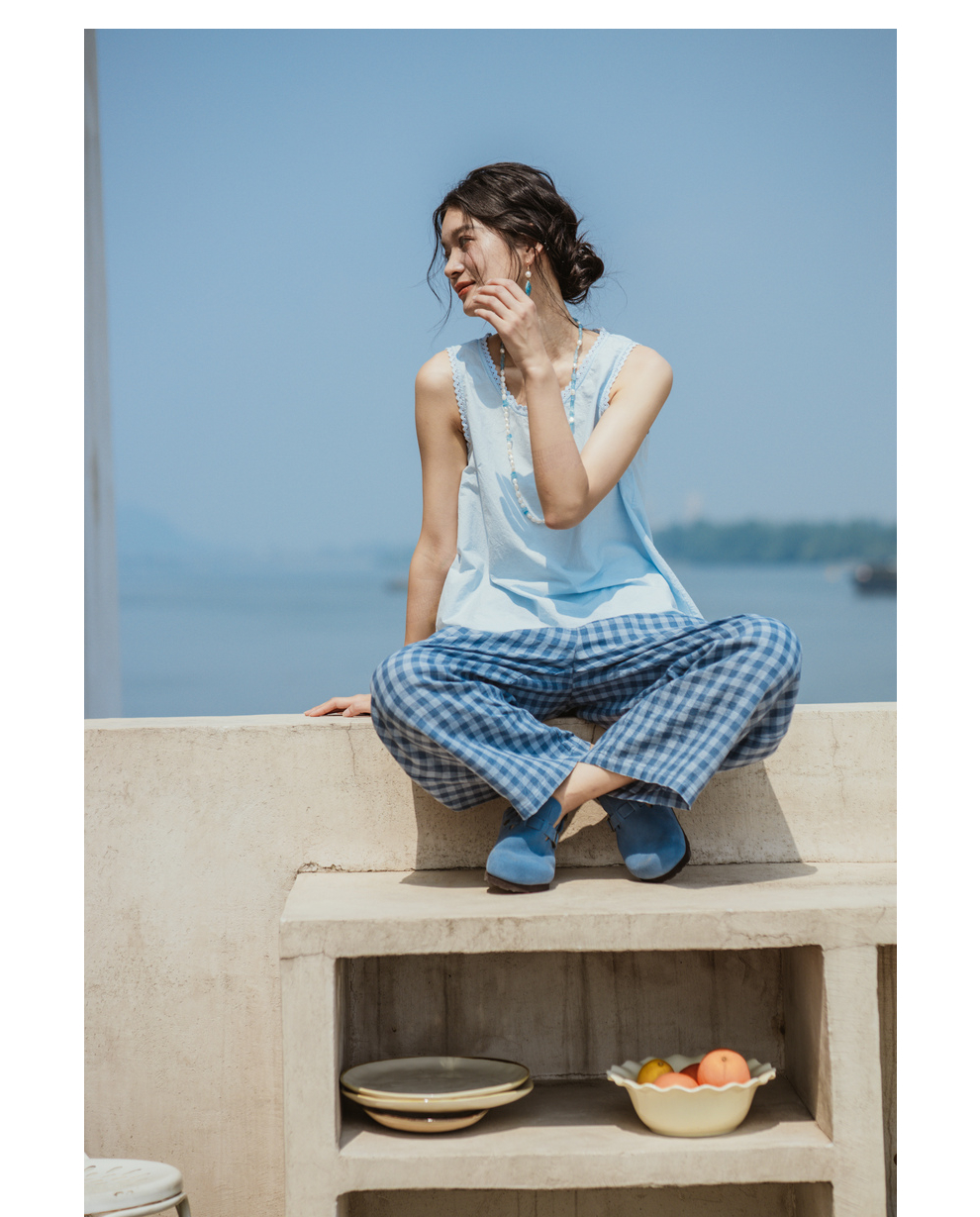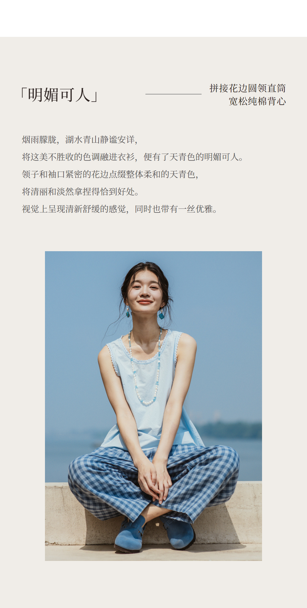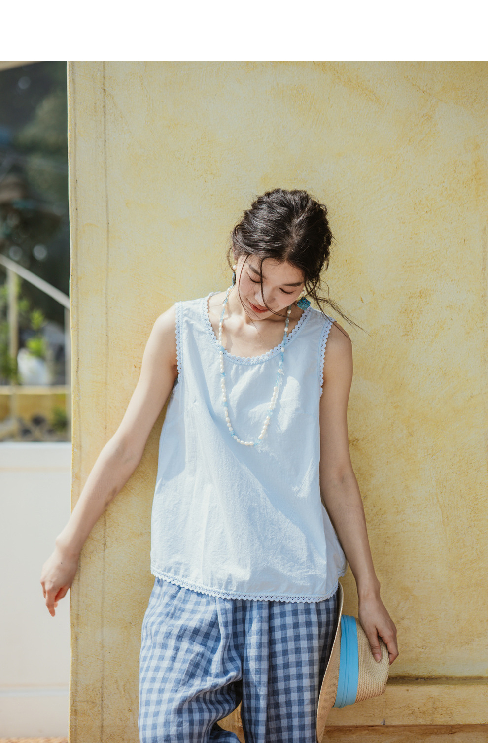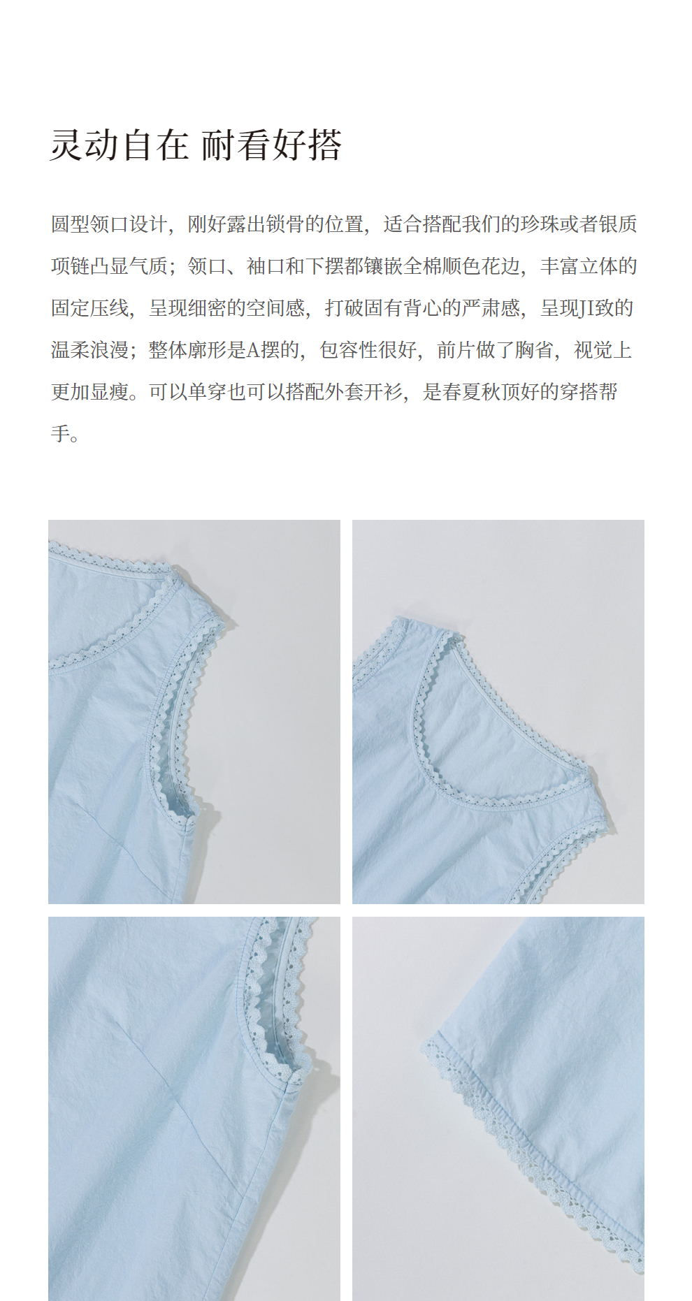 绽放382朵【入蓝系列】高端汉麻棉天青色拼接花边宽松棉麻背心