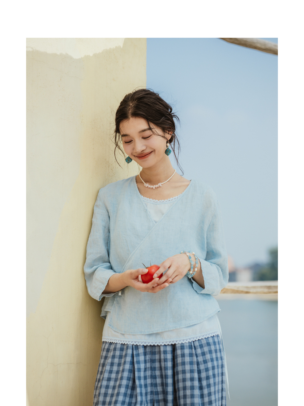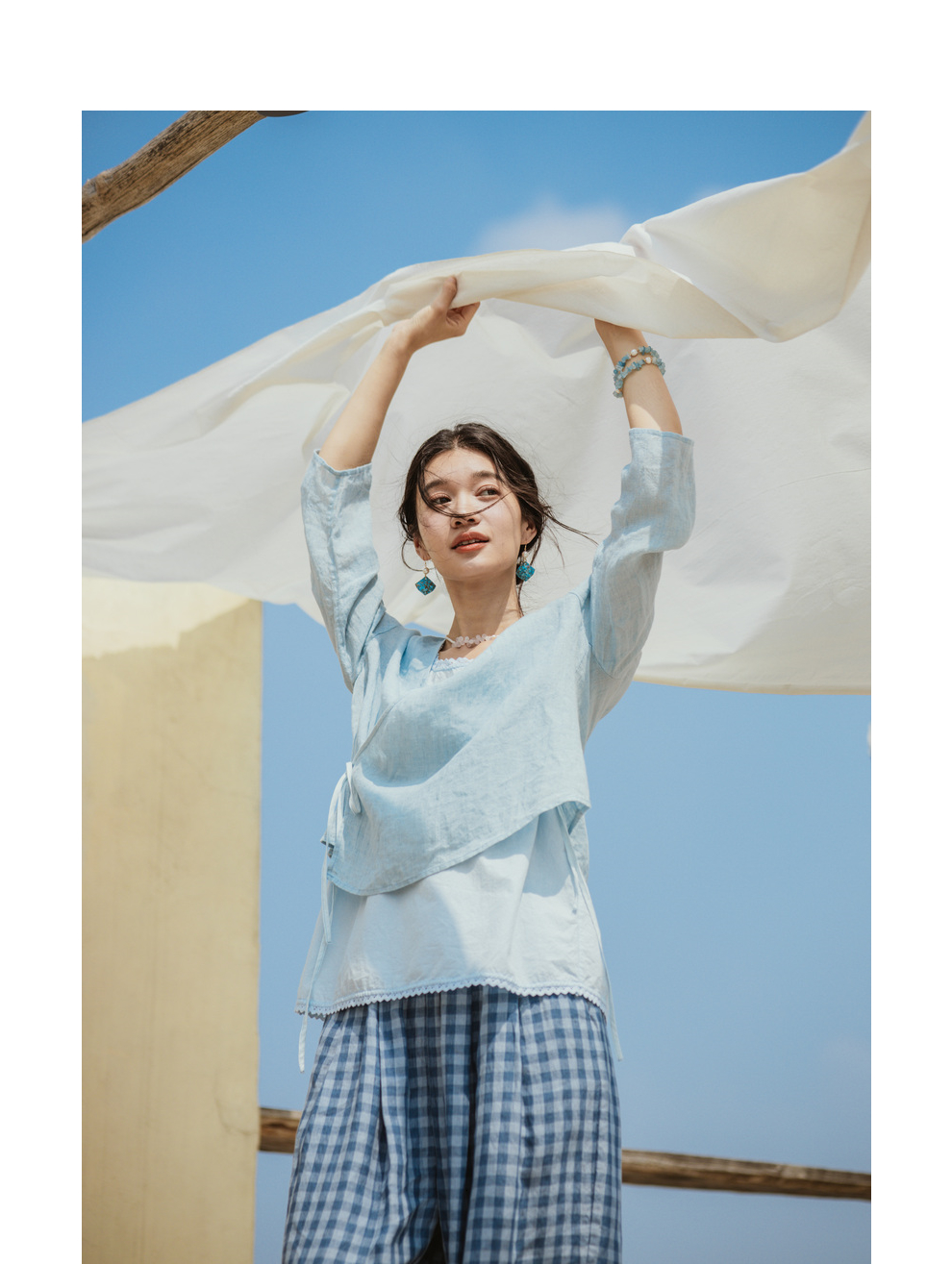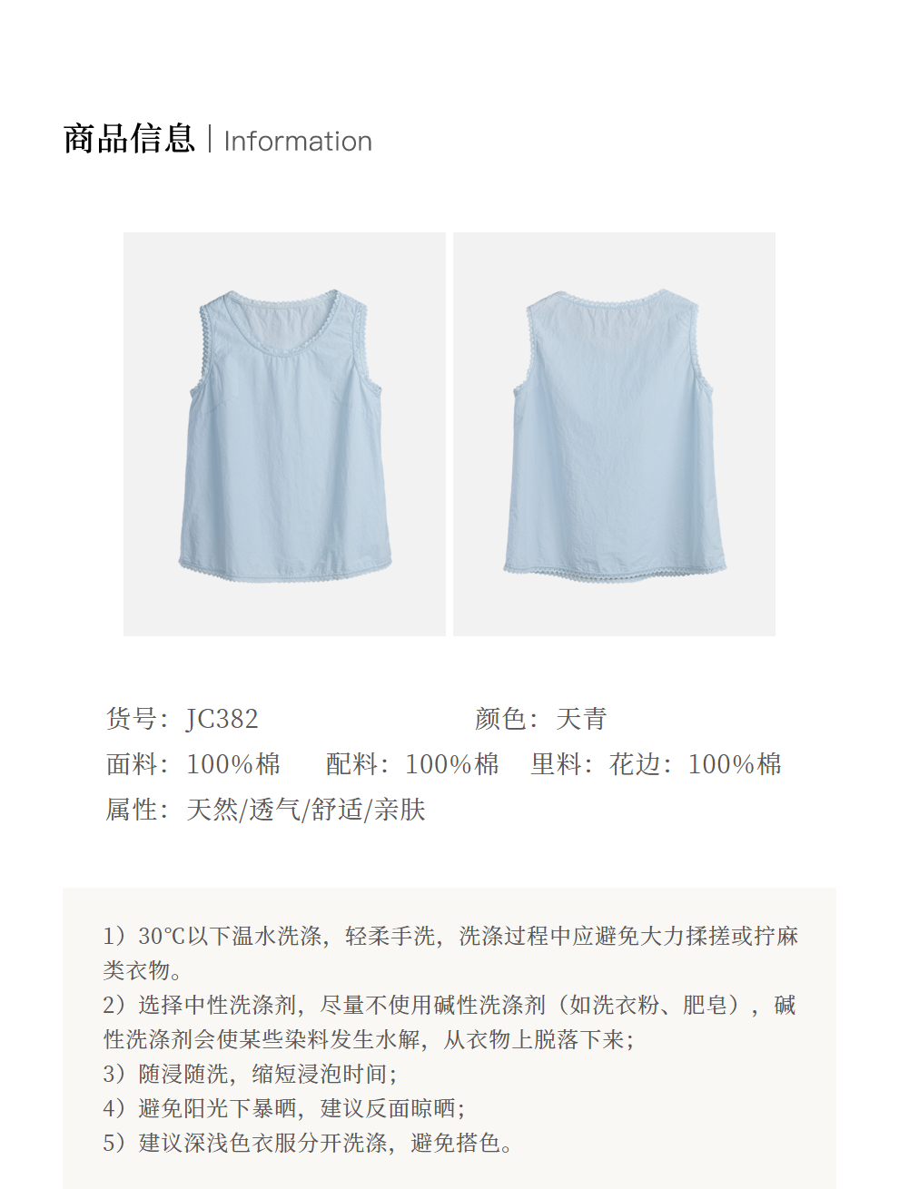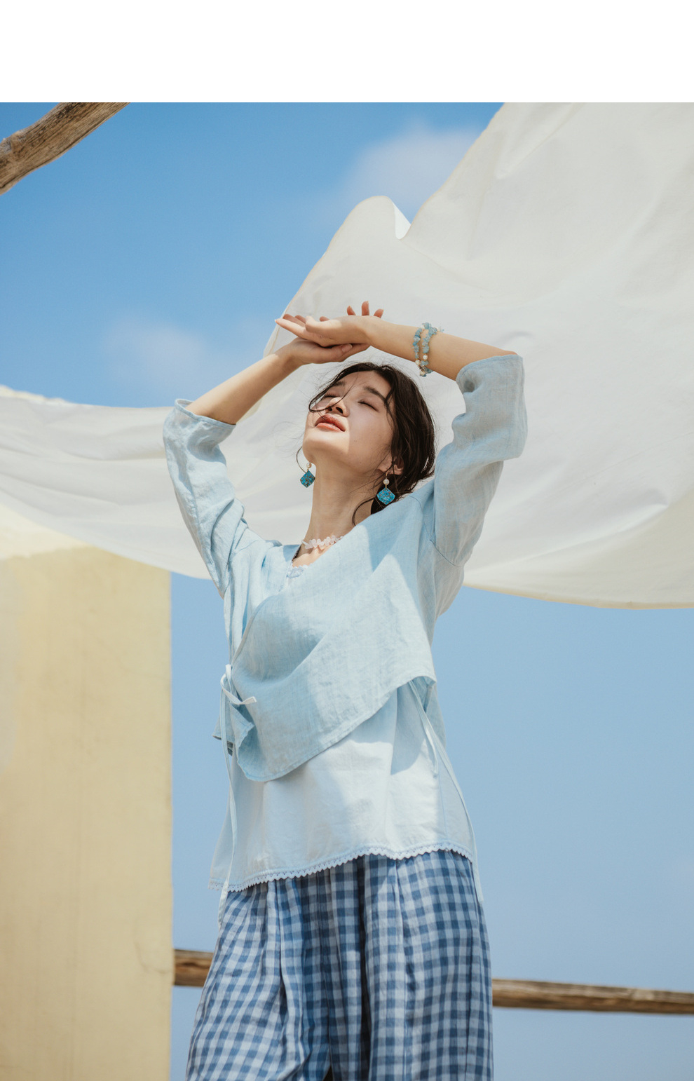 绽放382朵【入蓝系列】高端汉麻棉天青色拼接花边宽松棉麻背心