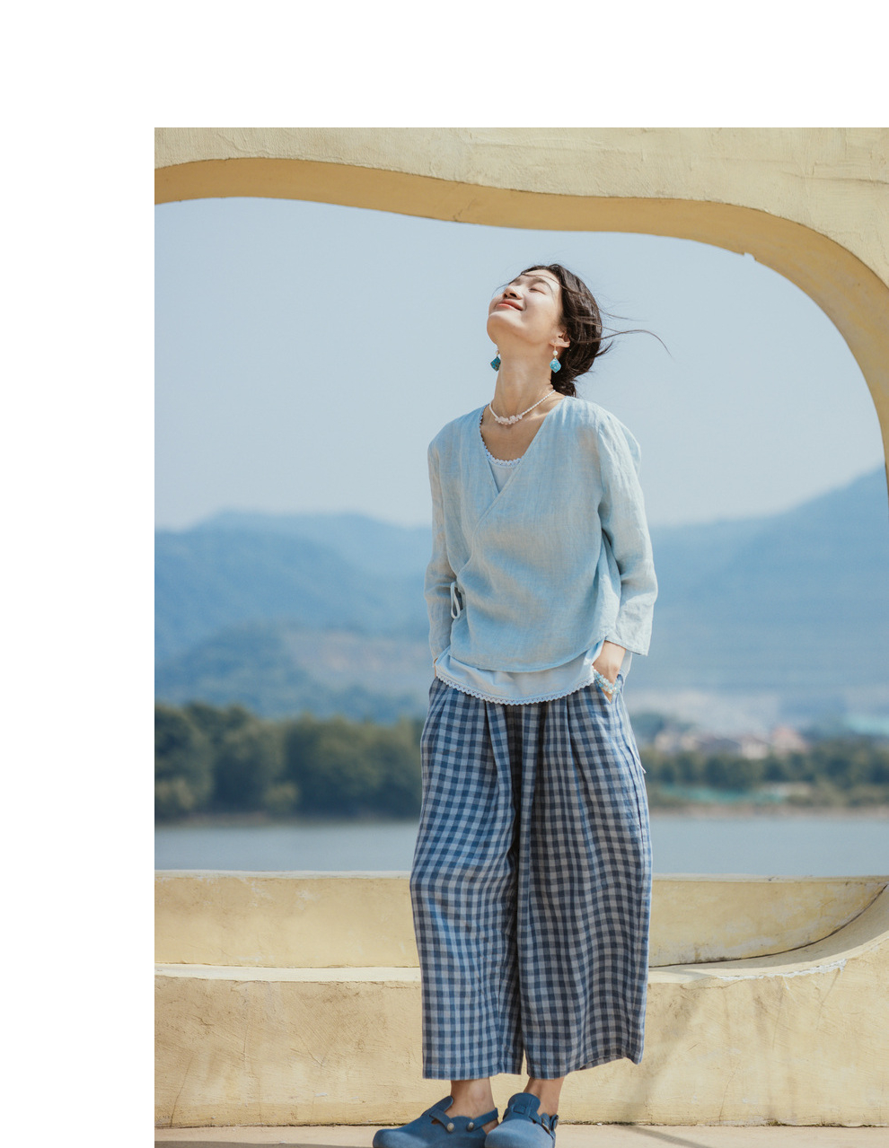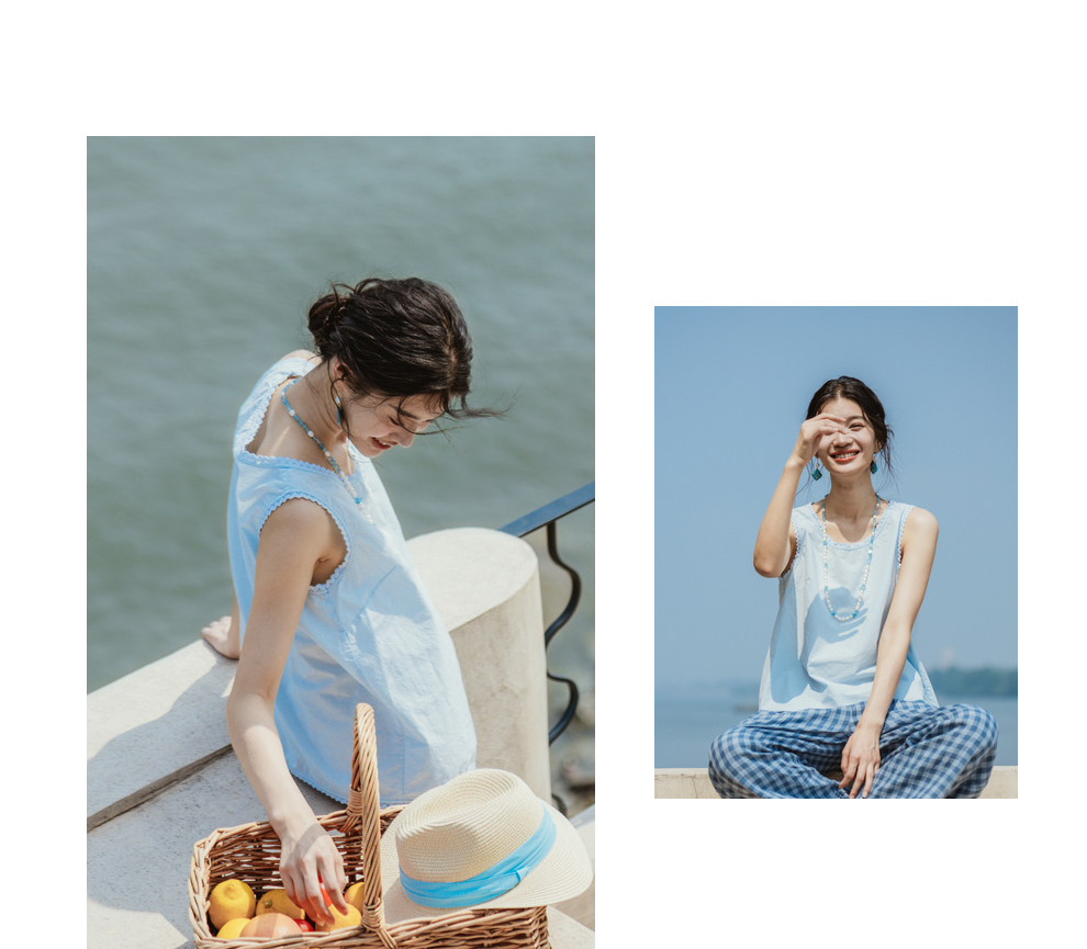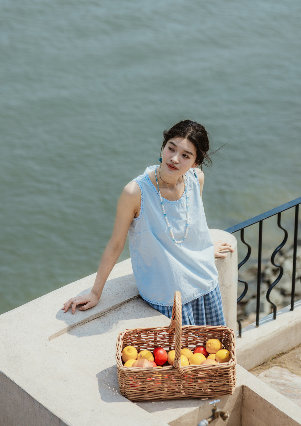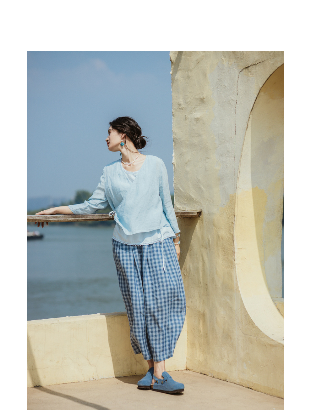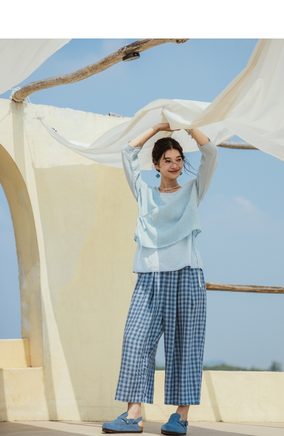 绽放382朵【入蓝系列】高端汉麻棉天青色拼接花边宽松棉麻背心