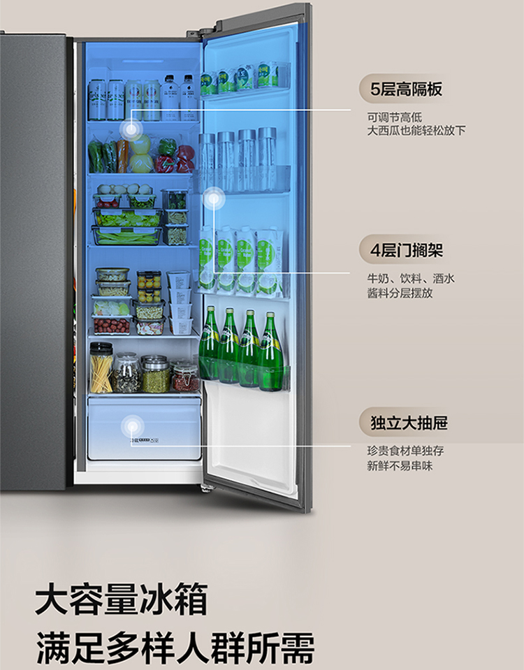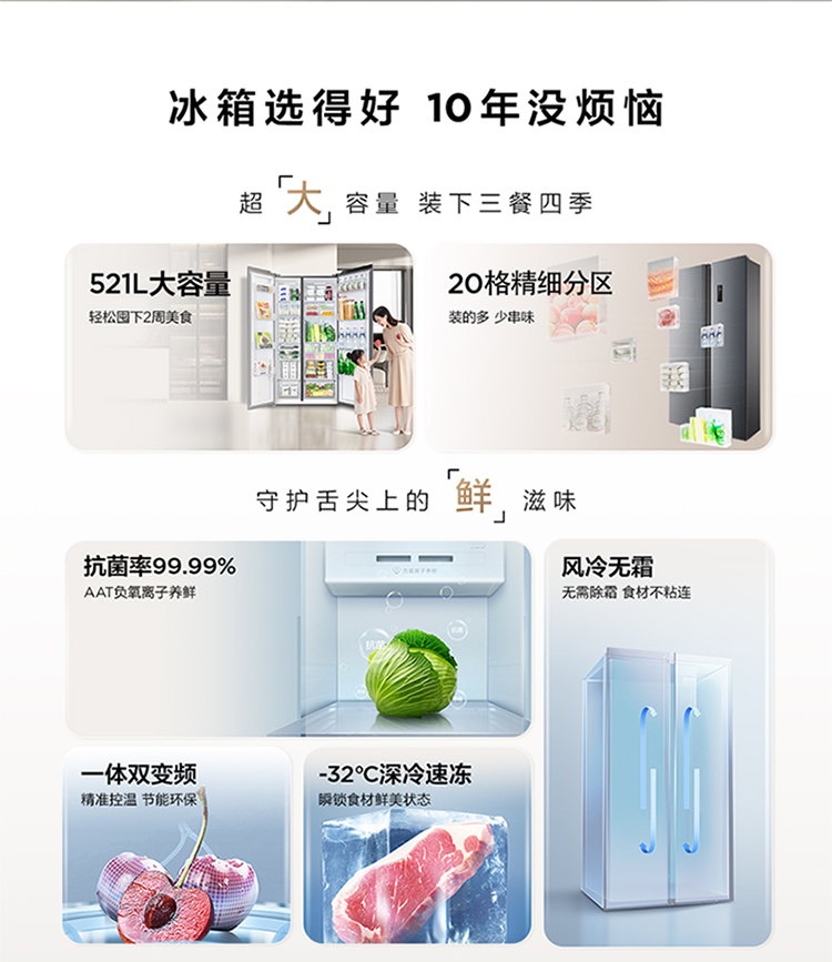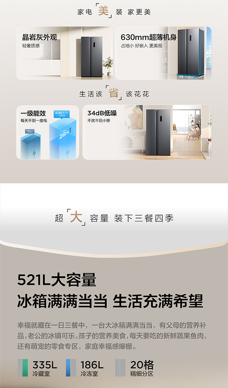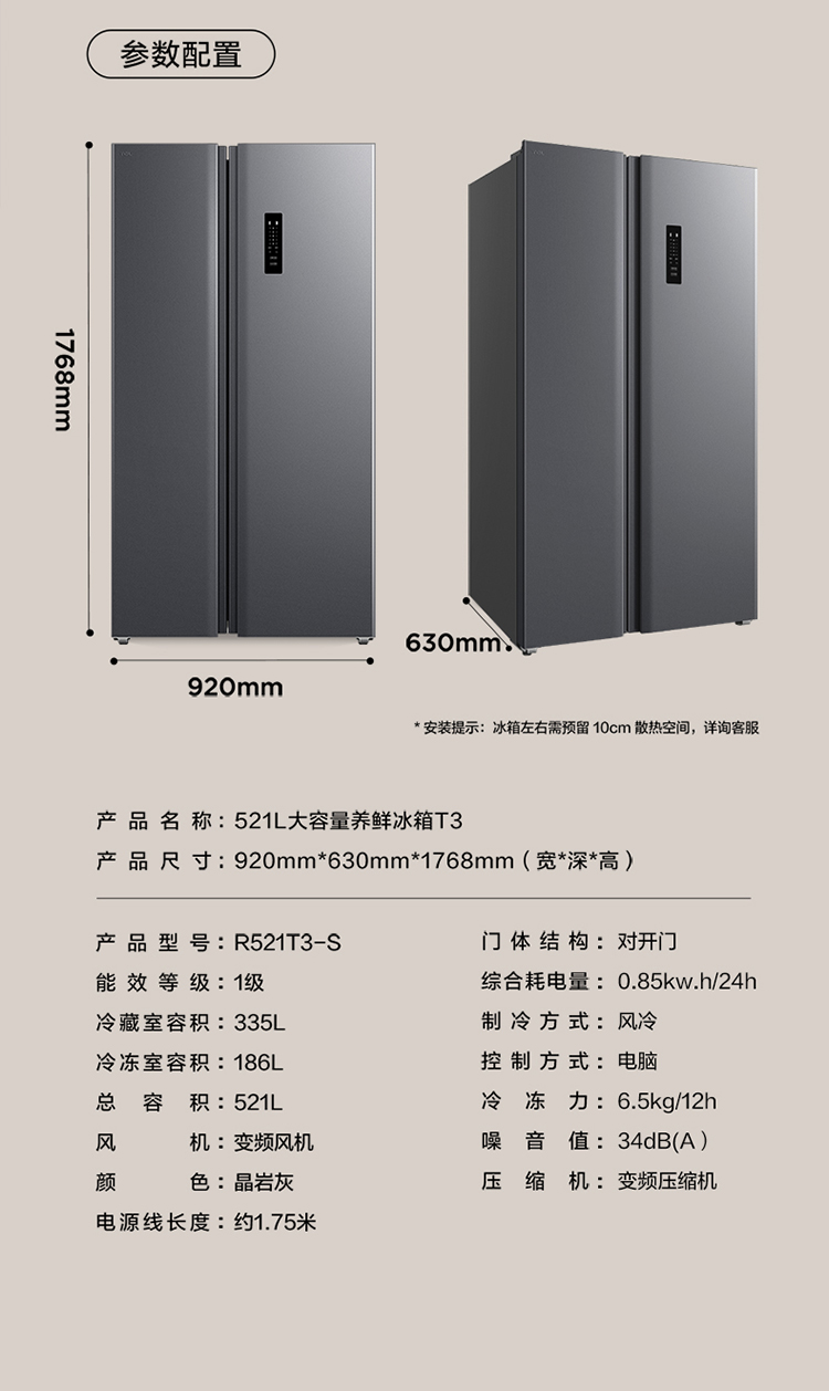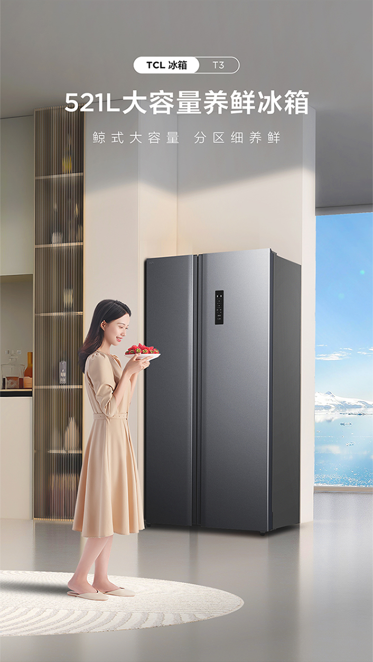 【TCL冰箱】TCL 521升对开门双开门大容量冰箱 63cm超薄 变频一级能效 R521T3-S(咨询客服送优惠大礼包)