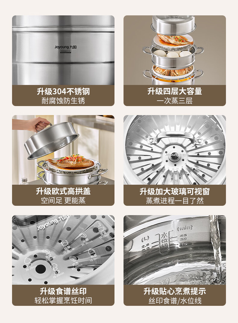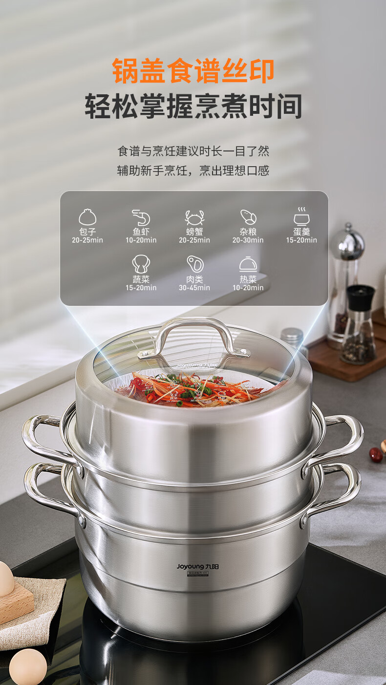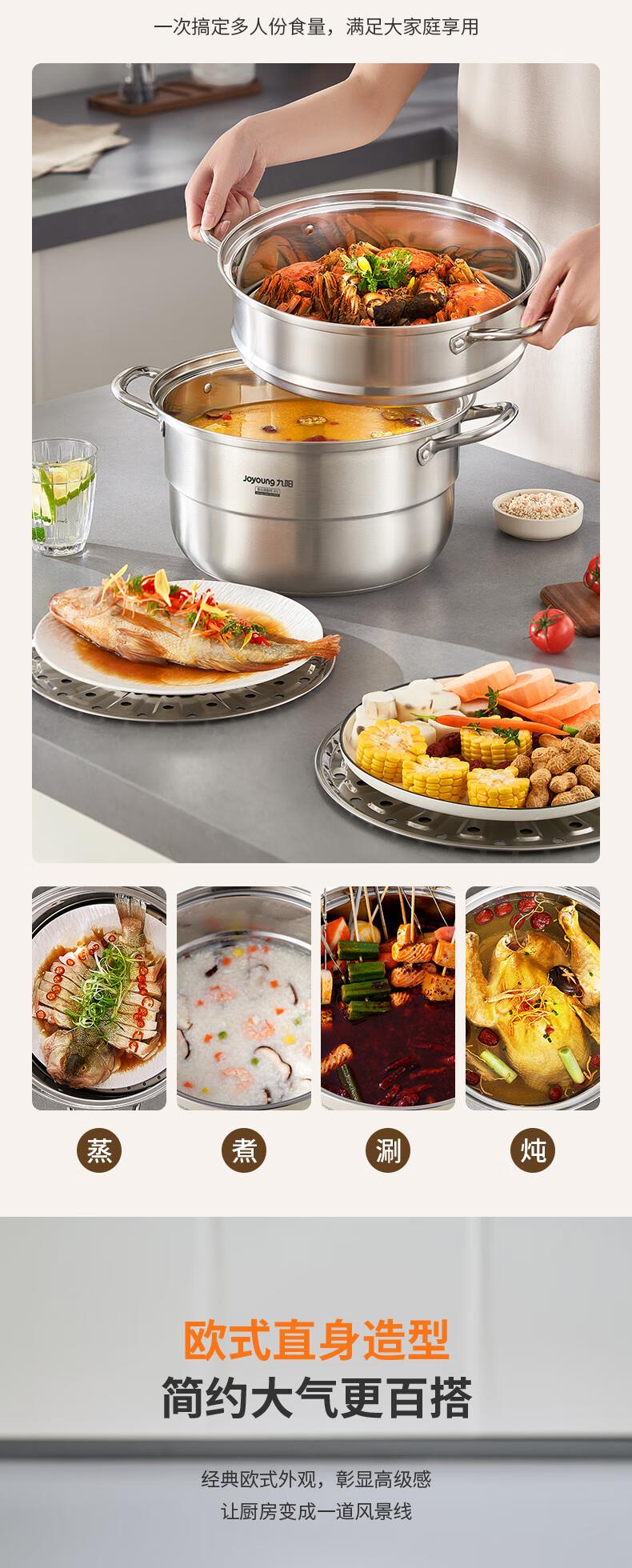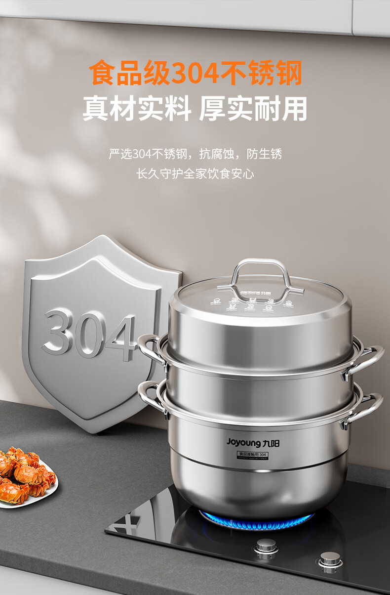 九阳304不锈钢蒸锅加高拱盖大容量蒸煮三层可蒸包子馒头磁灶通用