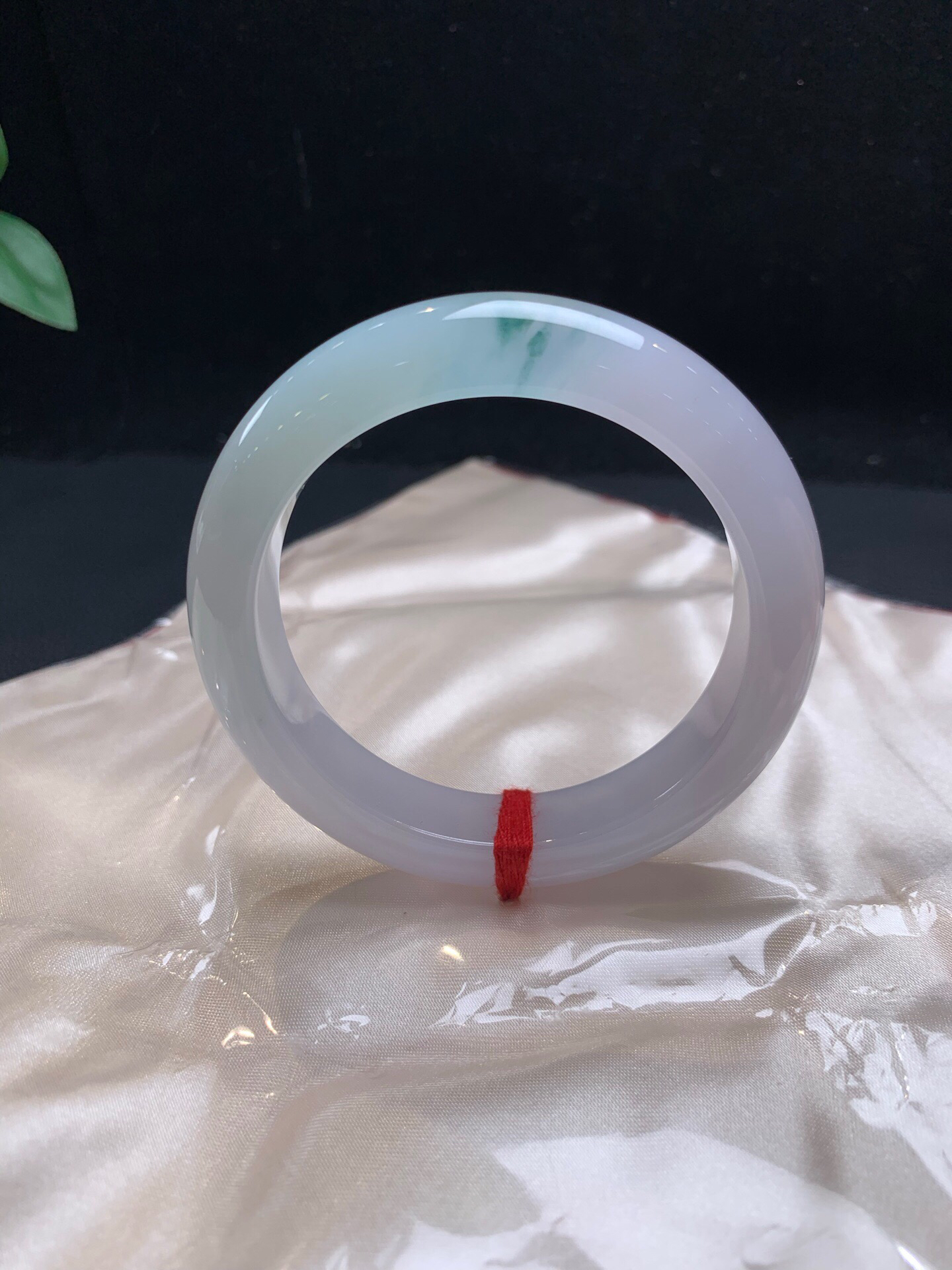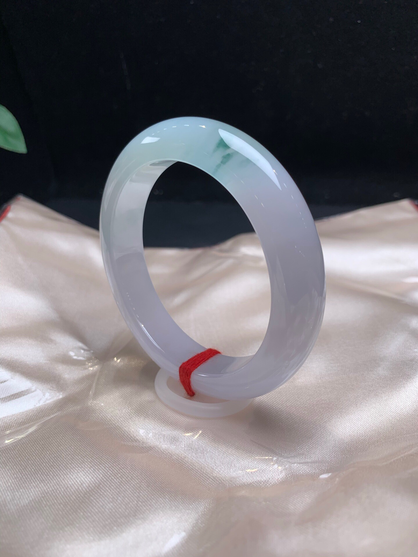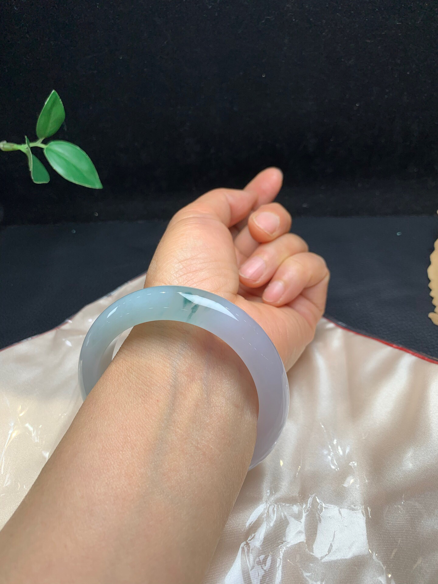 612497,55.5 冰飘花手镯,12.7-9.3mm,冰透清爽,局部飘一抹淡雅的蓝花,干干净净的有条,条形也不错,完美。(室内有点淡紫的感觉)。超值价💰58500 #优石客珠宝#香玉荟萃