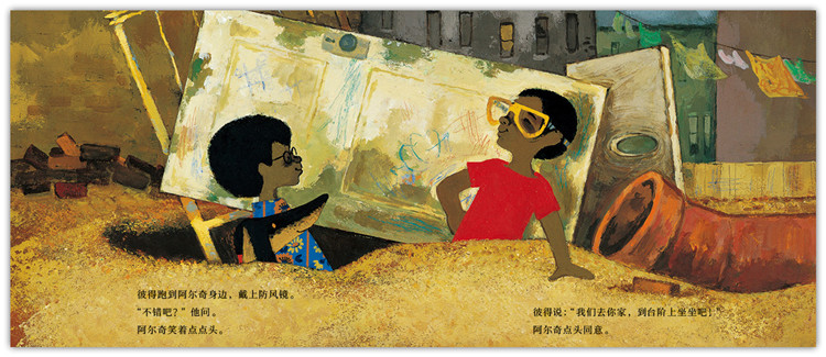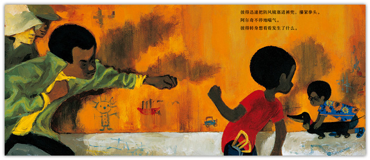 ● 《防风镜》讲述了主人公彼得和朋友阿尔奇、小狗威利机智应对街头恶霸欺凌的故事。故事直接来源于艾兹拉小时候的经历,《防风镜》中肮脏的社区,是艾兹拉从小生活的布鲁克林的真实写照。