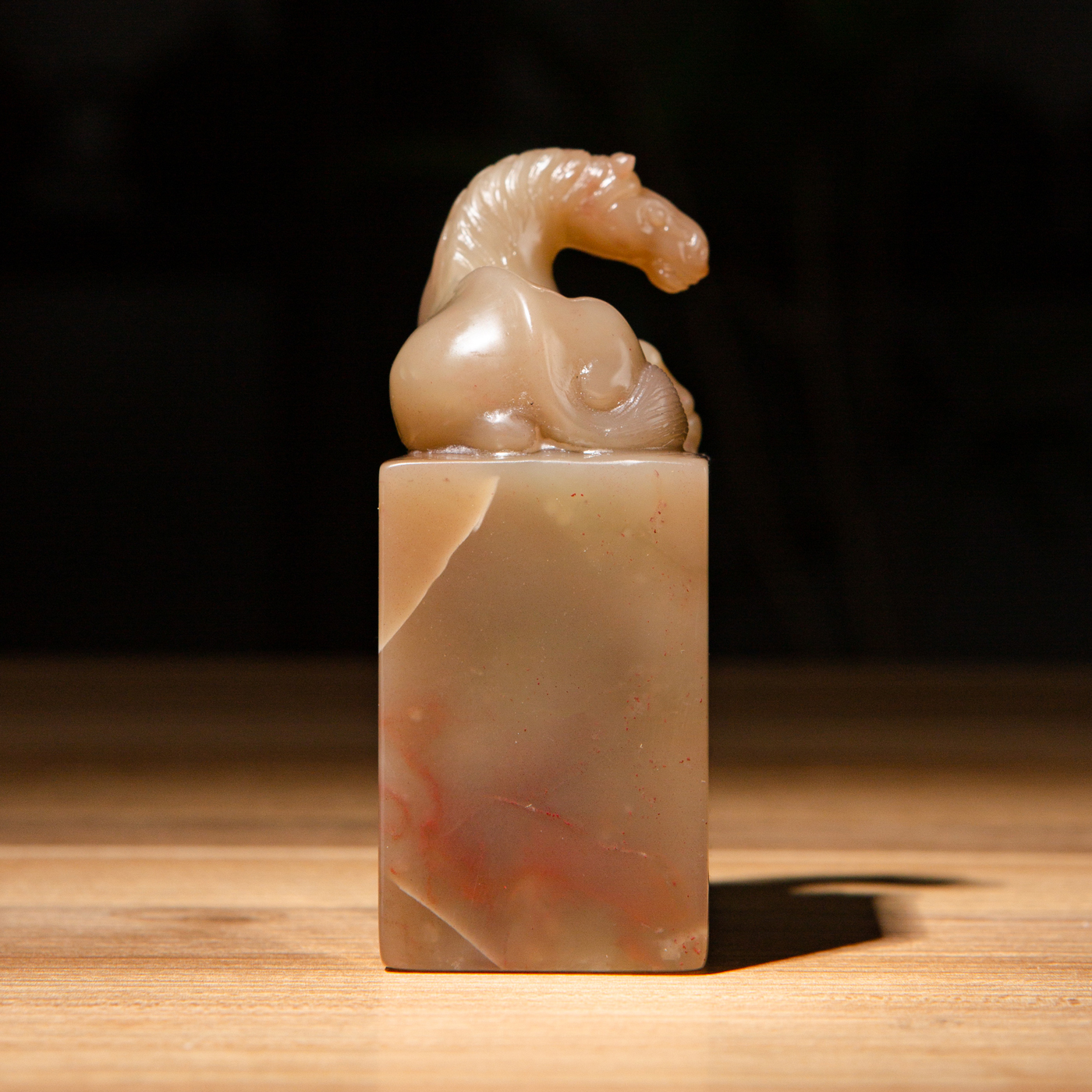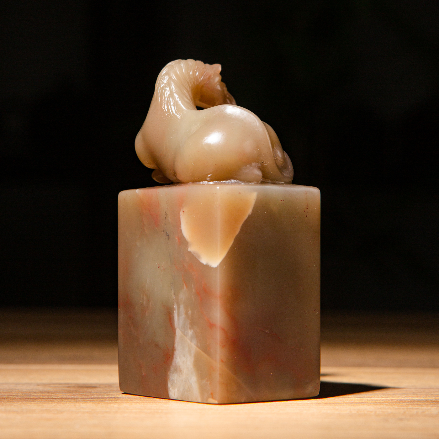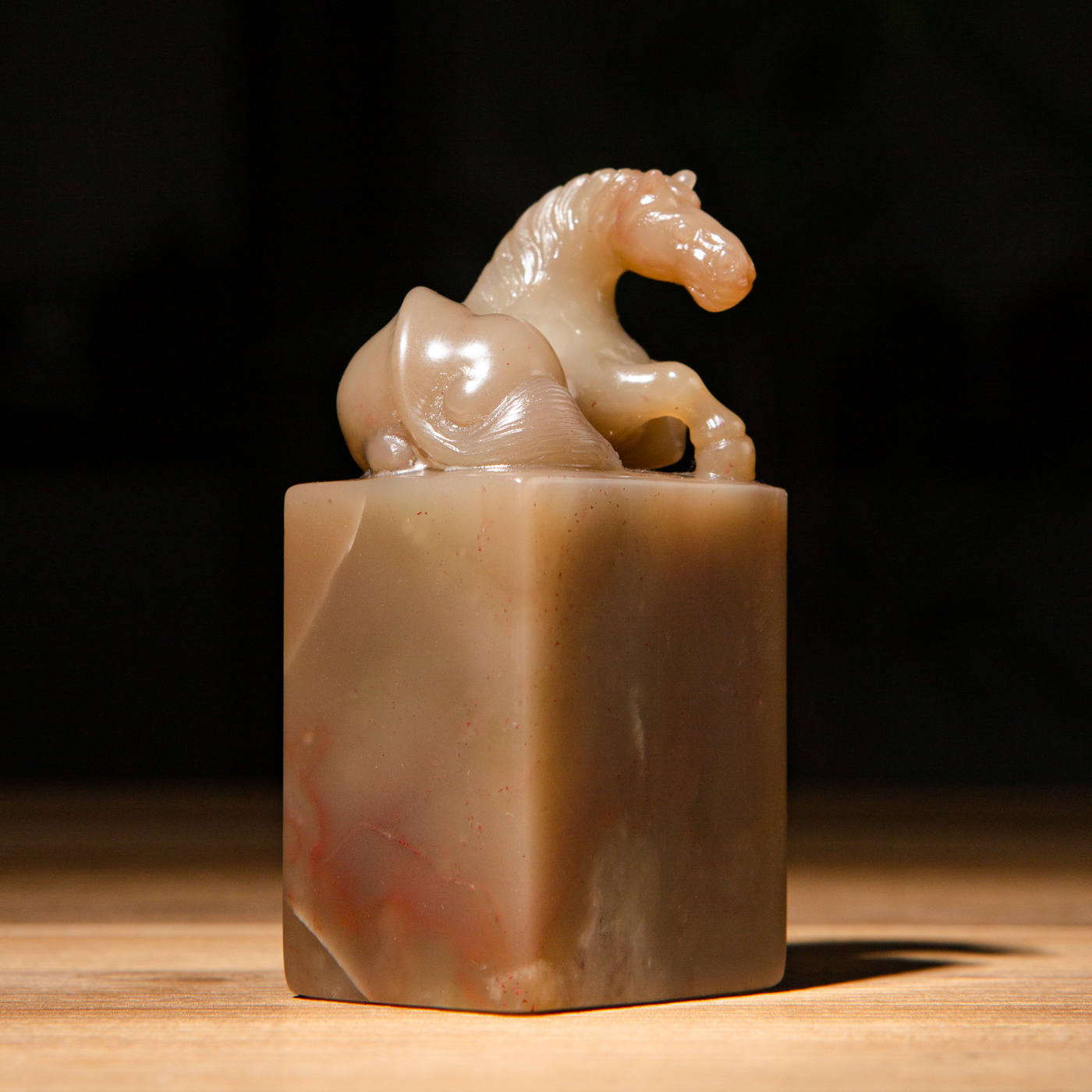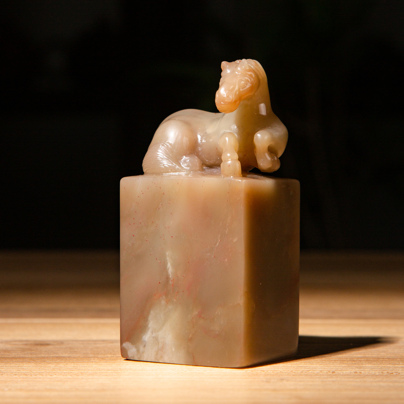 寿山石老料手雕“古骏”方章,采用存放几十年的老料,纯手工精雕而成。其雕工精美,质地温润,石性稳定。