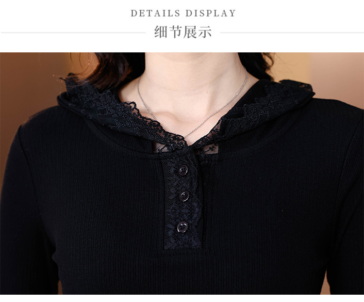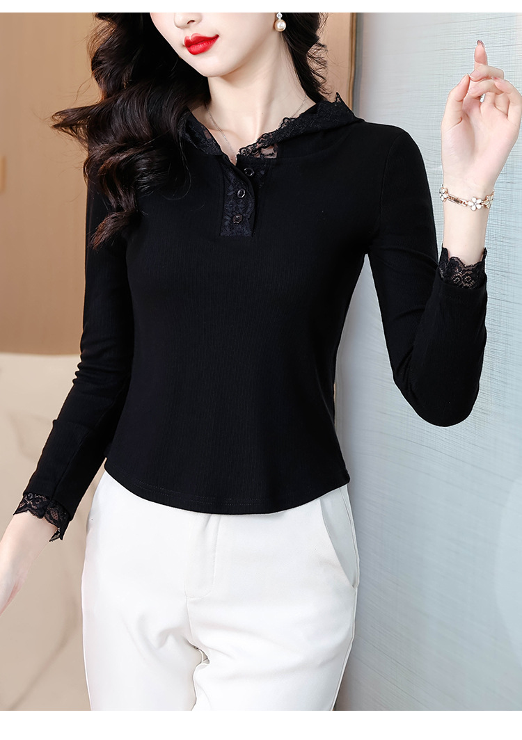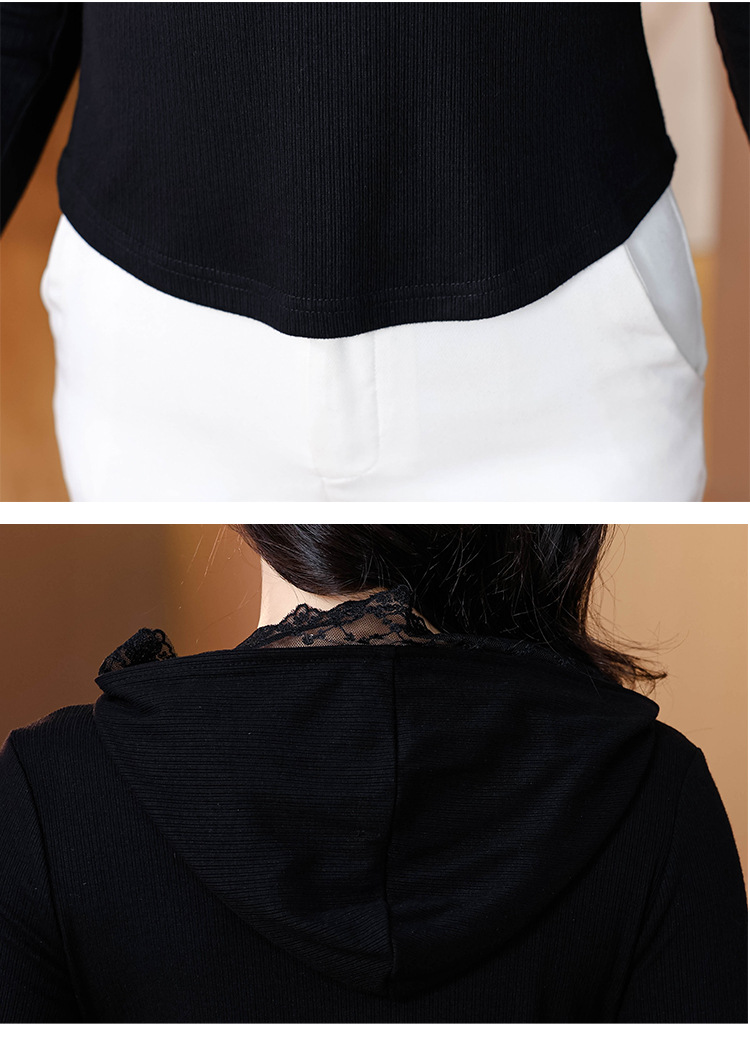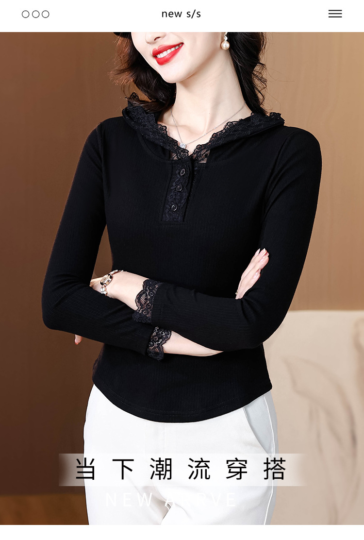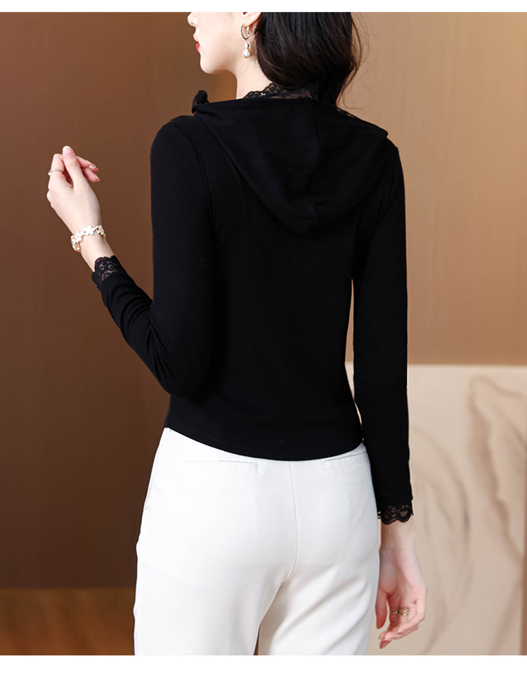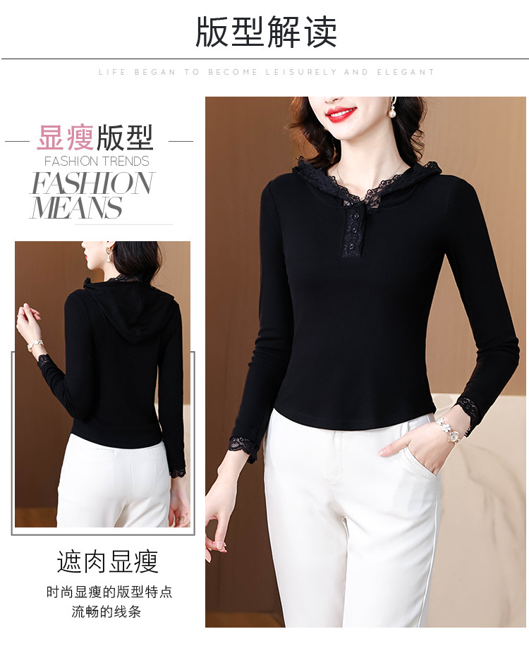 KQL 355H8166蕾丝拼接连帽长袖T恤洋气修身显瘦上衣