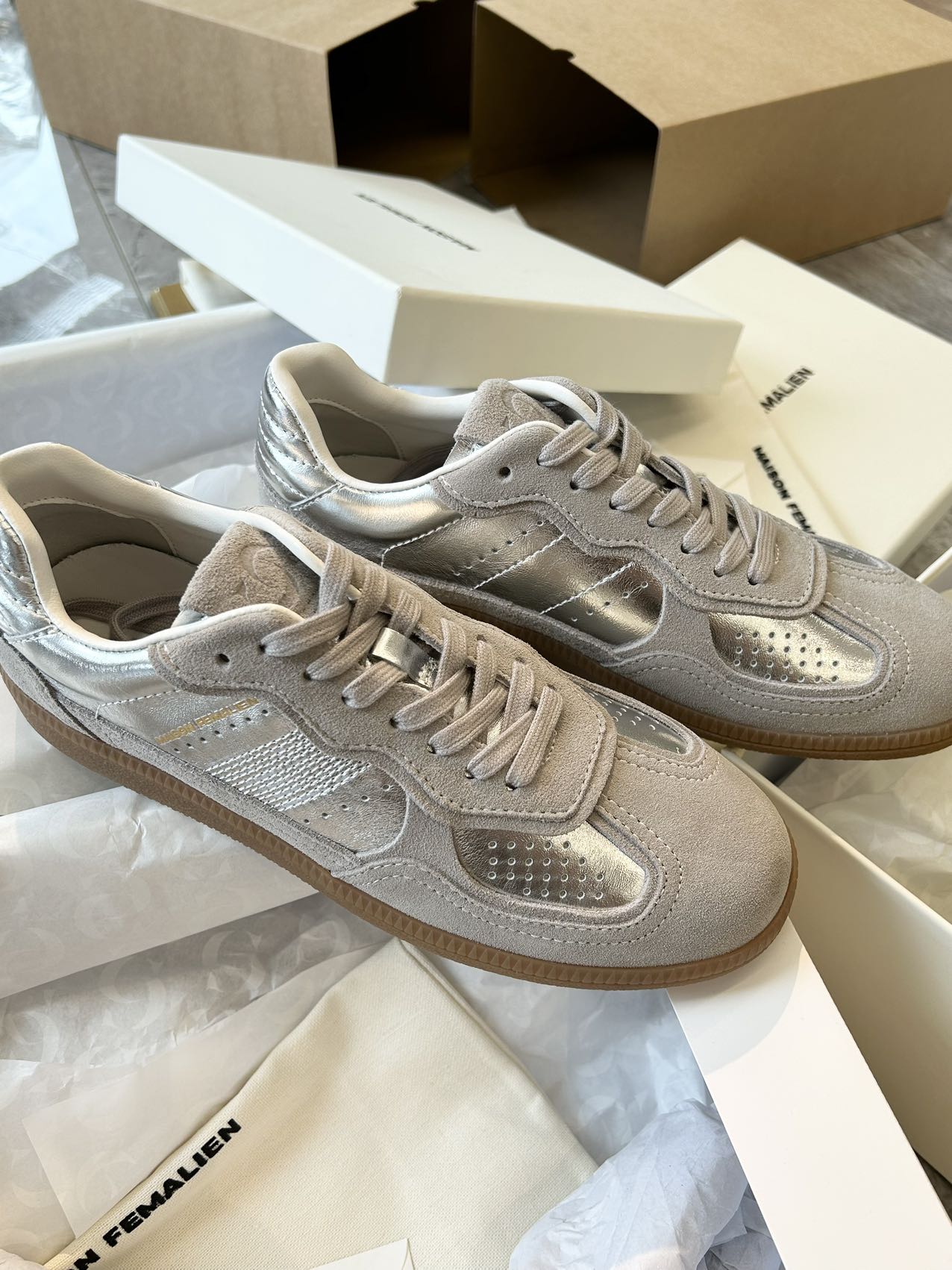 【银灰】配色是银色贴膜牛皮鞋面。清冷的高级感,未来感十足