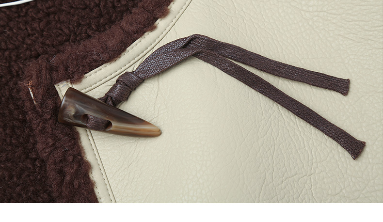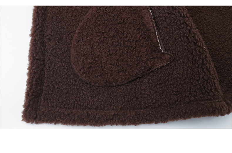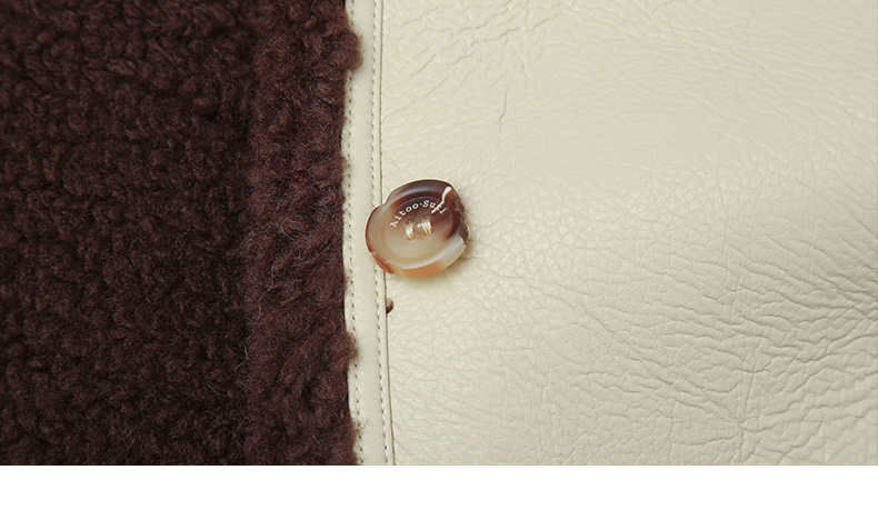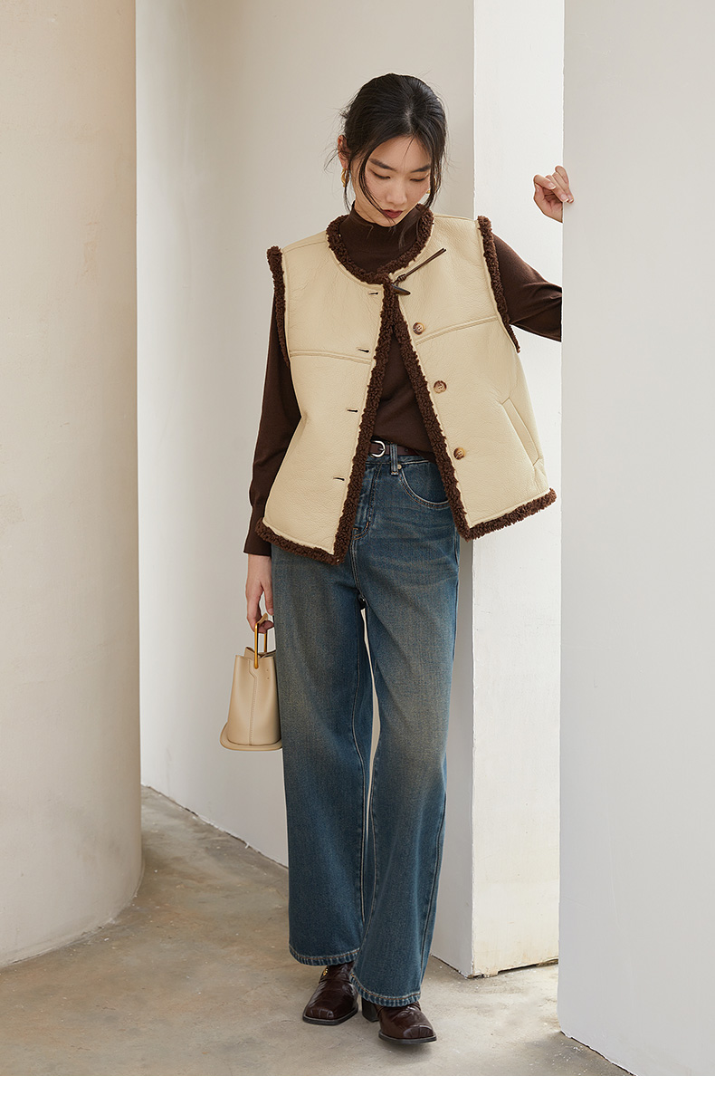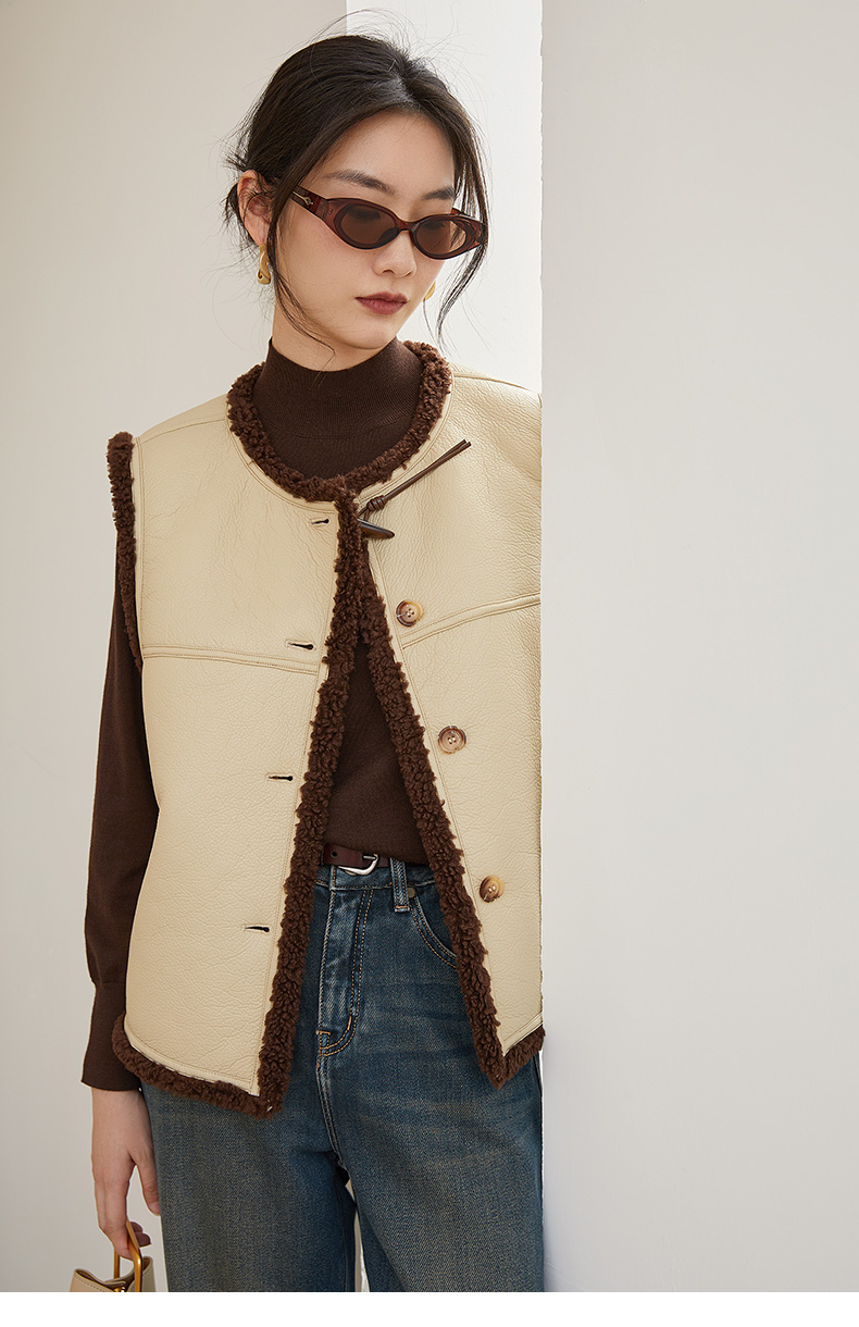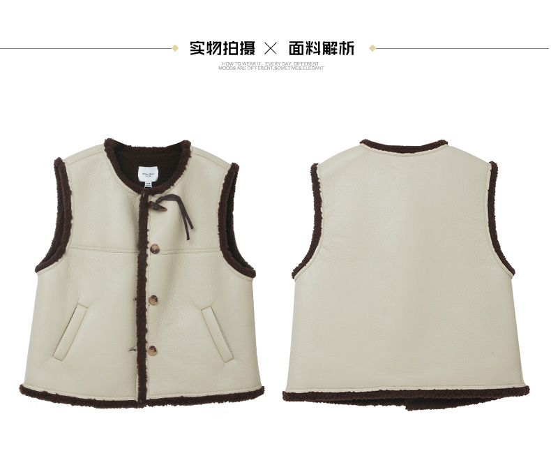 浅米色仿皮拼接深棕羊羔毛无袖马甲 圆领单排扣双口袋宽松休闲秋冬保暖叠穿复古背心