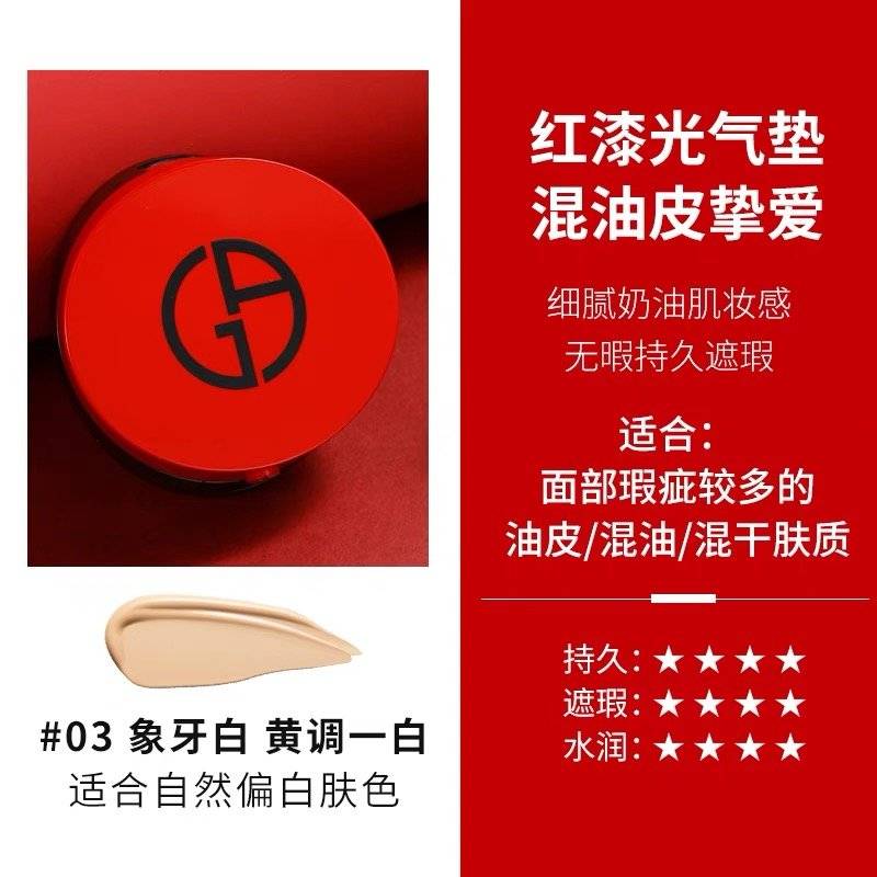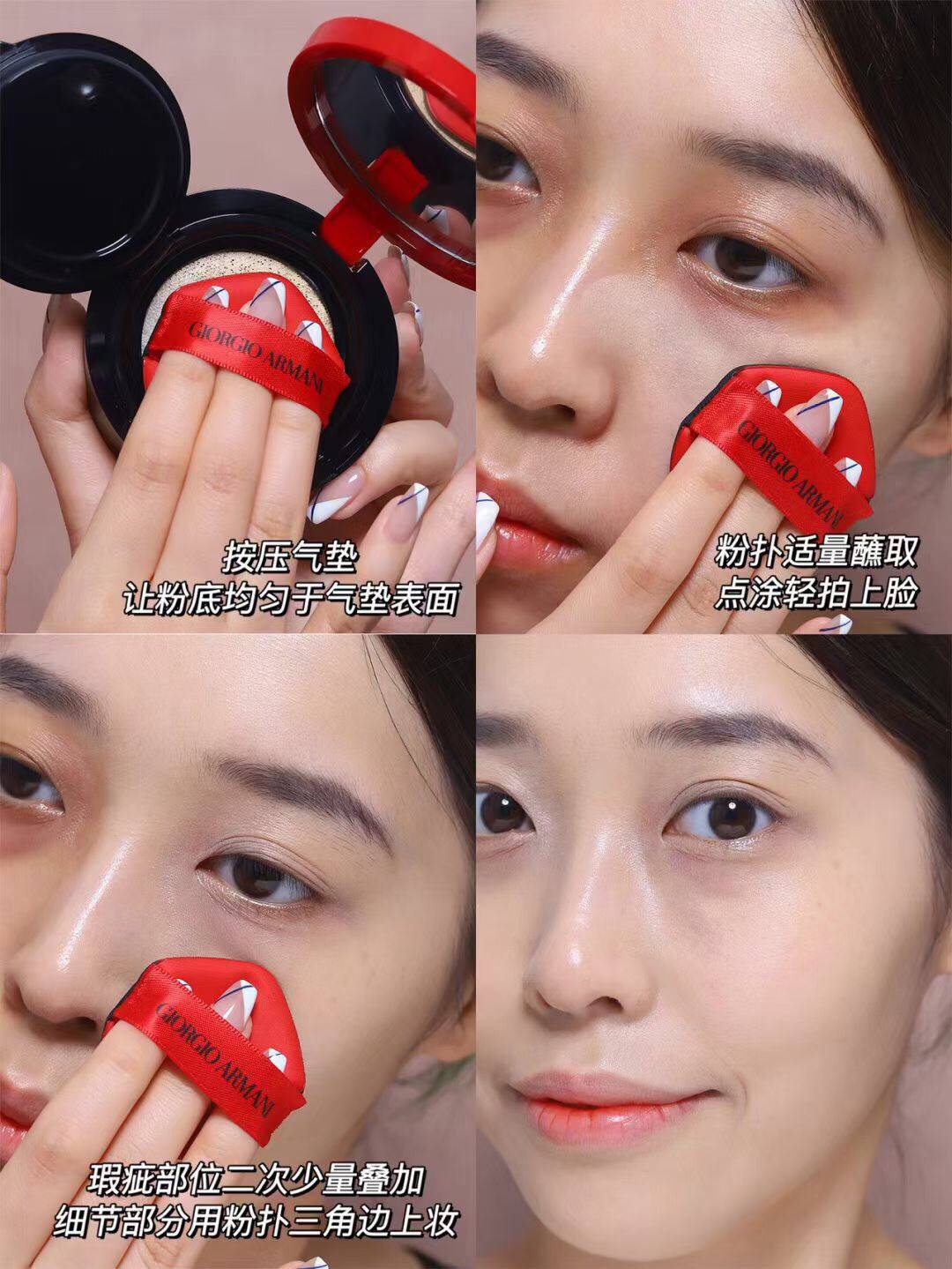 追求完美,选择阿玛尼气垫! “底妆之王”阿玛尼红气垫!明星超模都在用! 【阿玛尼漆光红气垫】 阿玛尼红气垫,不管是从妆感还是持久度评价 都超受各大美妆大佬喜爱!!“轻、薄、透”向来是阿玛尼底妆产品的一大特点‼ ✅采用了独家的超微研粉科技,妆效尤为轻薄。气垫内置的定制级粉扑 ✅水滴状的外形轻抚面部每一处细小的轮廓 让鼻翼t区的底妆更服帖,360度无死角奶油美肌。
