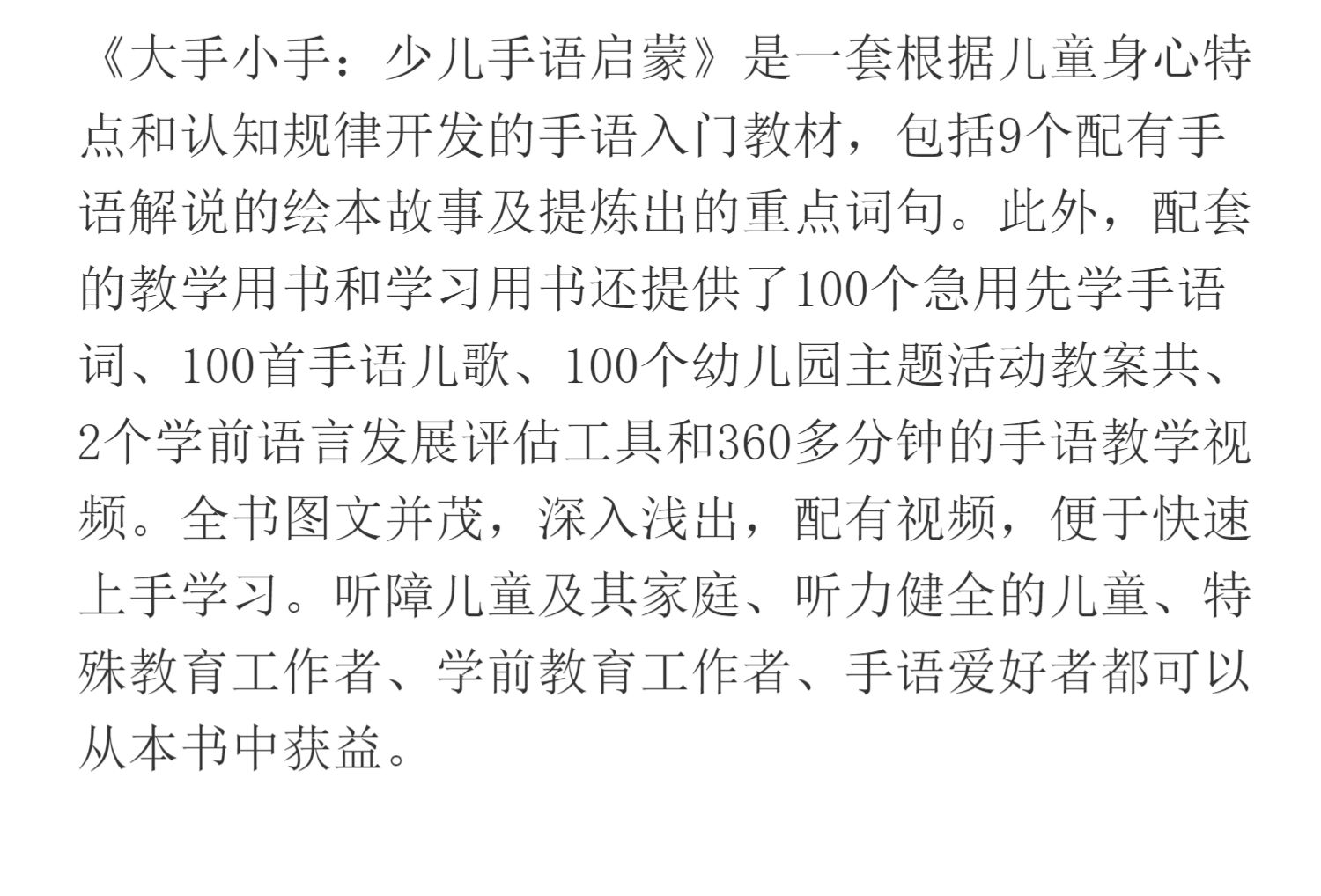 大手小手:少儿手语启蒙 9个配有手语解说的绘本故事各100个急用先学手语词/手语儿歌/幼儿园主题活动教案360多分钟的手语教学视频