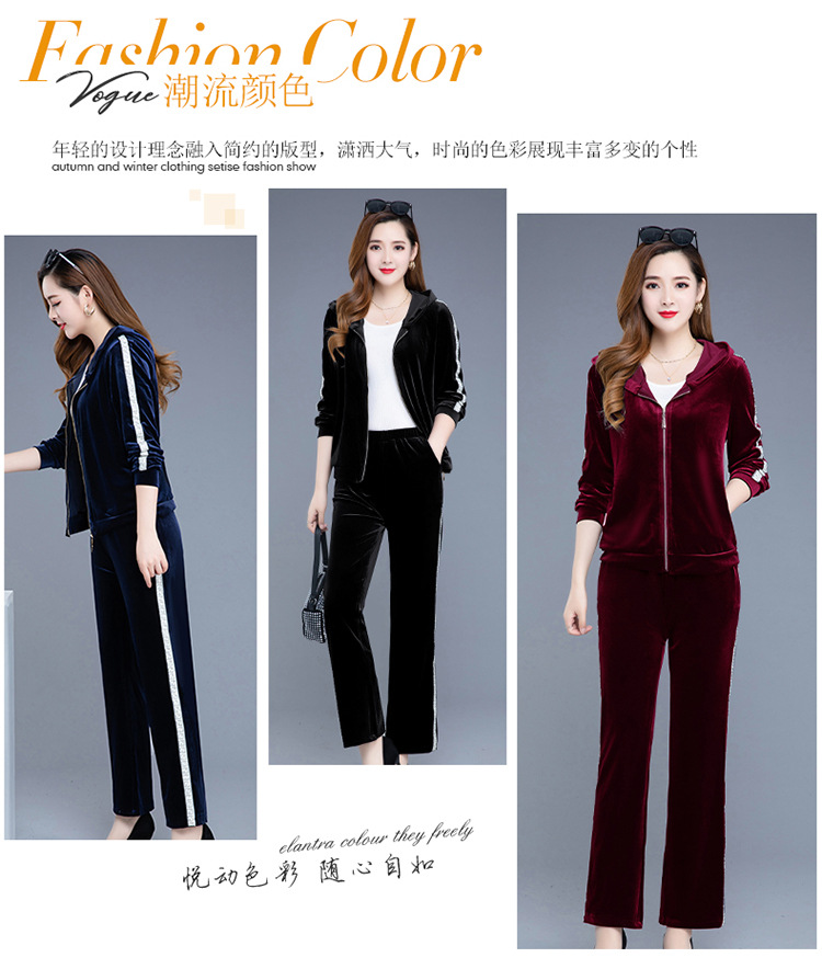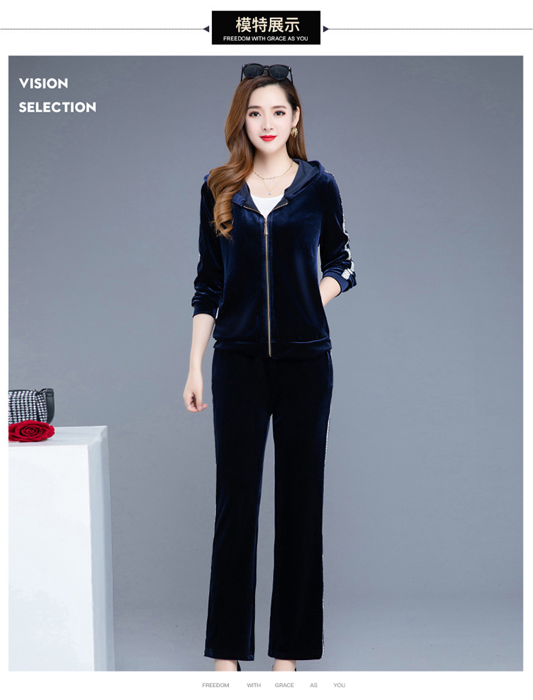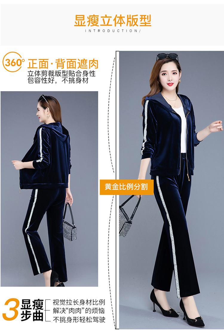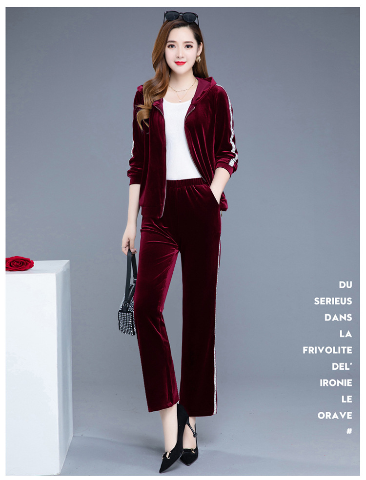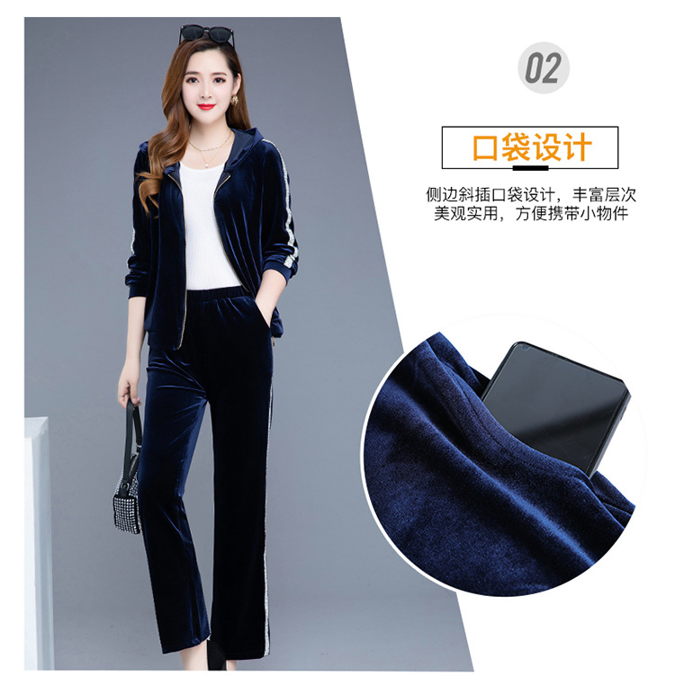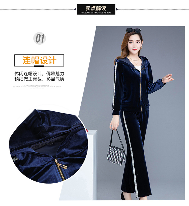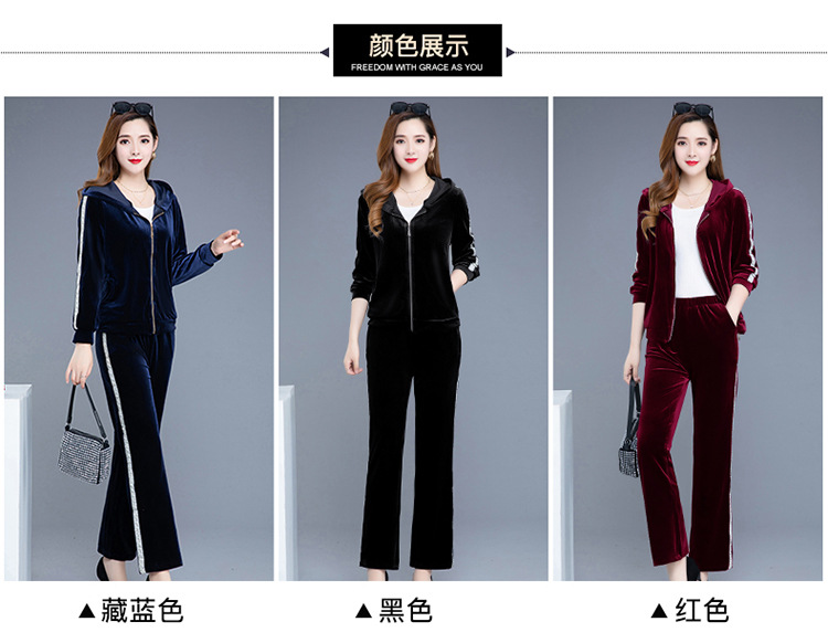 YWE-TC269新款时尚气质修身连帽长袖金丝绒外套长裤两件套