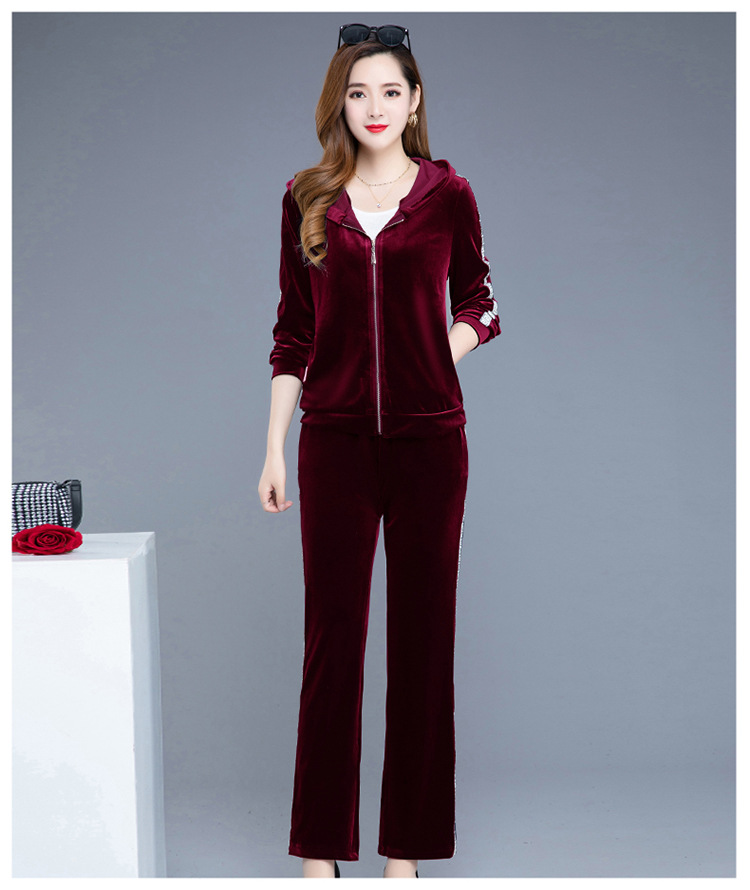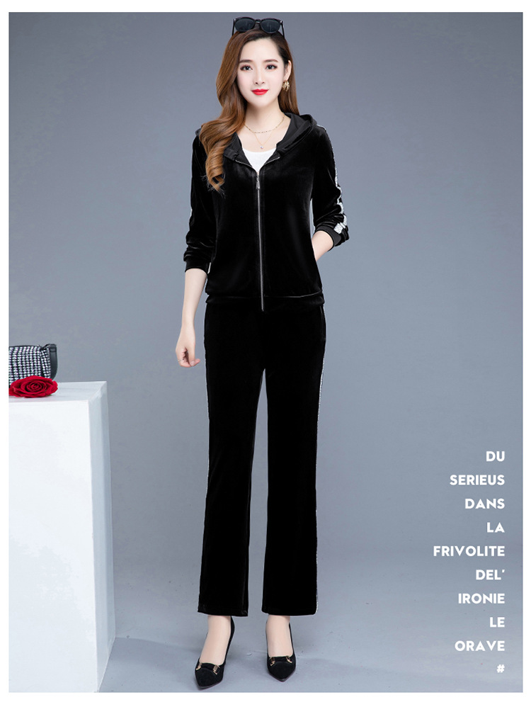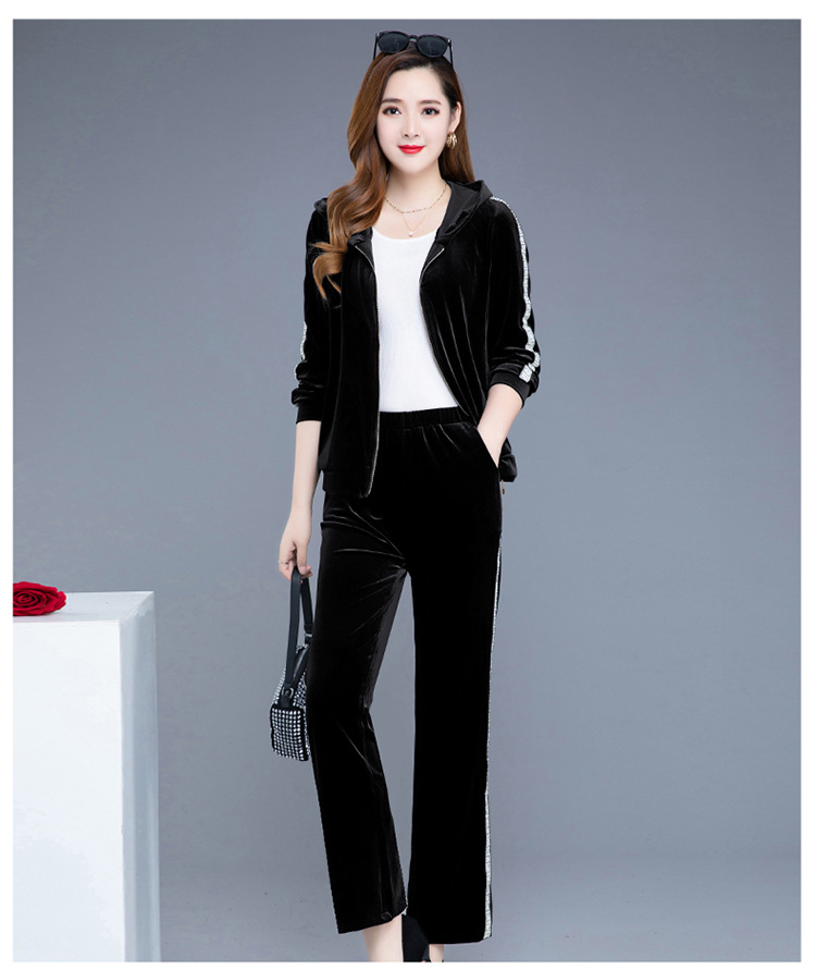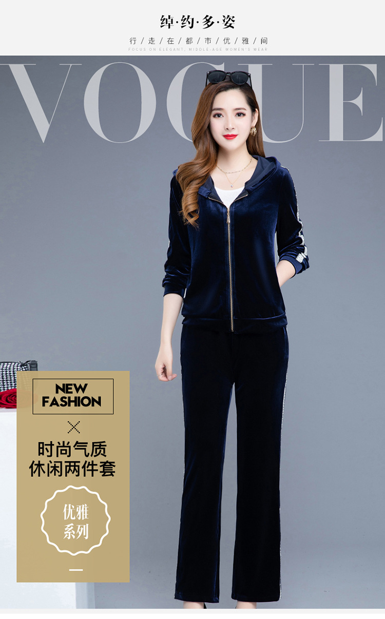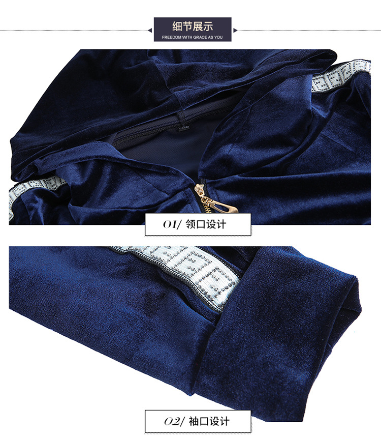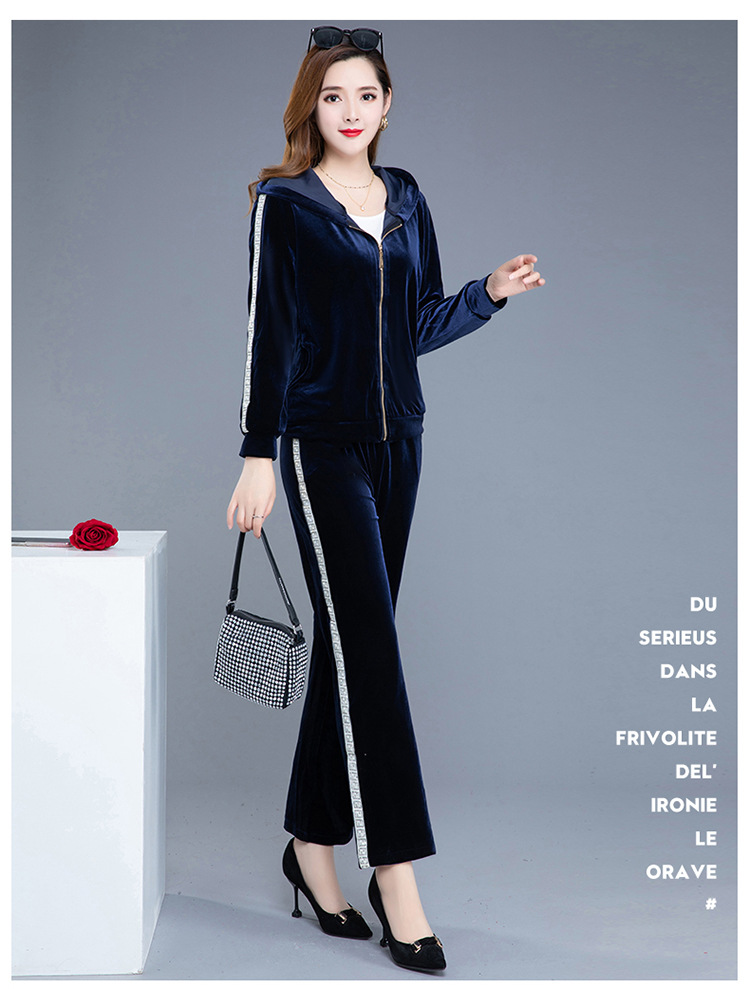 YWE-TC269新款时尚气质修身连帽长袖金丝绒外套长裤两件套
