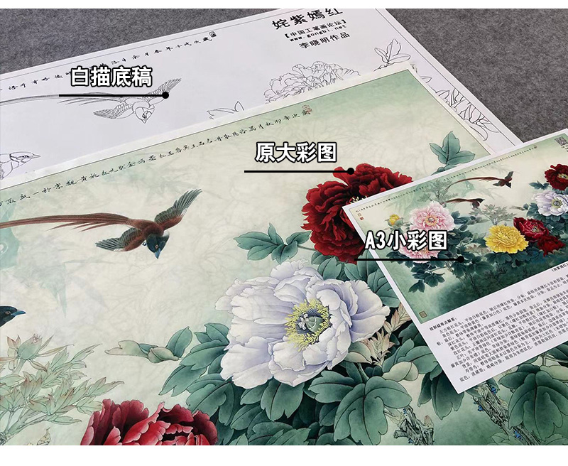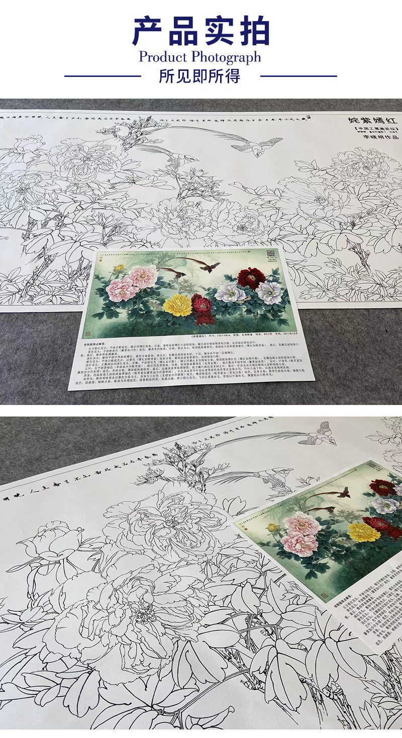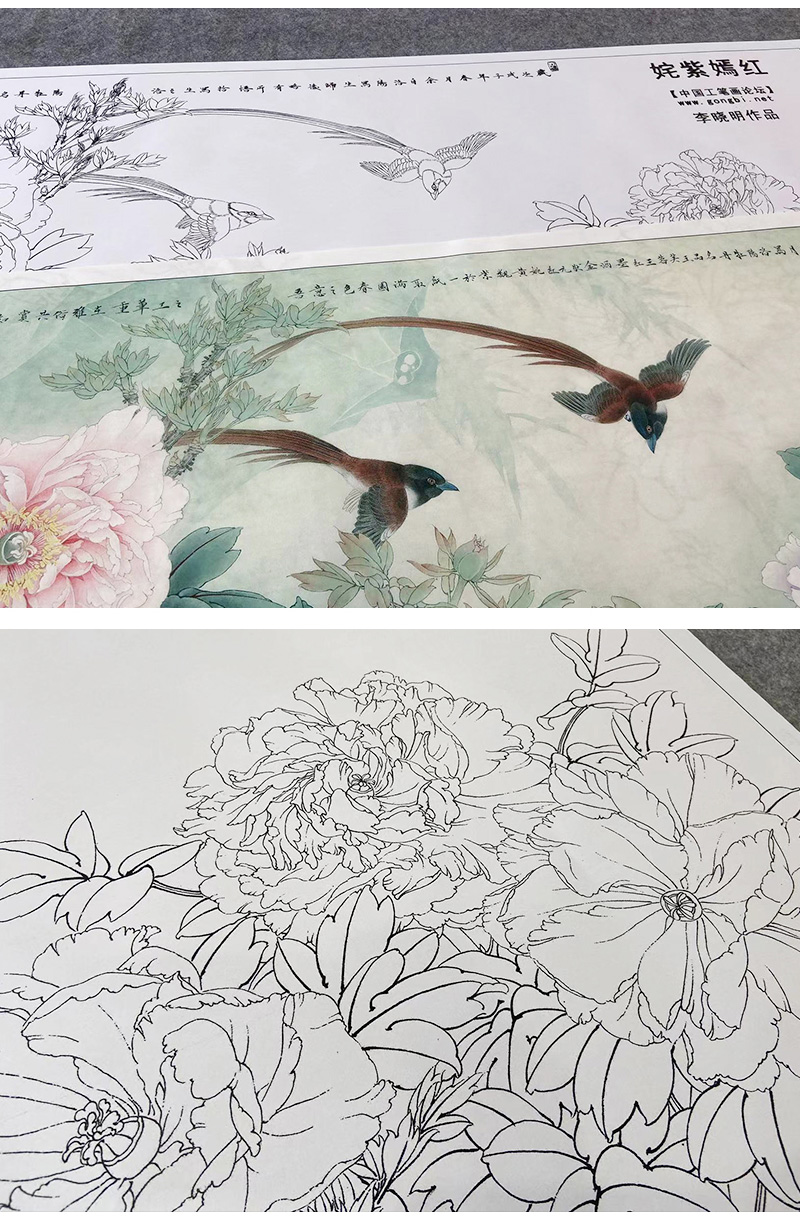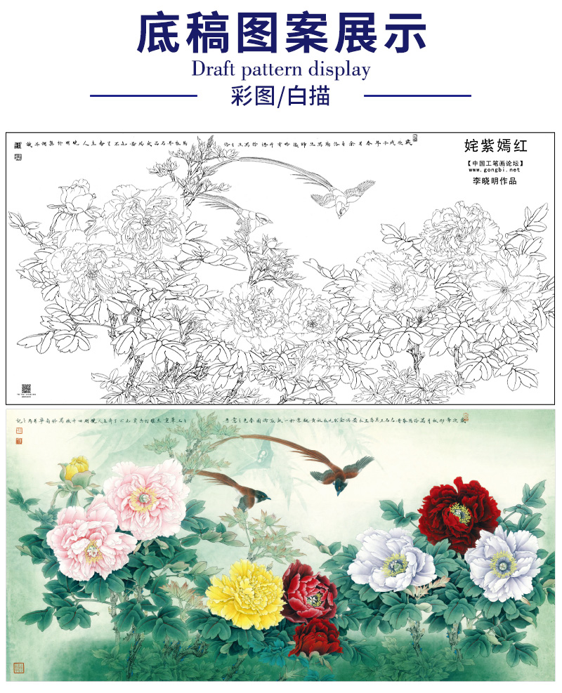 【大彩图】李晓明横幅工笔画白描底稿《姹紫嫣红》牡丹临摹勾线花鸟线稿KA27