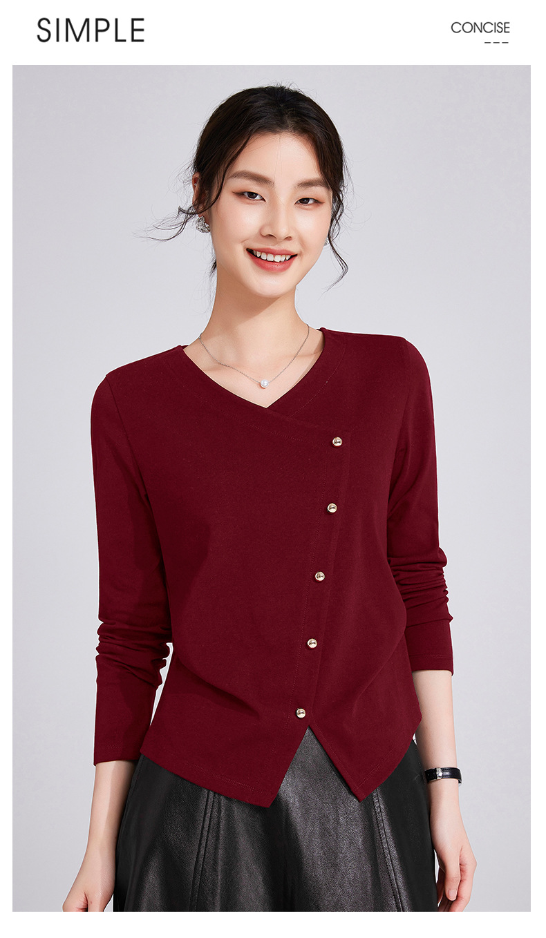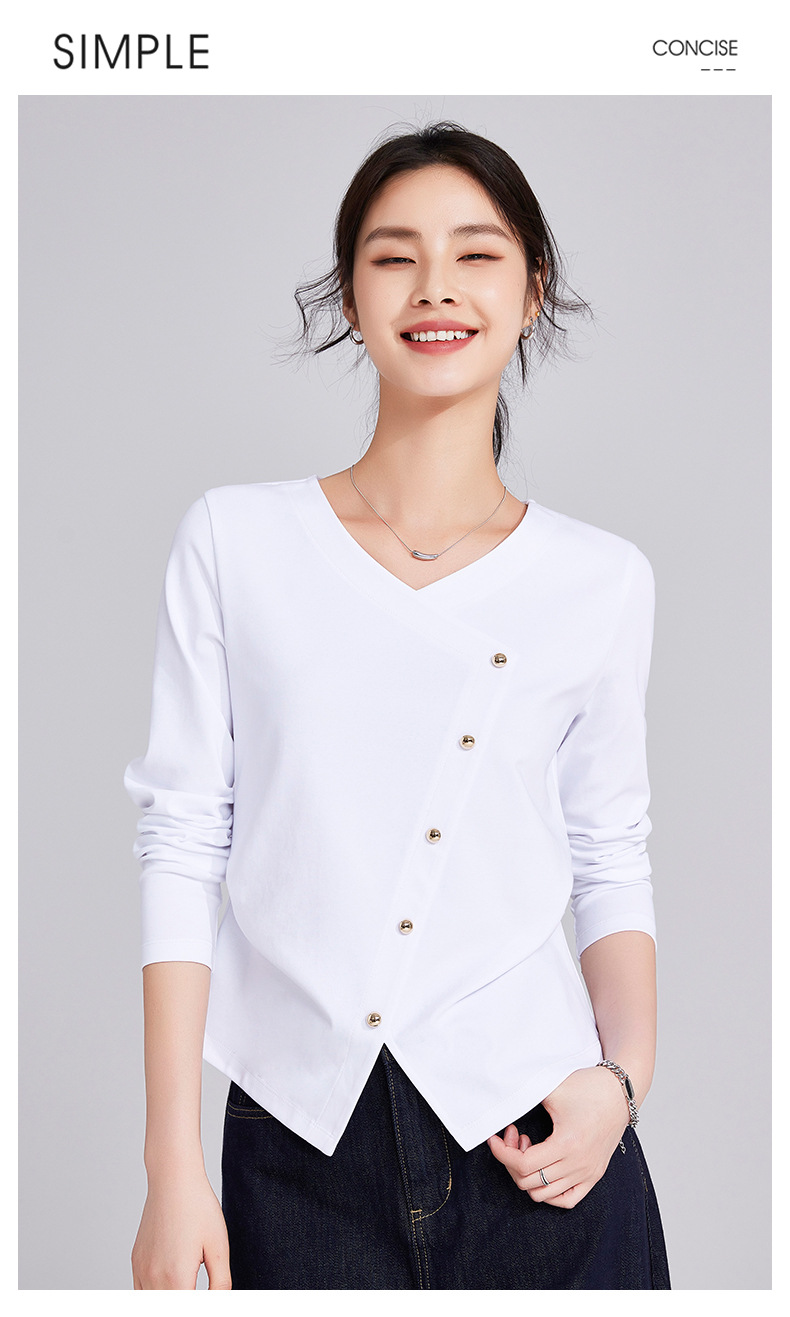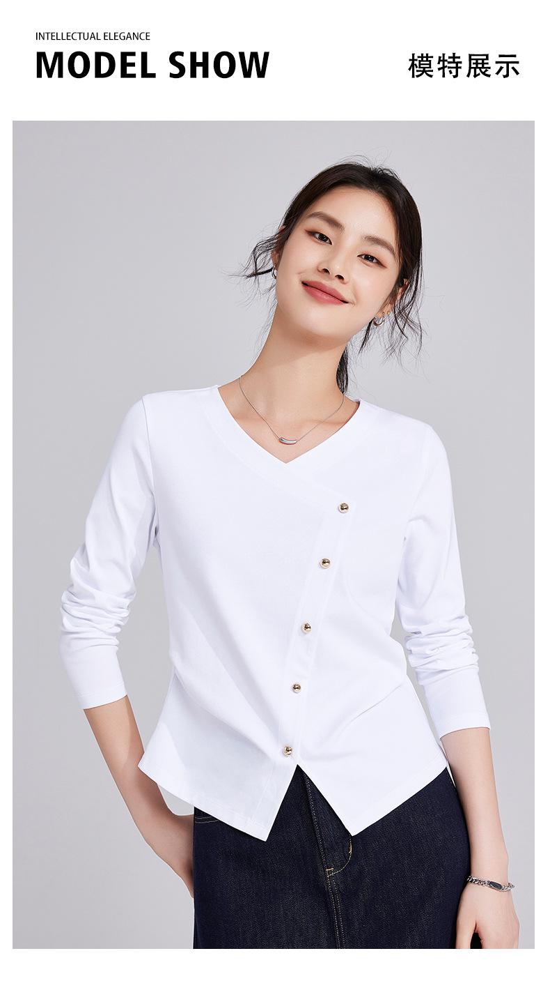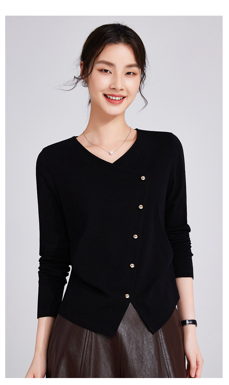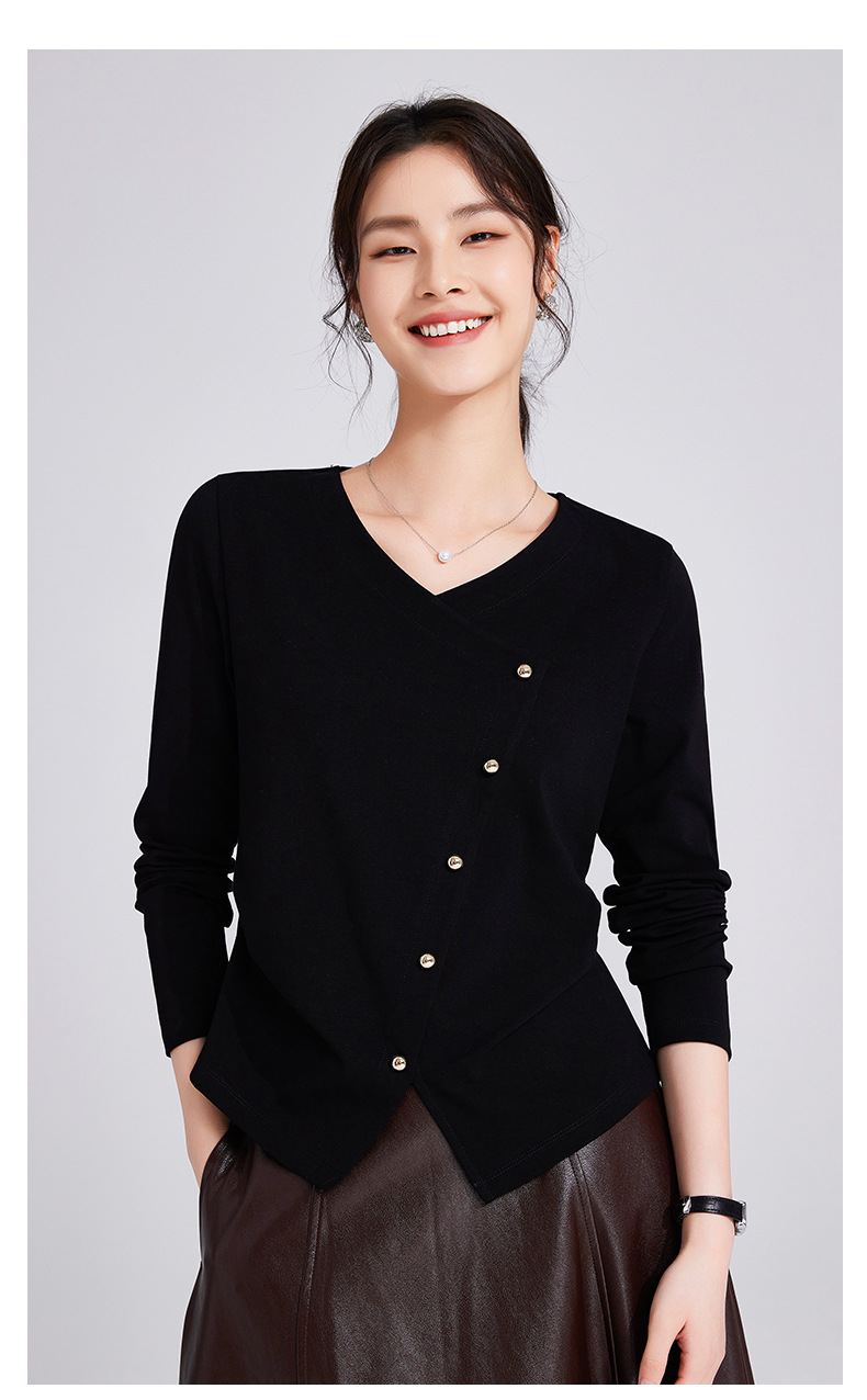 「自j」全新升级【铂金会员119/天猫159/差价40】(11136)洛诗琳新款设计感不规则纽扣上衣2025秋季V领正肩长袖T恤