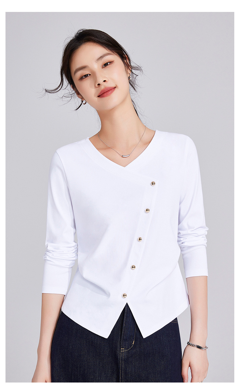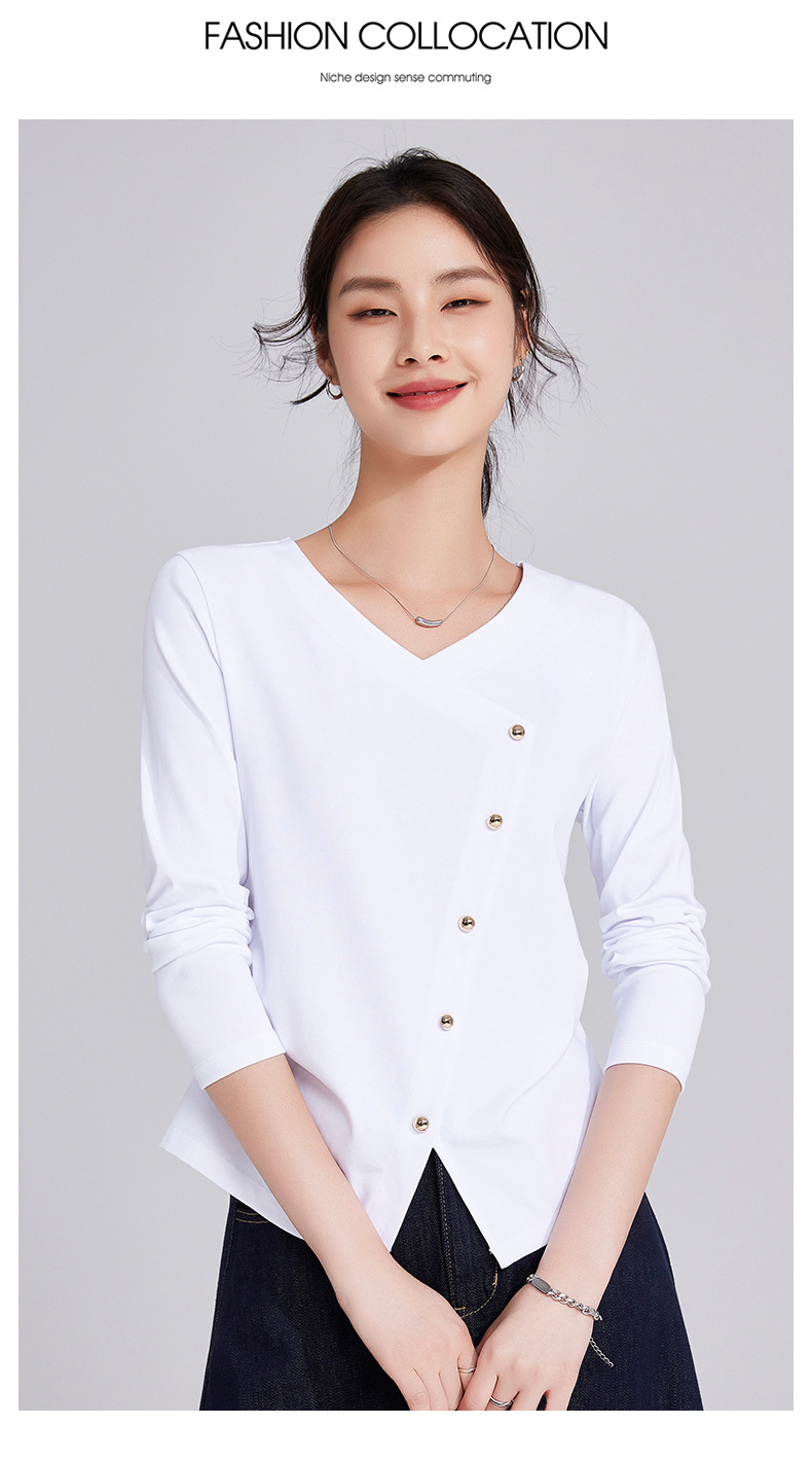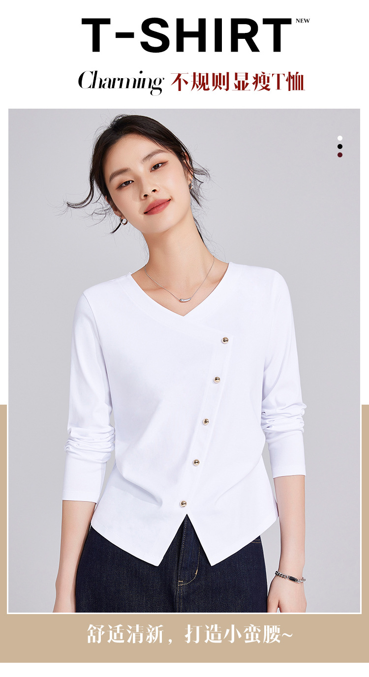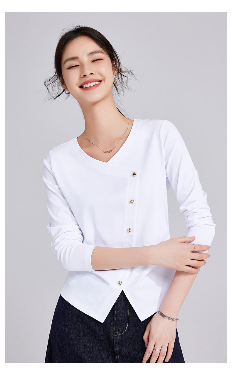 「自j」全新升级【铂金会员119/天猫159/差价40】(11136)洛诗琳新款设计感不规则纽扣上衣2025秋季V领正肩长袖T恤