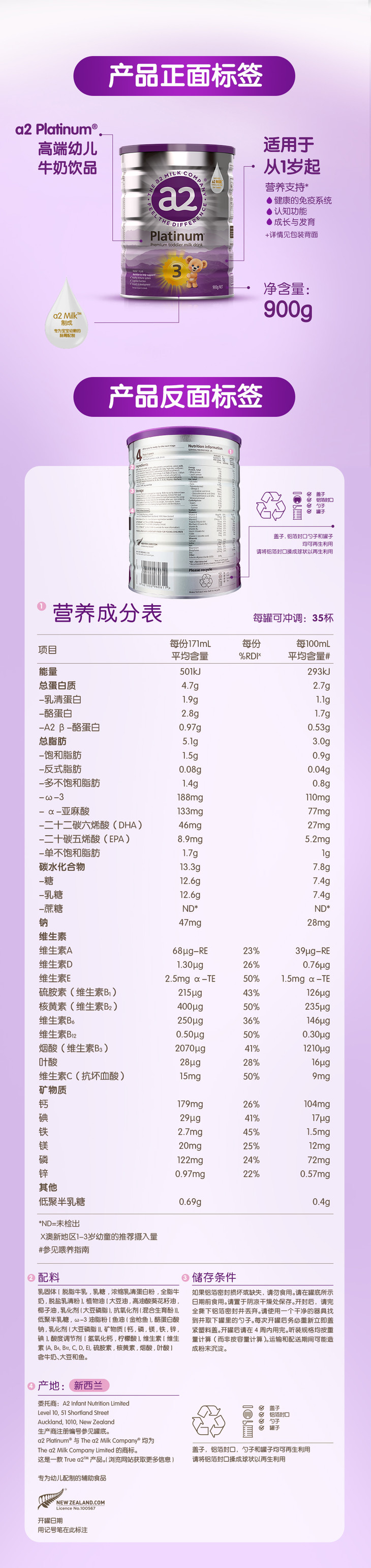 澳洲进口A2幼儿配方奶粉 含天然A2蛋白质 3段900g(1-3岁)