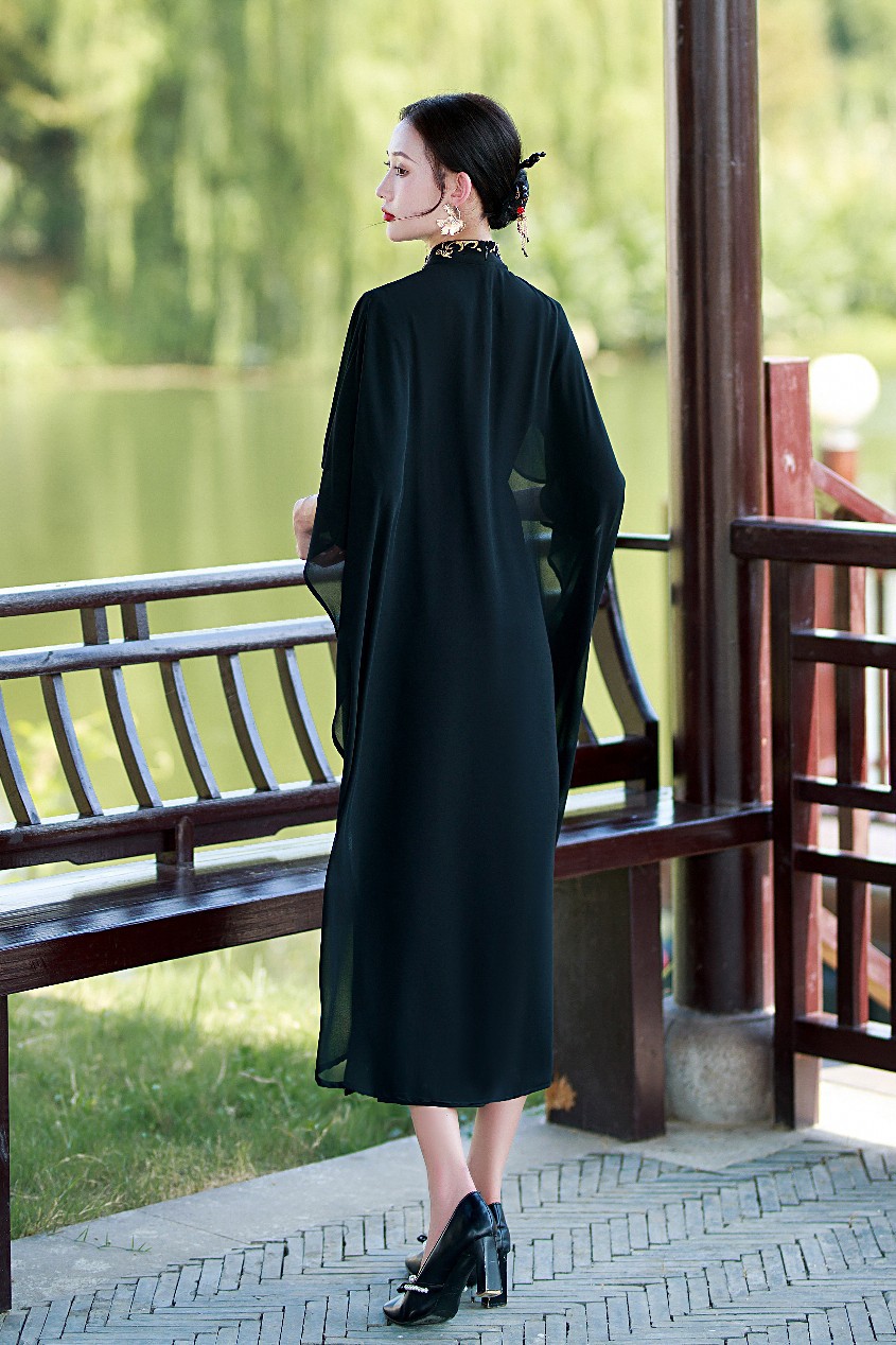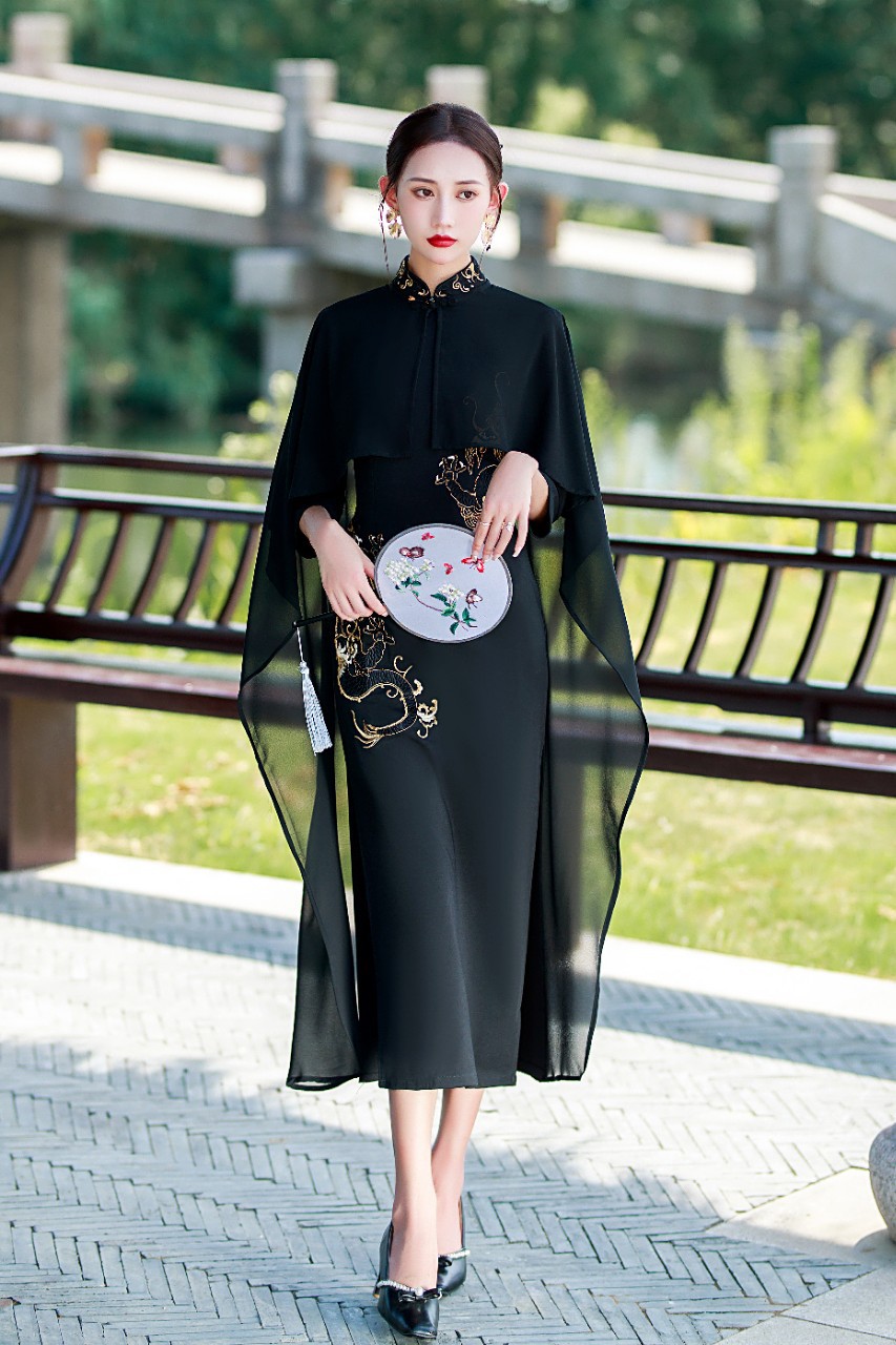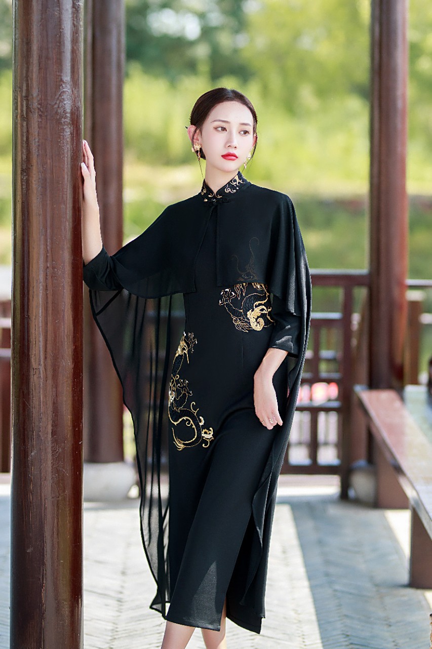 新款中国风罗马布绣花旗袍披肩两件套气质走秀QD1312
