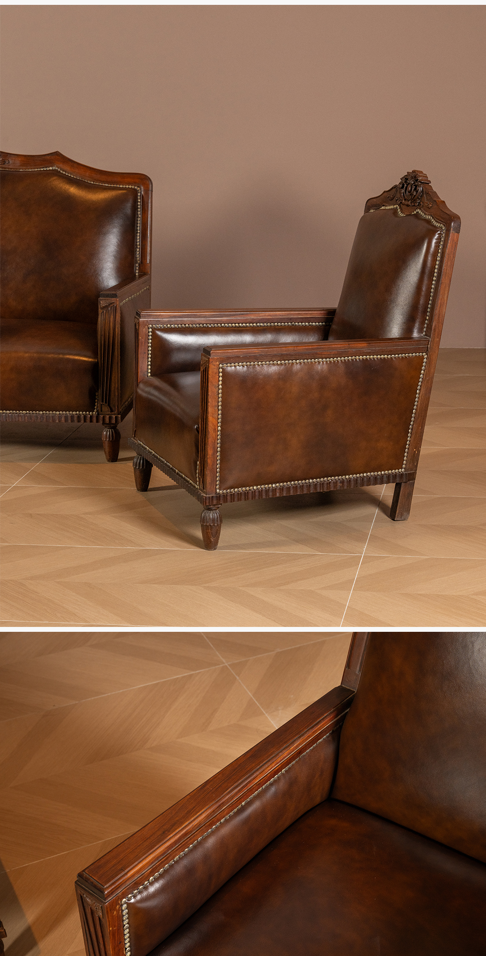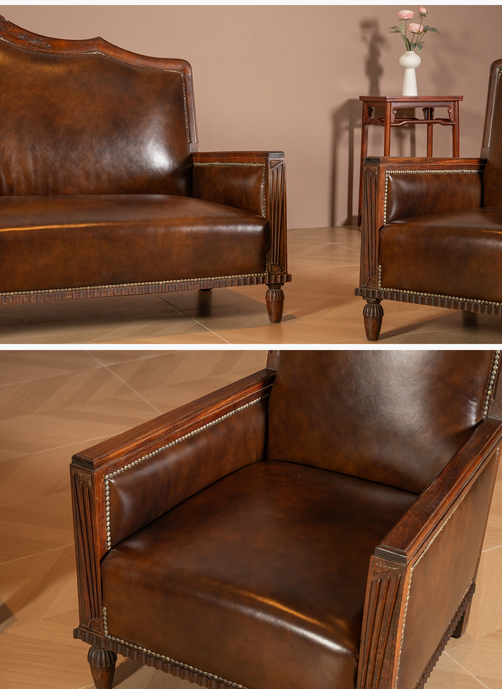 民国 红木海派皮面软包沙发成套(一套三件)