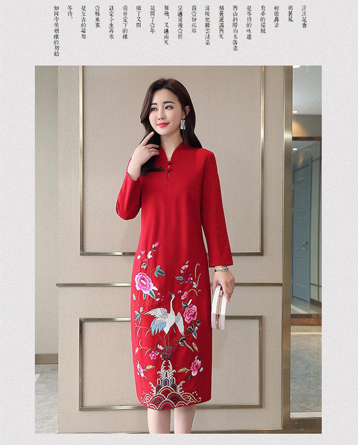 DY 4146 秋冬新款加厚花朵刺绣立领修身大摆连衣裙