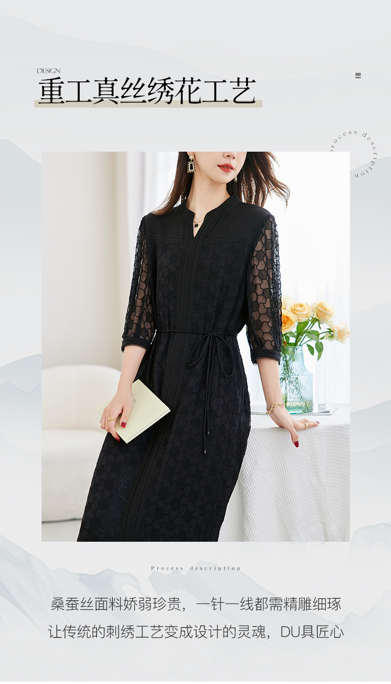 丁摩 原创100桑蚕丝绣花连衣裙女夏季7分袖显瘦气质中长裙6ZF-9578