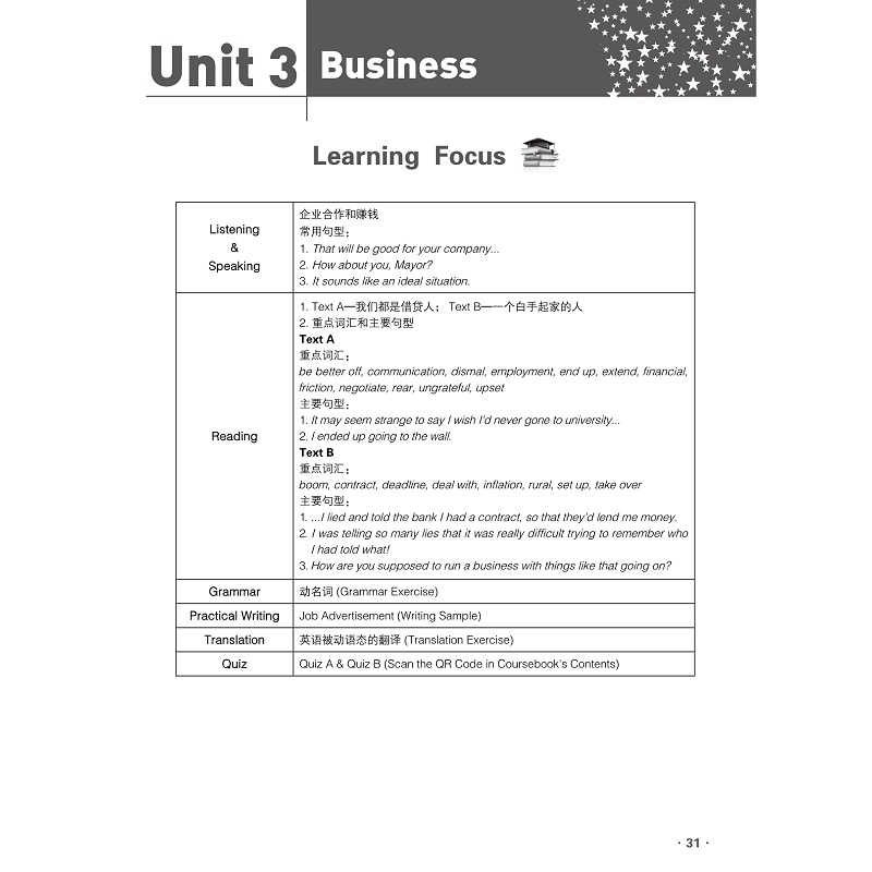 本系列教材将在原有蓝本(即《新编实用英语》)的基础上,借鉴美国圣智集团现有的资源(即Innovations系列教材),通过双方的共同努力,对内容进行合理取舍,将原教材修订成为适合国内学生使用的高职高专公共外语教材。新教材将延续原教材的教学模块,每个单元围绕一个主题展开听、说、读、写、译,并着重突出“听说”部分,旨在培养学生的语言综合应用能力,同时加强学生英语实际操作的训练与培养。