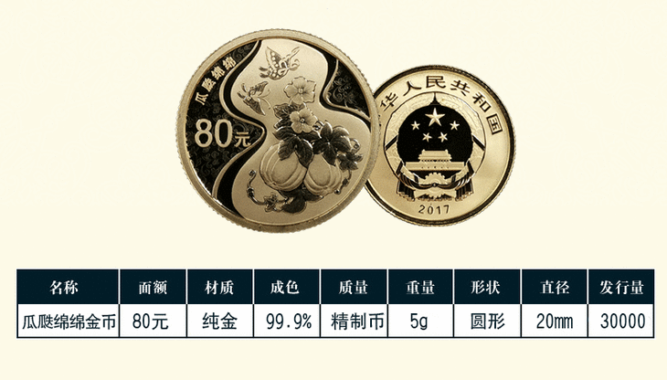 规格和发行量:5克圆形金质纪念币为精制币,含纯金5克,直径20毫米,面额80元,成色99.9%,最大发行量30000枚。