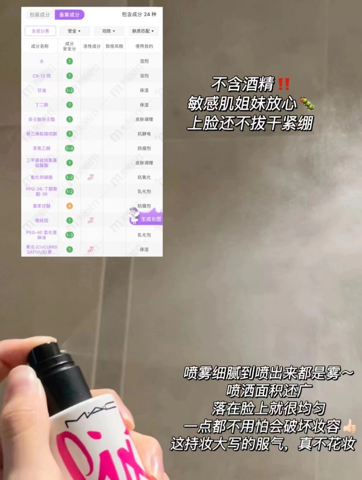 👑MAC魅可定妆喷雾100ml(紫喷) 👍定妆喷雾【大魔王】 💫喷头新升级:【超细腻的广角头】覆盖面积很广,非常细腻 🙌水雾状而不是水柱,成膜速度很快,喷后【防水防汗防蹭】 👏无酒精成膜配方,还又多种护肤成分(VE、B5)等 ✅既能保湿修护,还能防止底妆氧化,不卡粉不暗沉 💪肤质敏感,都不担心!