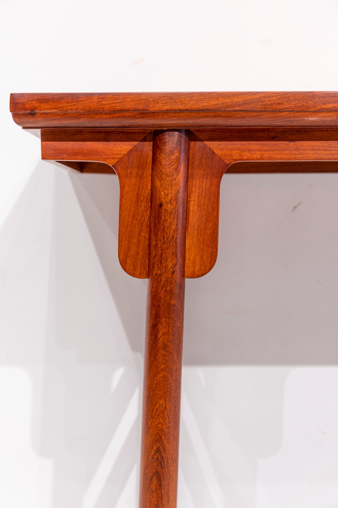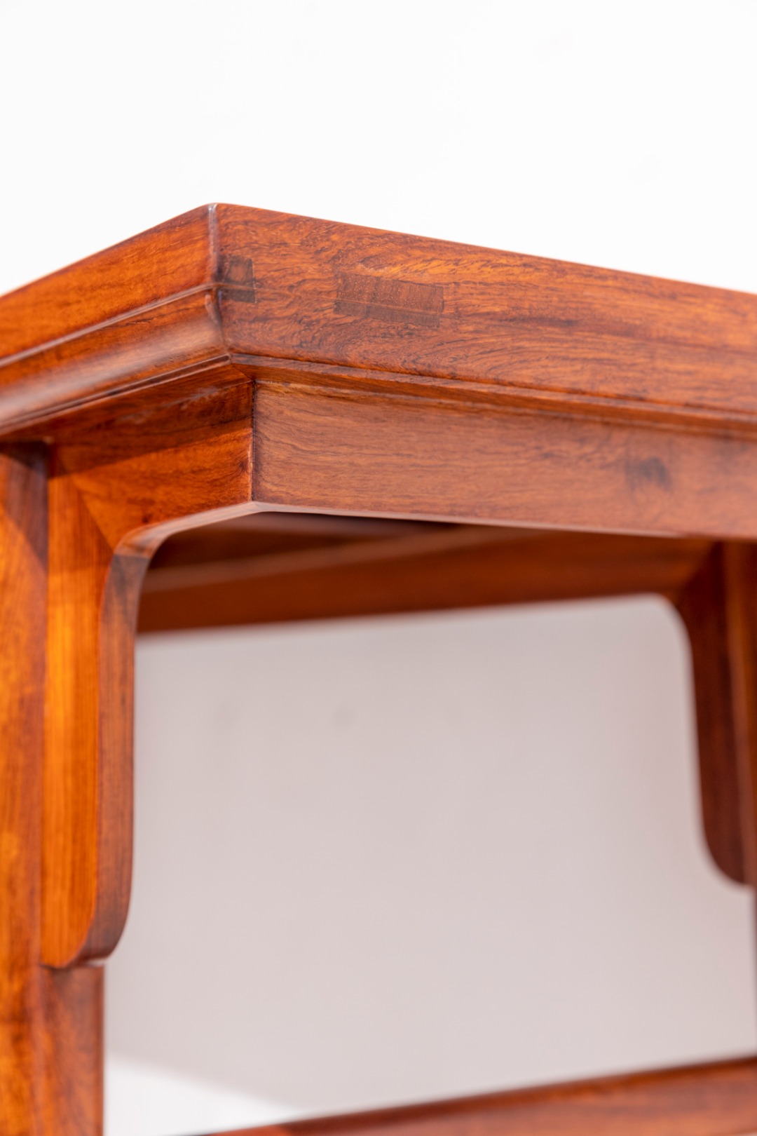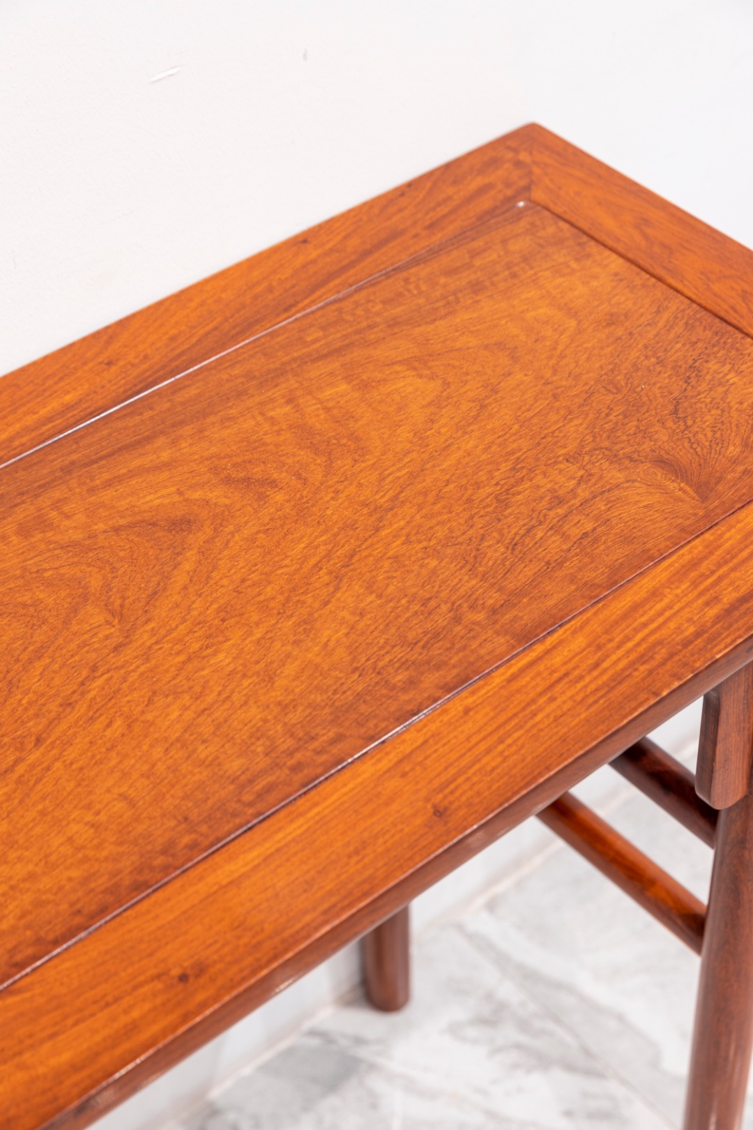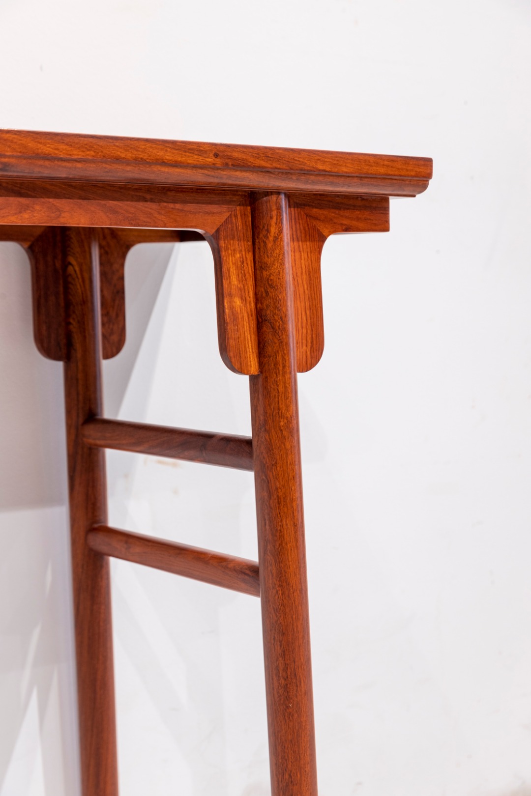 此款精仿的刀牙平头案四圆柱腿,带明显的侧脚收分,全身除冰盘沿线脚略带造型,其余皆无纹,连牙板牙条也不似平常延边缘起阳线,而是任其光素,将明式的简练质朴表现的淋漓尽致,整体造型美观大方,极具稳定感,且周身光素无雕饰,体现了明式家具十六品中的简练、朴素之美。