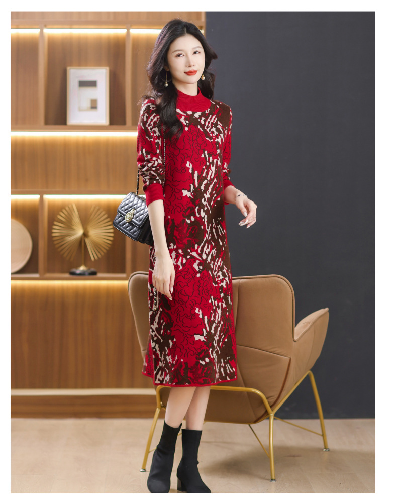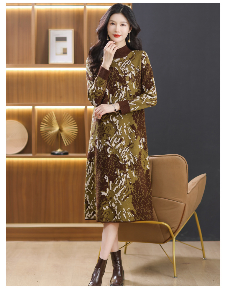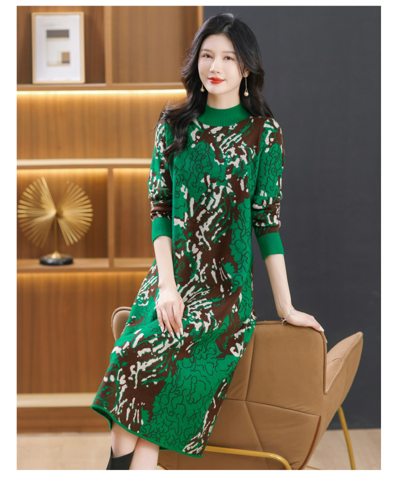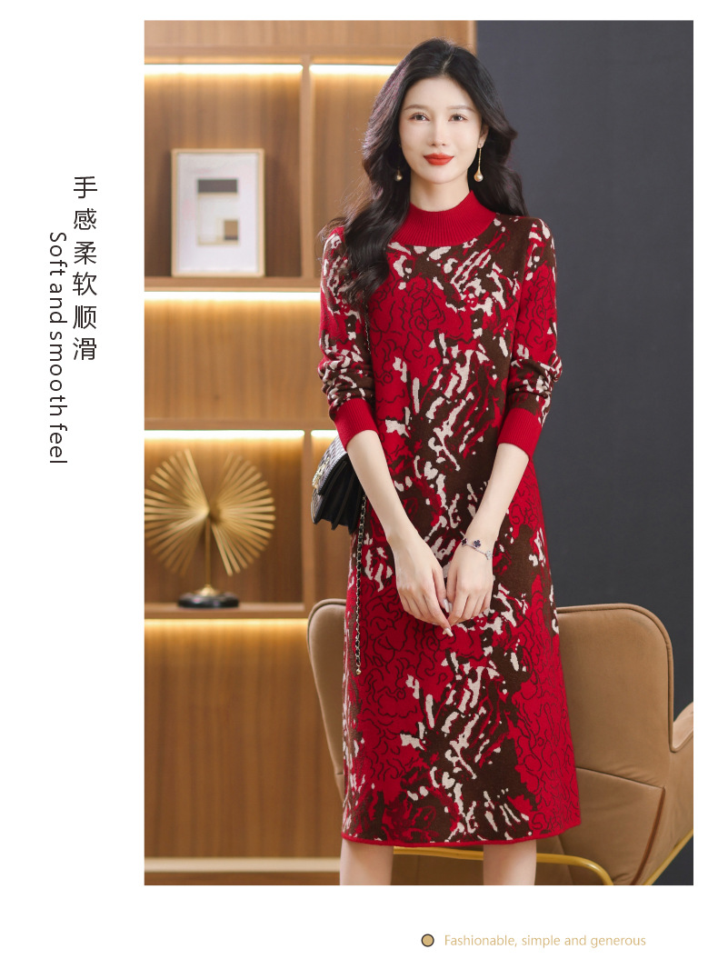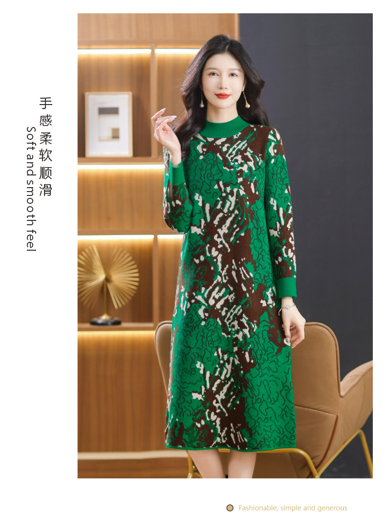 冬季新款毛衣裙,宽松时尚提花半高领加厚过膝长裙针织连衣裙CC-103-7766