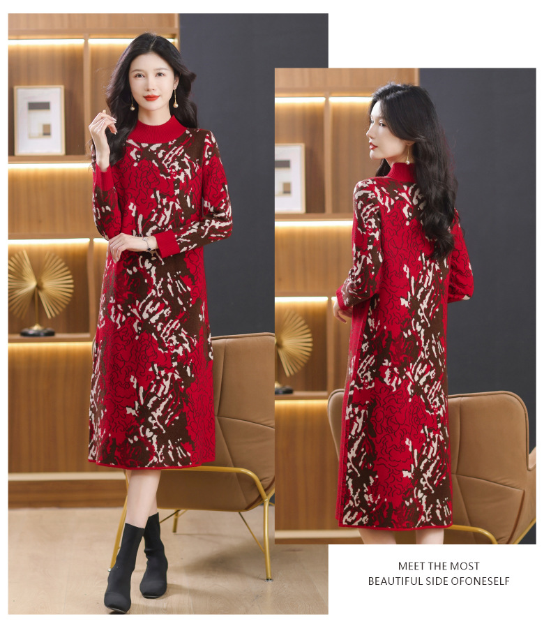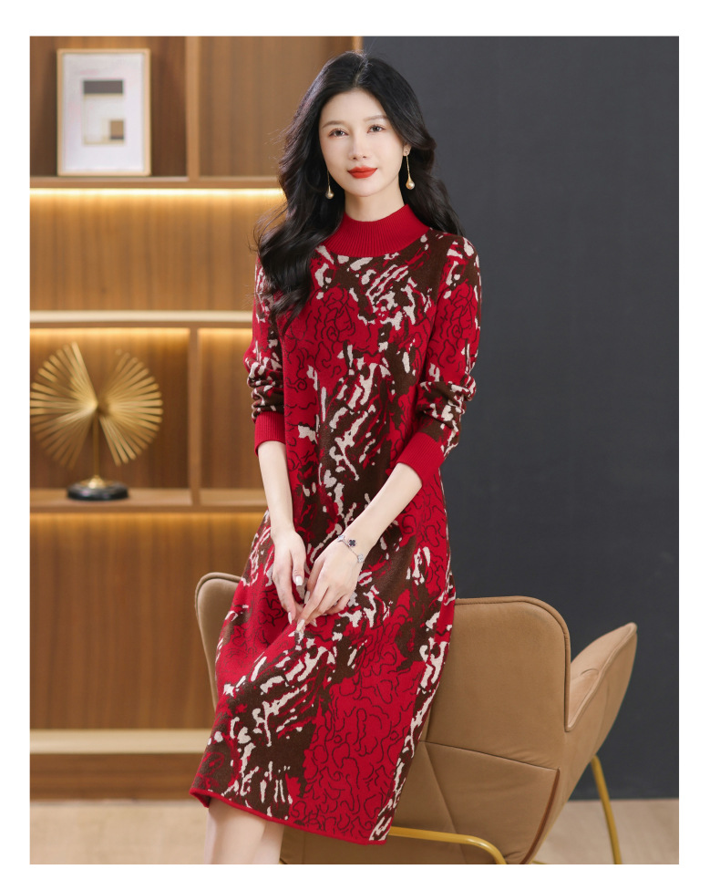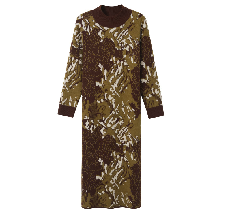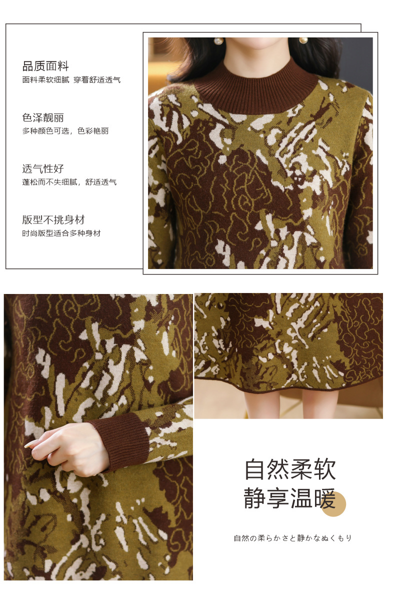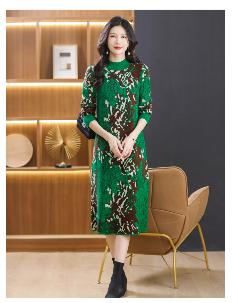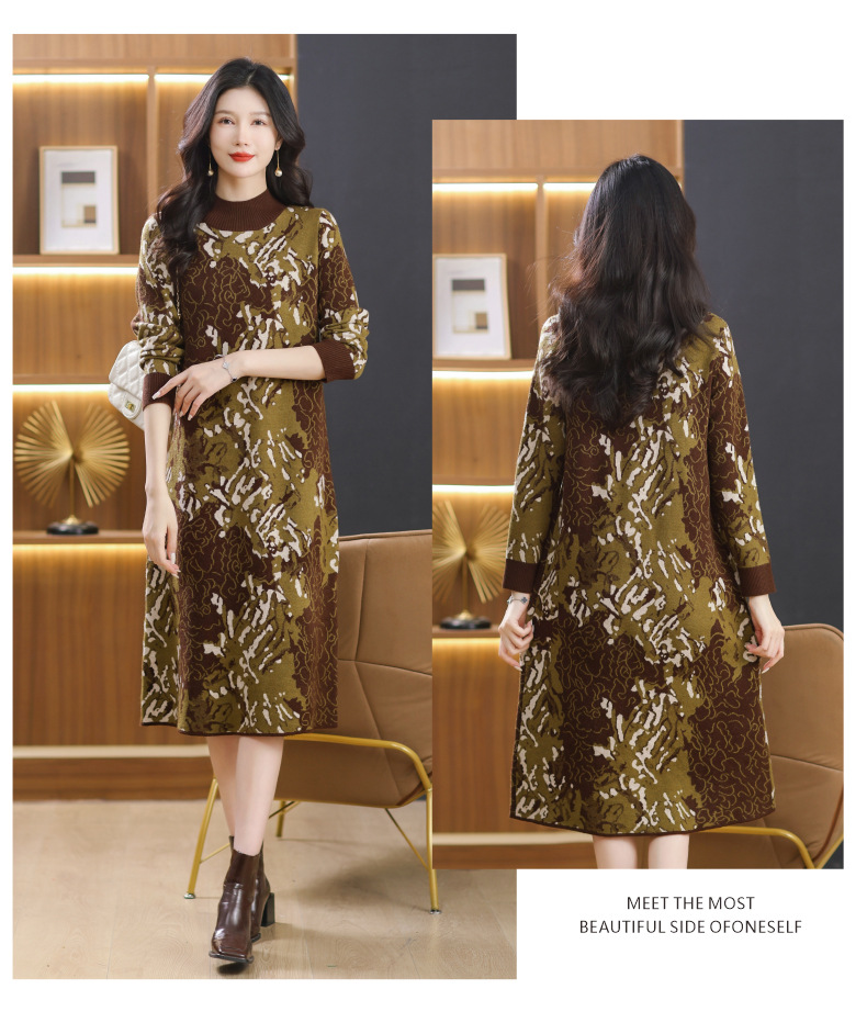 冬季新款毛衣裙,宽松时尚提花半高领加厚过膝长裙针织连衣裙CC-103-7766