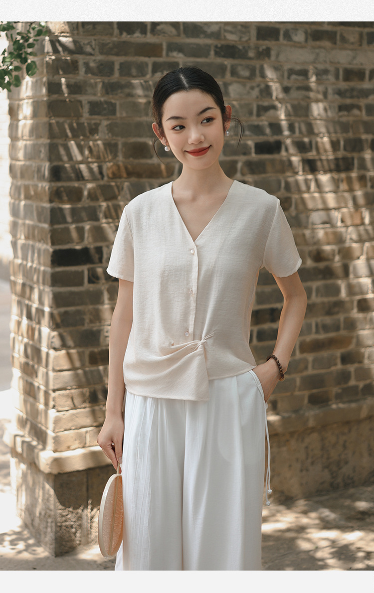 雀说棉麻女装新款亚麻短袖衬衫女高级感气质轻薄新中式盘扣上衣AL6524