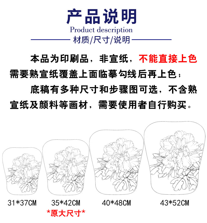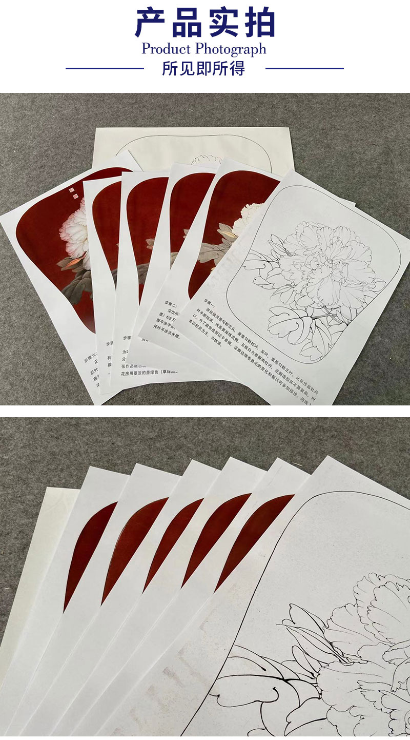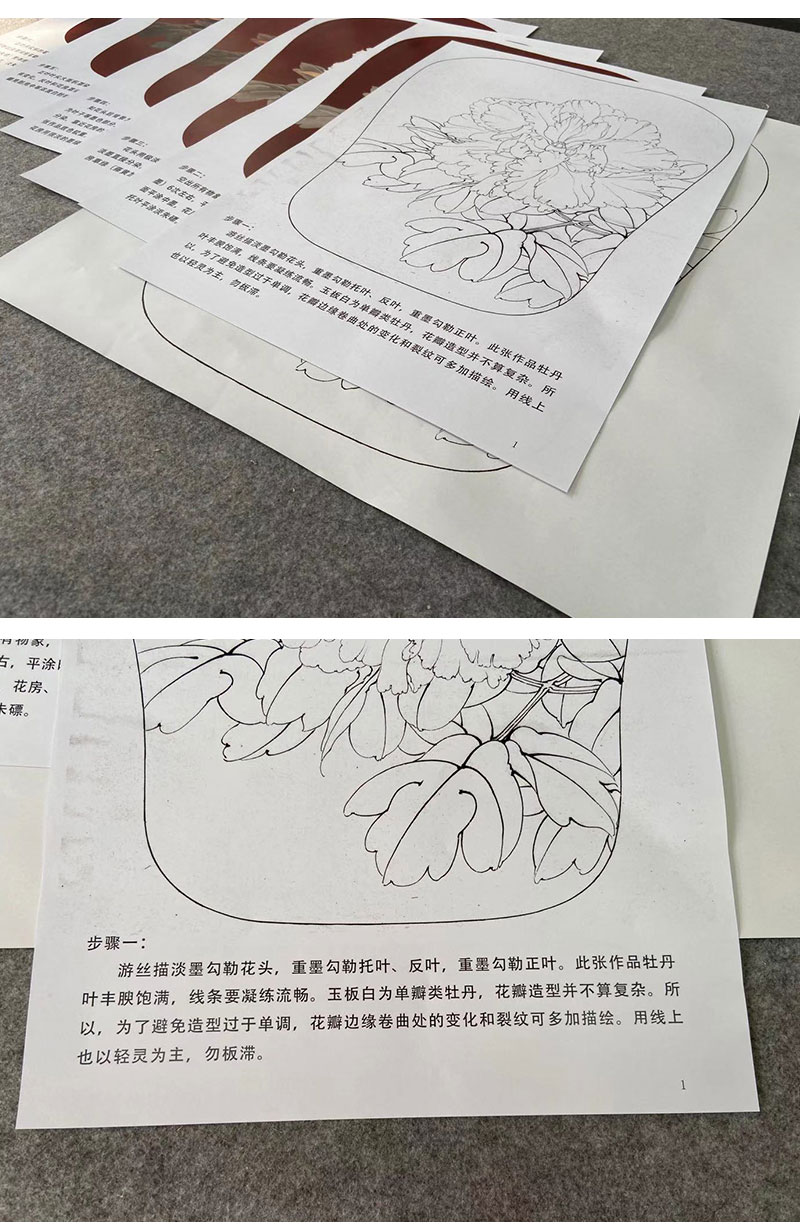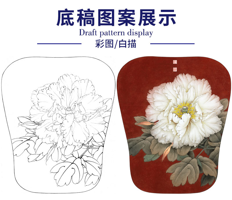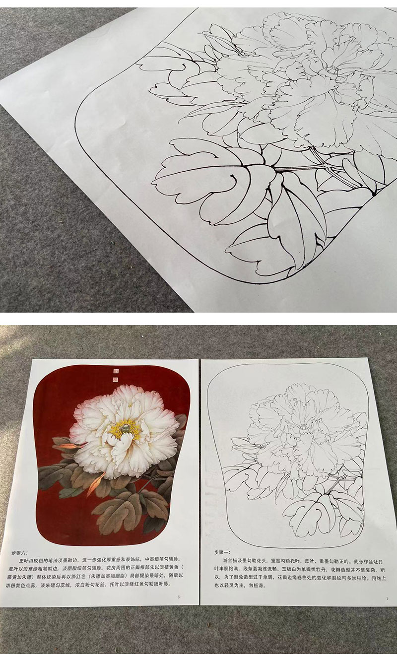 【有步骤、大彩图】李晓明工笔画白描底稿宫扇小品《玉板白》牡丹初学者临摹花鸟线稿KD10