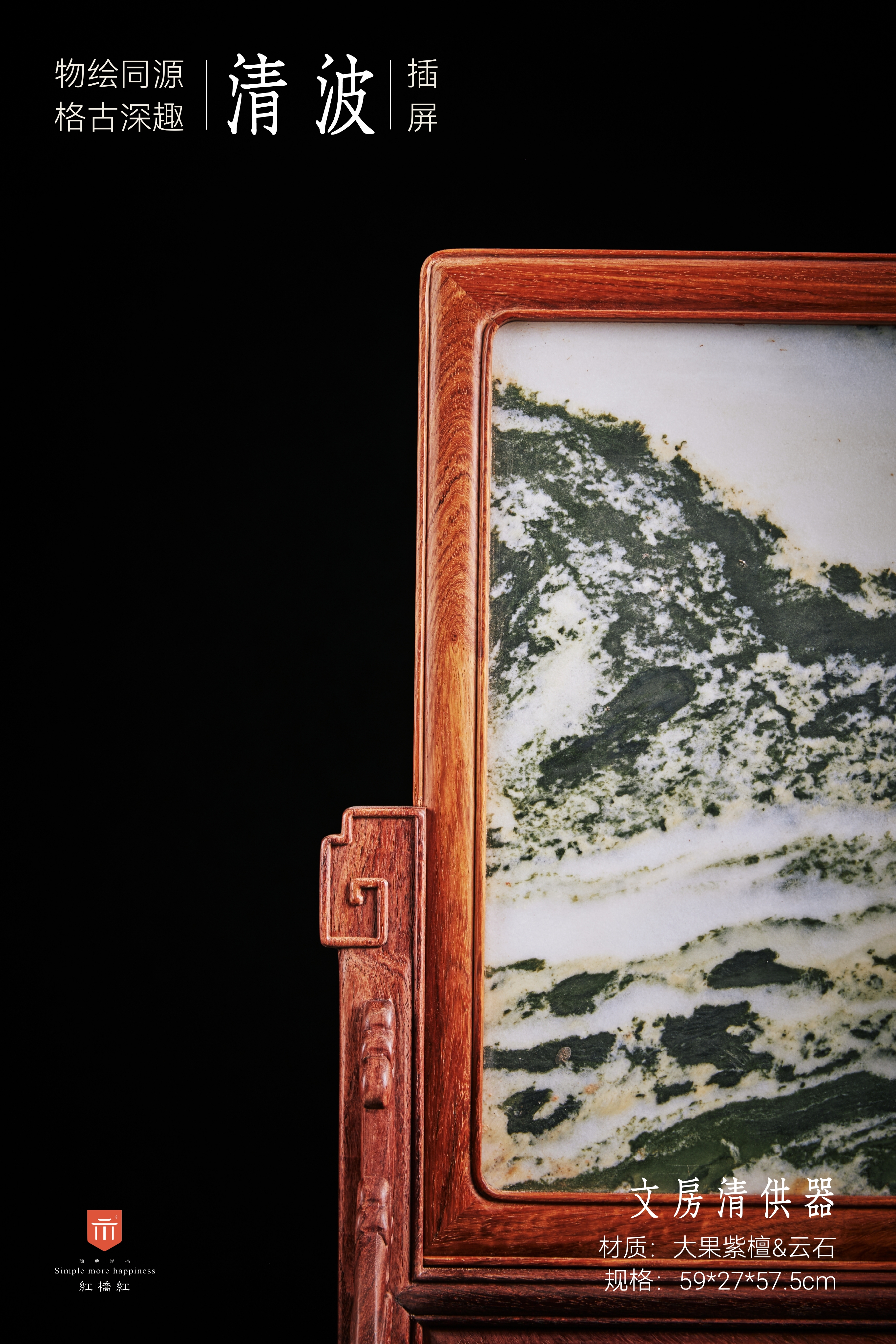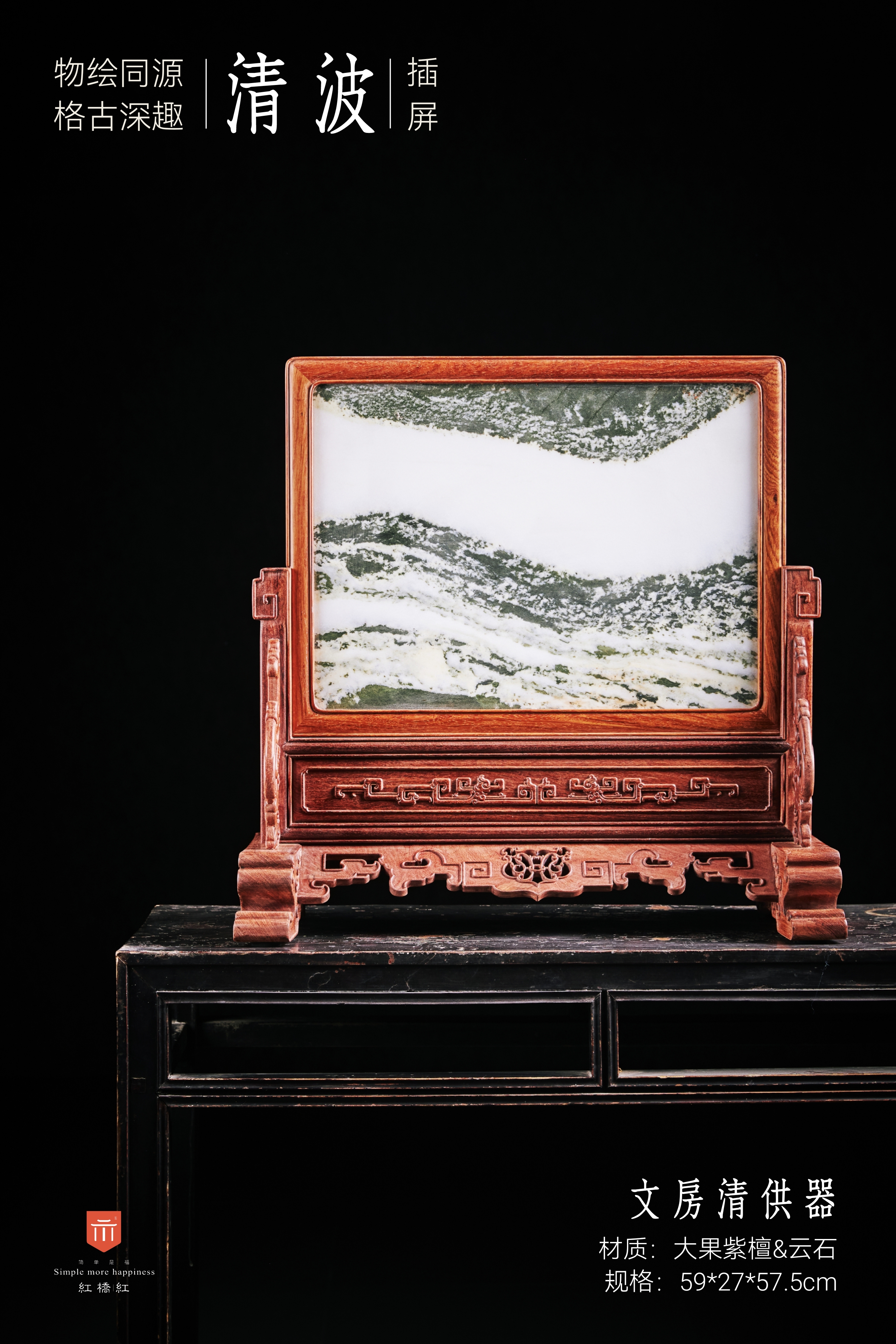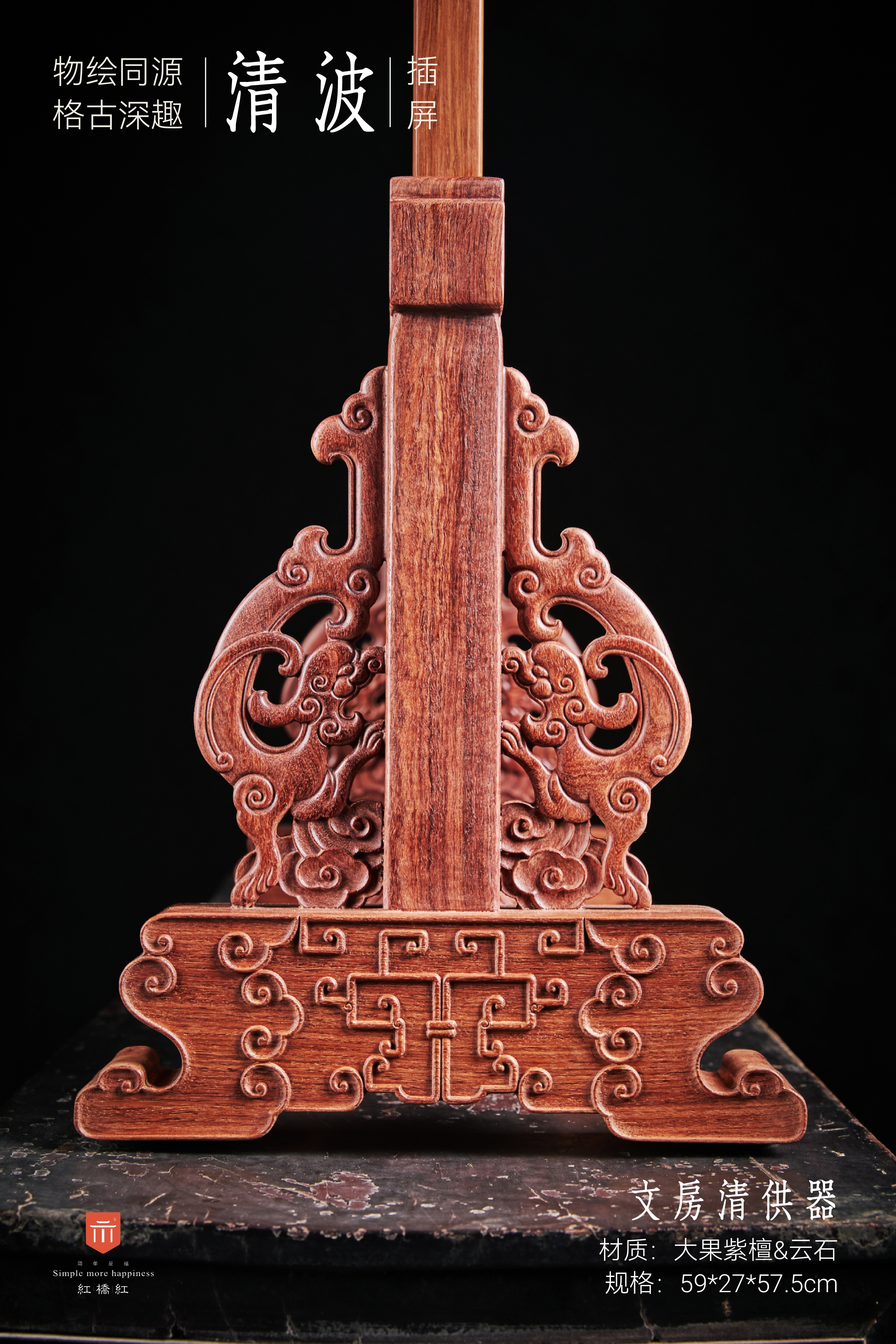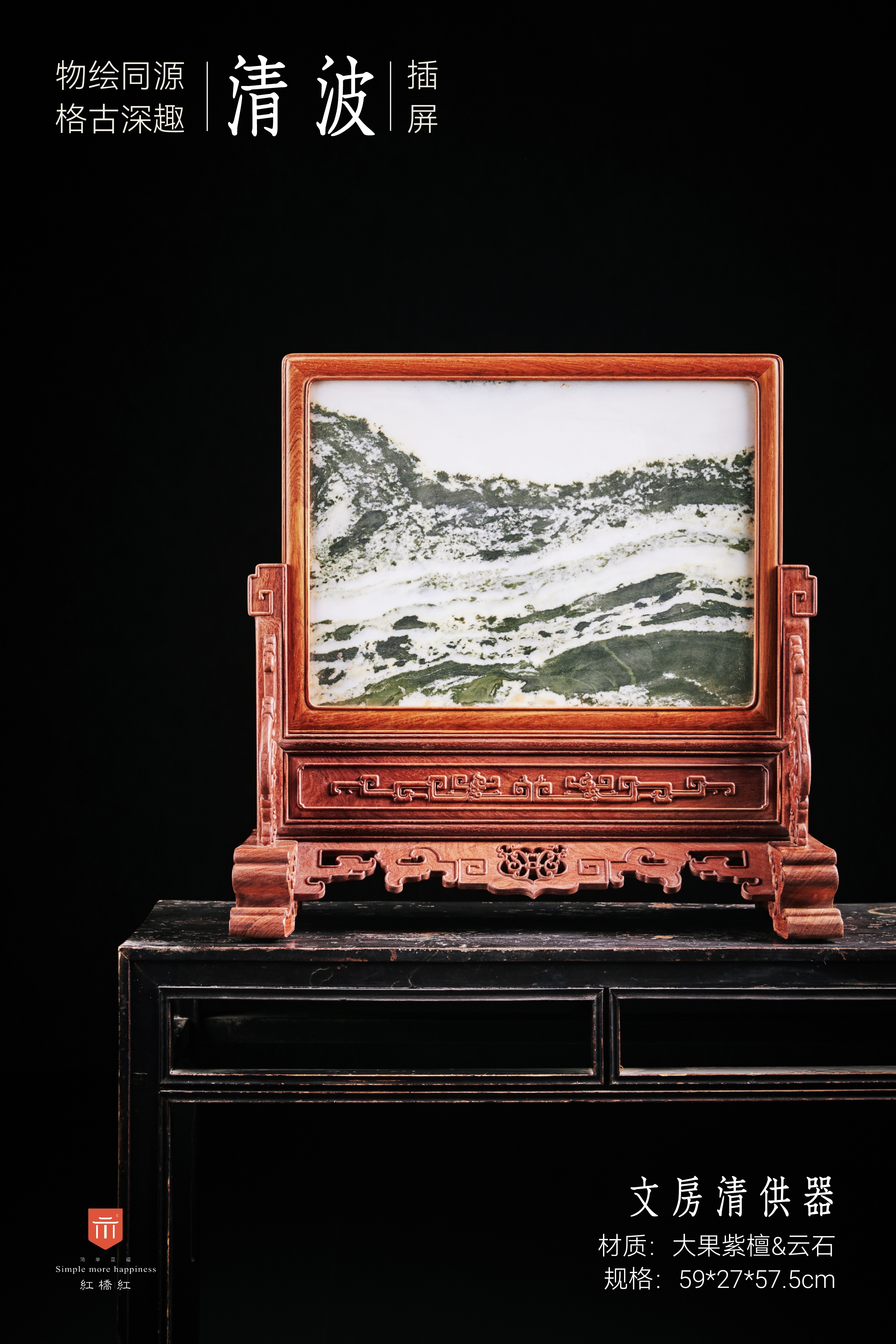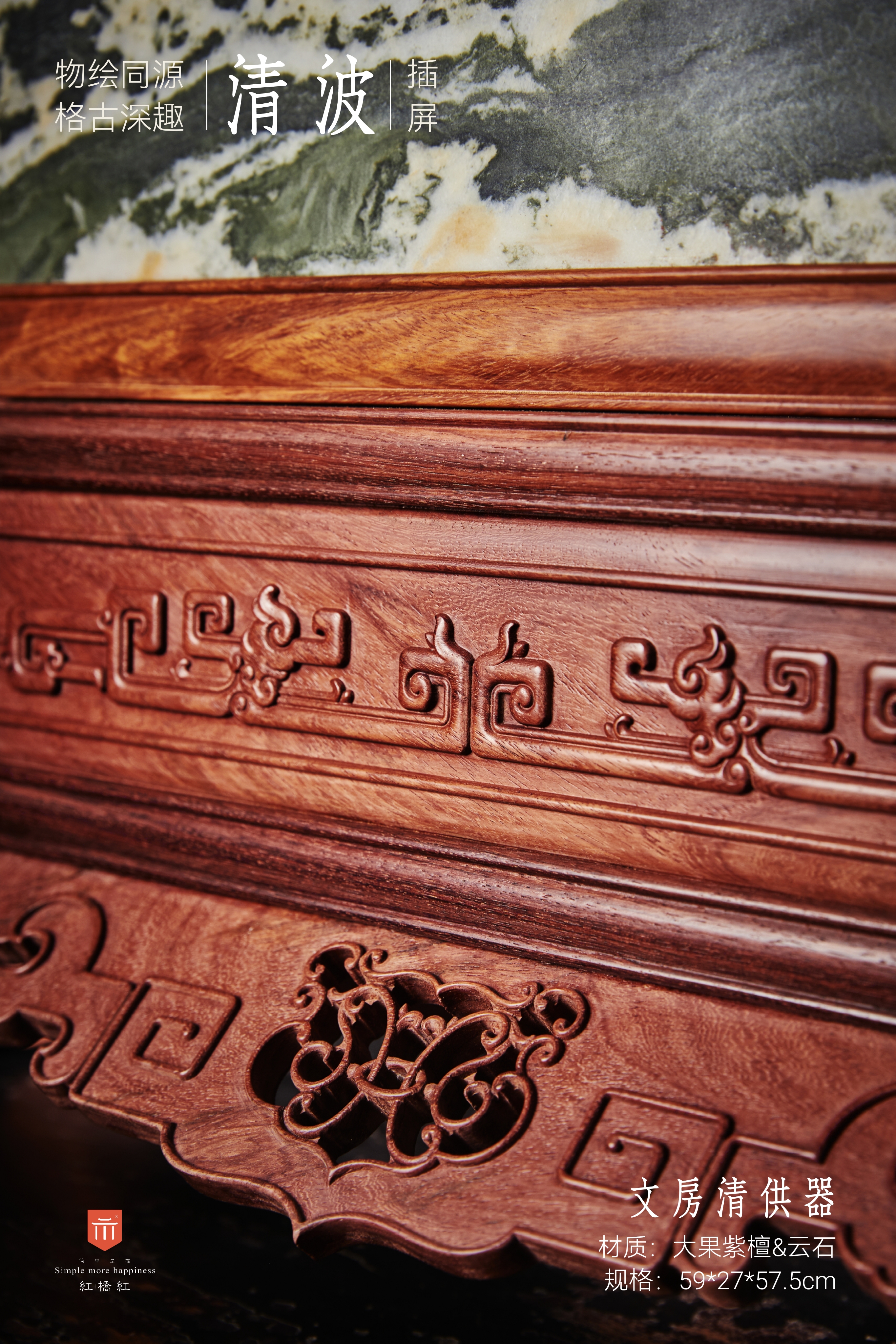 此件插屏应放于桌案上使用。屏心四边格角攒框做方,中部镶云石面心;云石为大自然天工造物,白质黑章,每必独一;有人物山水草木禽鱼之状,木石结合崇古尚雅。以雕卷草纹的宽厚木墩为底座,墩子上植立柱,两边抵夹透雕螭龙纹的站牙。墩柱间石板下装绦环板,铲地浮雕拐子龙纹;下安披水牙子,中部镂雕卷草纹,两侧翻出变体拐子纹,沿边起阳线,细节考究。整体纹饰高古,风格雄浑大气。