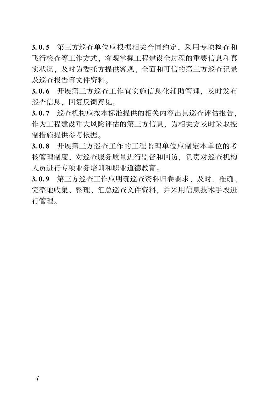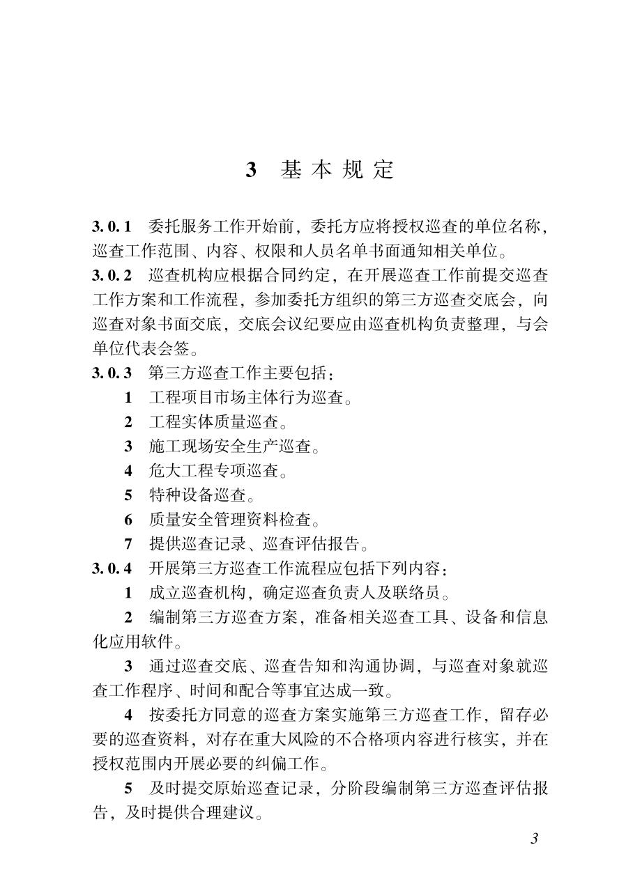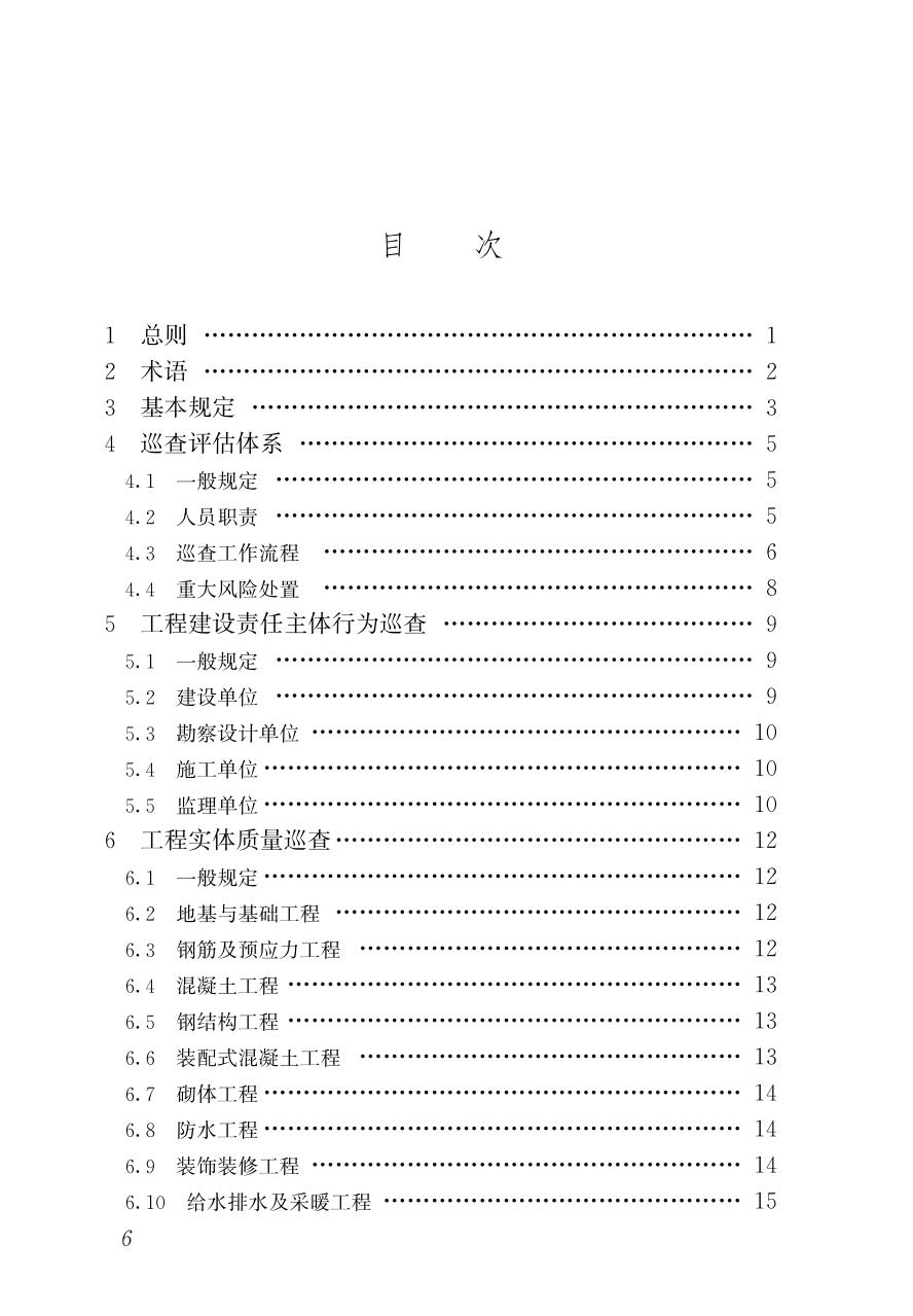 1 总则 2 术语 3 基本规定 4 巡查评估体系 5 工程建设责任主体行为巡查 6 工程实体质量巡查 7 现场安全生产巡查 8 质量文件资料巡查 9 安全文件资料巡查 附录A 第三方巡查告知书 附录B 第三方巡查工作交底单 附录C 第三方巡查记录单 附录D 第三方巡查问题整改通知单 附录E 第三方巡查问题整改回复单 附录F 第三方巡查工作台账