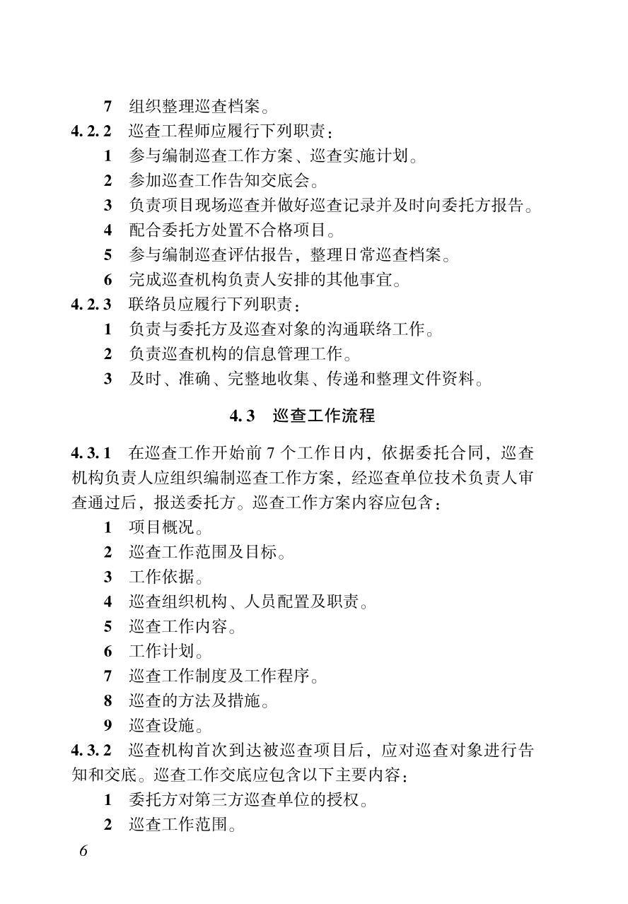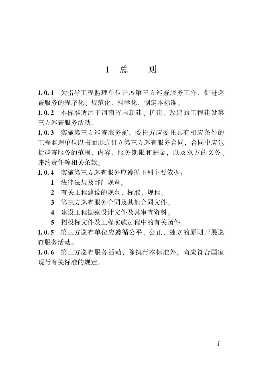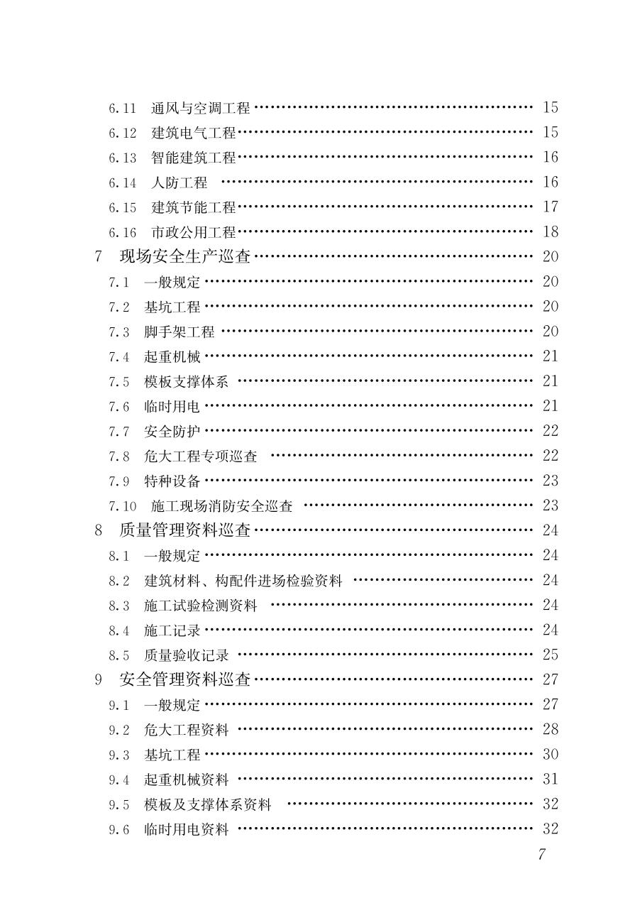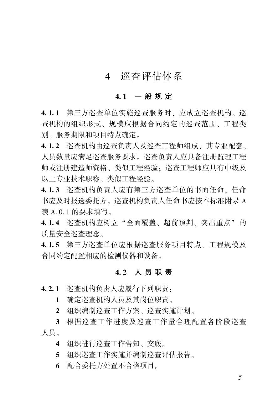 1 总则 2 术语 3 基本规定 4 巡查评估体系 5 工程建设责任主体行为巡查 6 工程实体质量巡查 7 现场安全生产巡查 8 质量文件资料巡查 9 安全文件资料巡查 附录A 第三方巡查告知书 附录B 第三方巡查工作交底单 附录C 第三方巡查记录单 附录D 第三方巡查问题整改通知单 附录E 第三方巡查问题整改回复单 附录F 第三方巡查工作台账