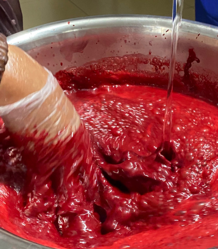 制作猪血首先要在新鲜的猪血里加入藏青盐、饮用水并不断搅拌,使其凝固,切块后煮熟。